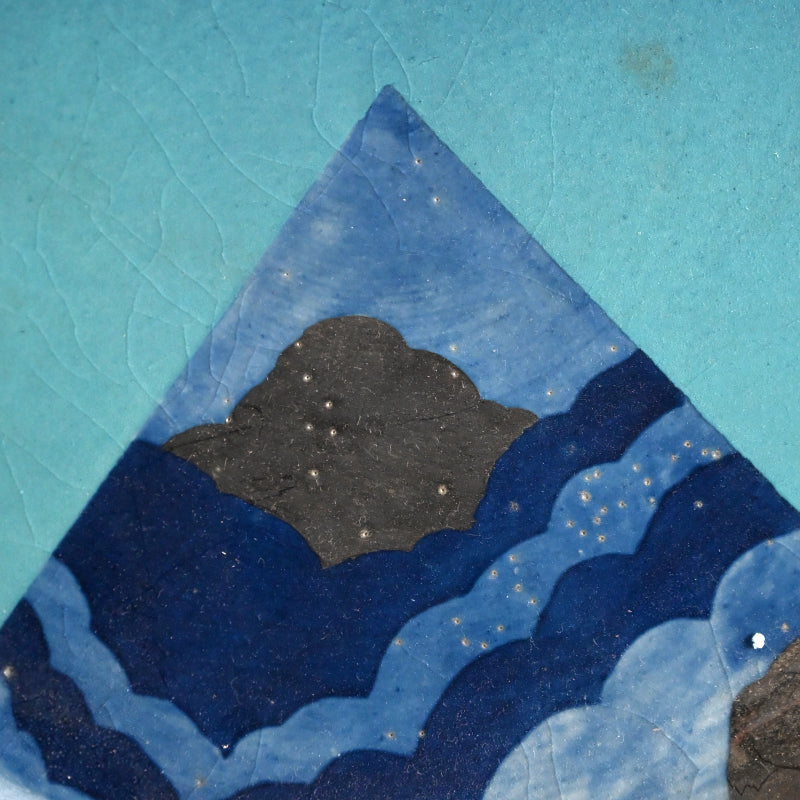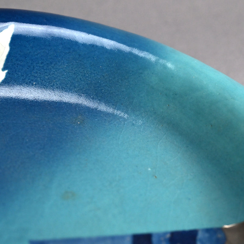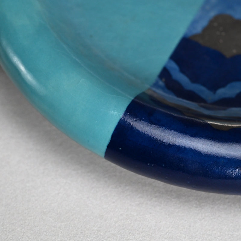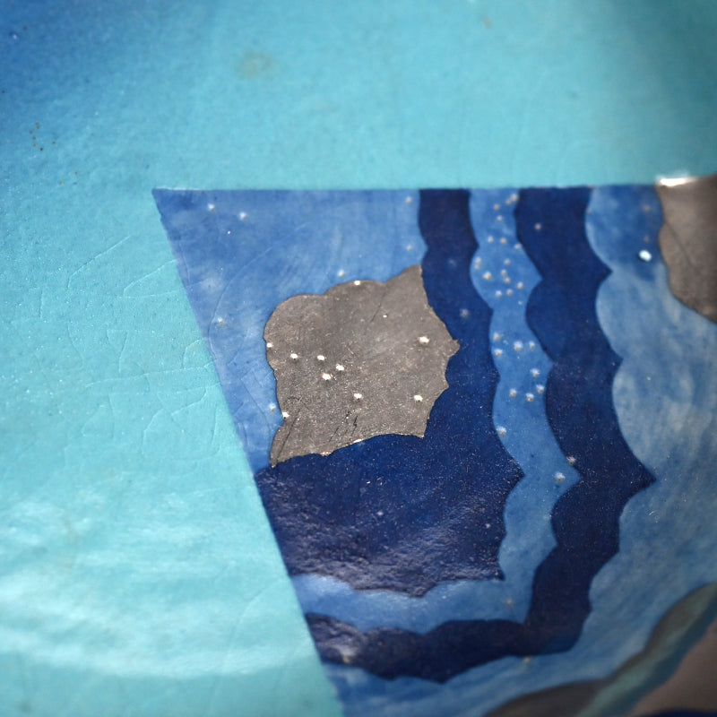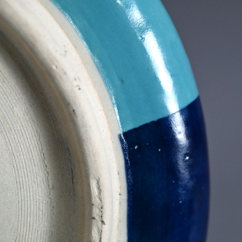 Clouds pass through the blue summer sky on this ceramic basin by Kyoto legend Yanagihara Mutsuo in his telltale colorful pallete enclosed in the original signed wooden box titled Hensaifu and dated 1978. It is 25 cm (10 inches) diameter, 6 cm (2-1/4 inches) tall and in excellent condition.