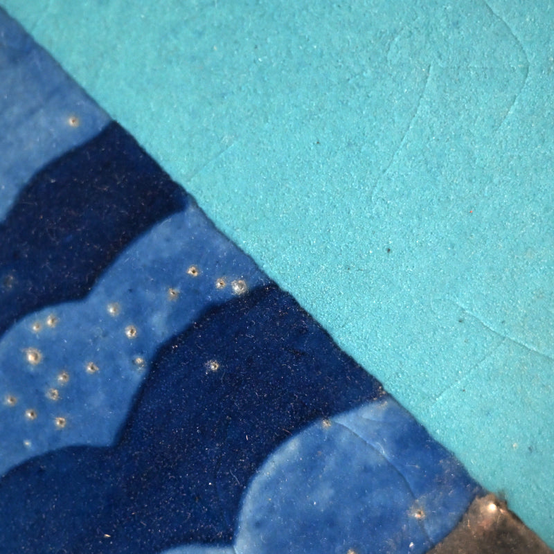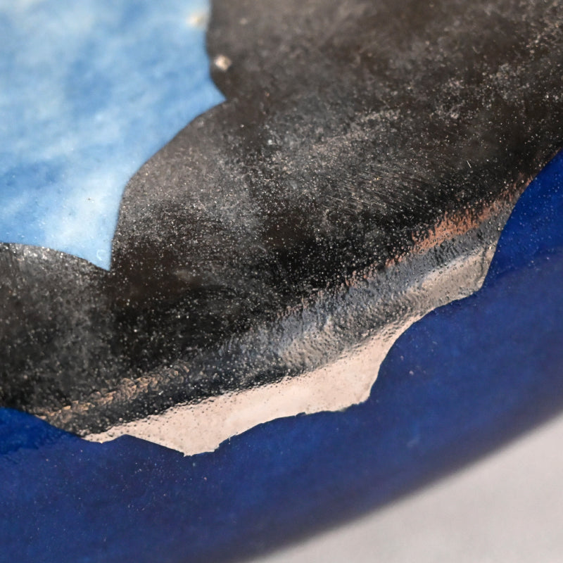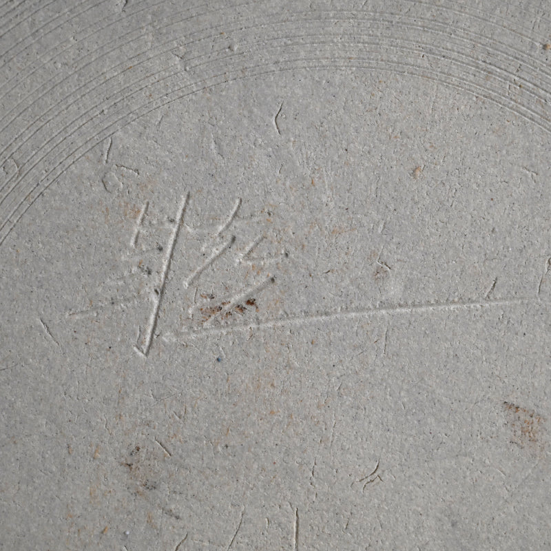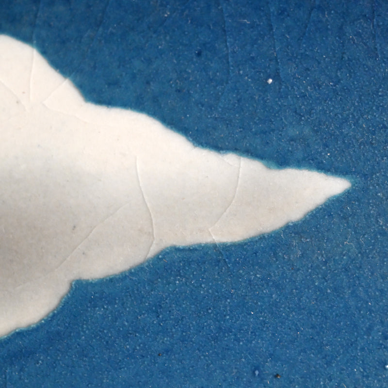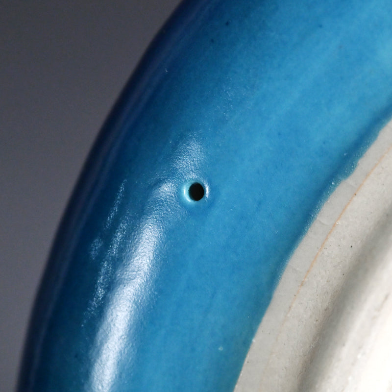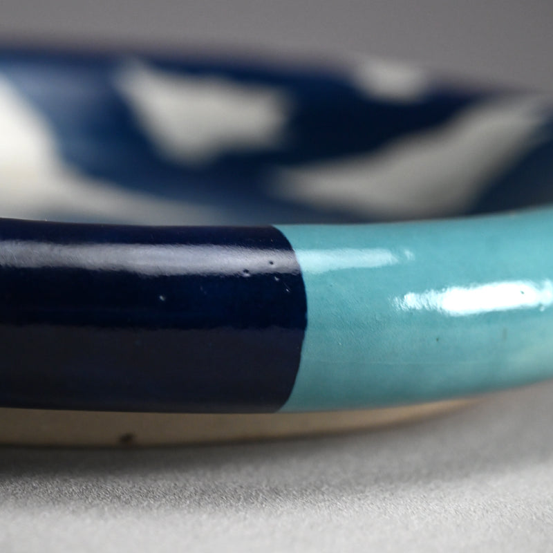 Clouds pass through the blue summer sky on this ceramic basin by Kyoto legend Yanagihara Mutsuo in his telltale colorful pallete enclosed in the original signed wooden box titled Hensaifu and dated 1978. It is 25 cm (10 inches) diameter, 6 cm (2-1/4 inches) tall and in excellent condition.