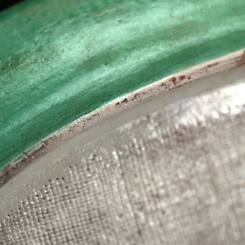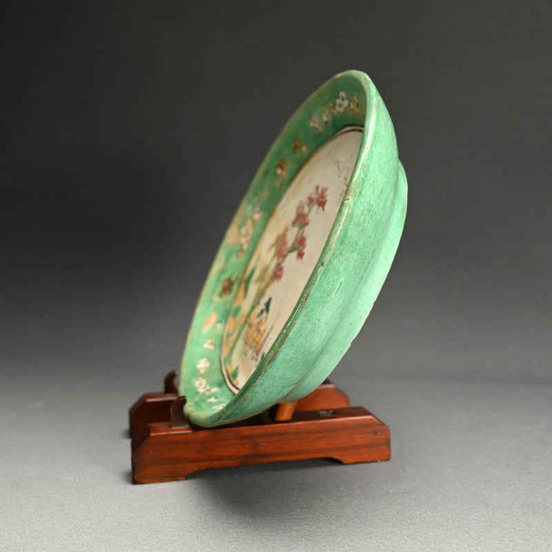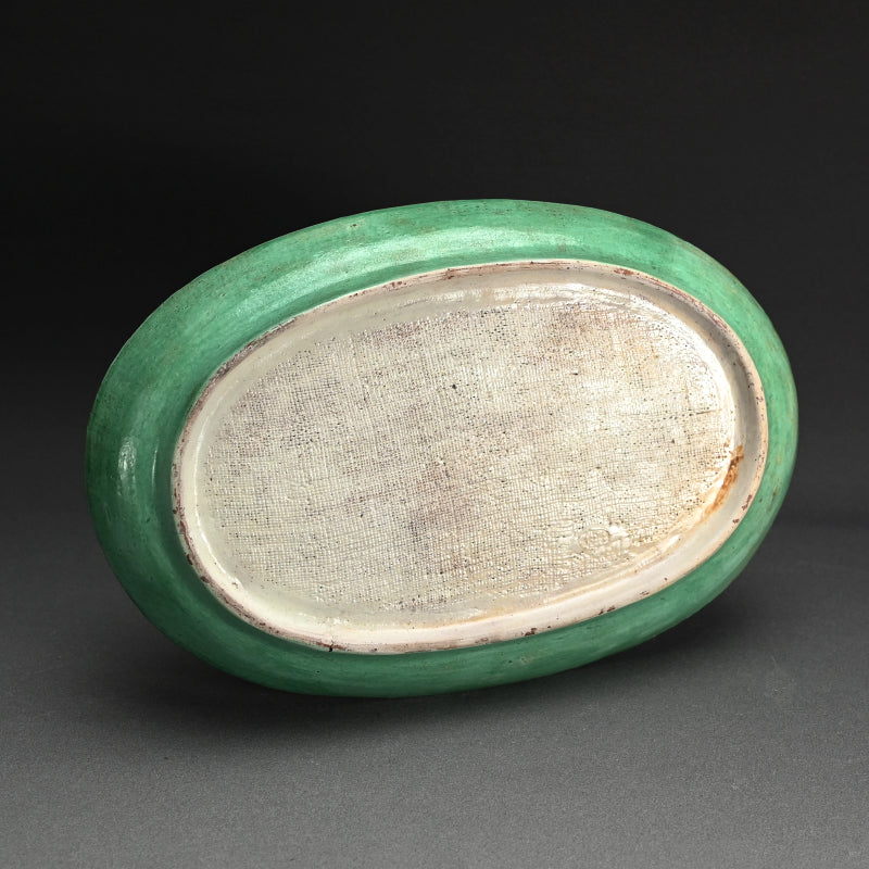 A heavily formed later Edo period plate decorated with green, yellow and red seaside imagery by Minpai Kashu bearing the artists seal impressed into the back. It is 37.5 x 25 x 5 cm (15 x 10 x 2 inches) and is in excellent original condition. A very rare work worthy of museum collection. It comes in an age darkened kiri-wood box.