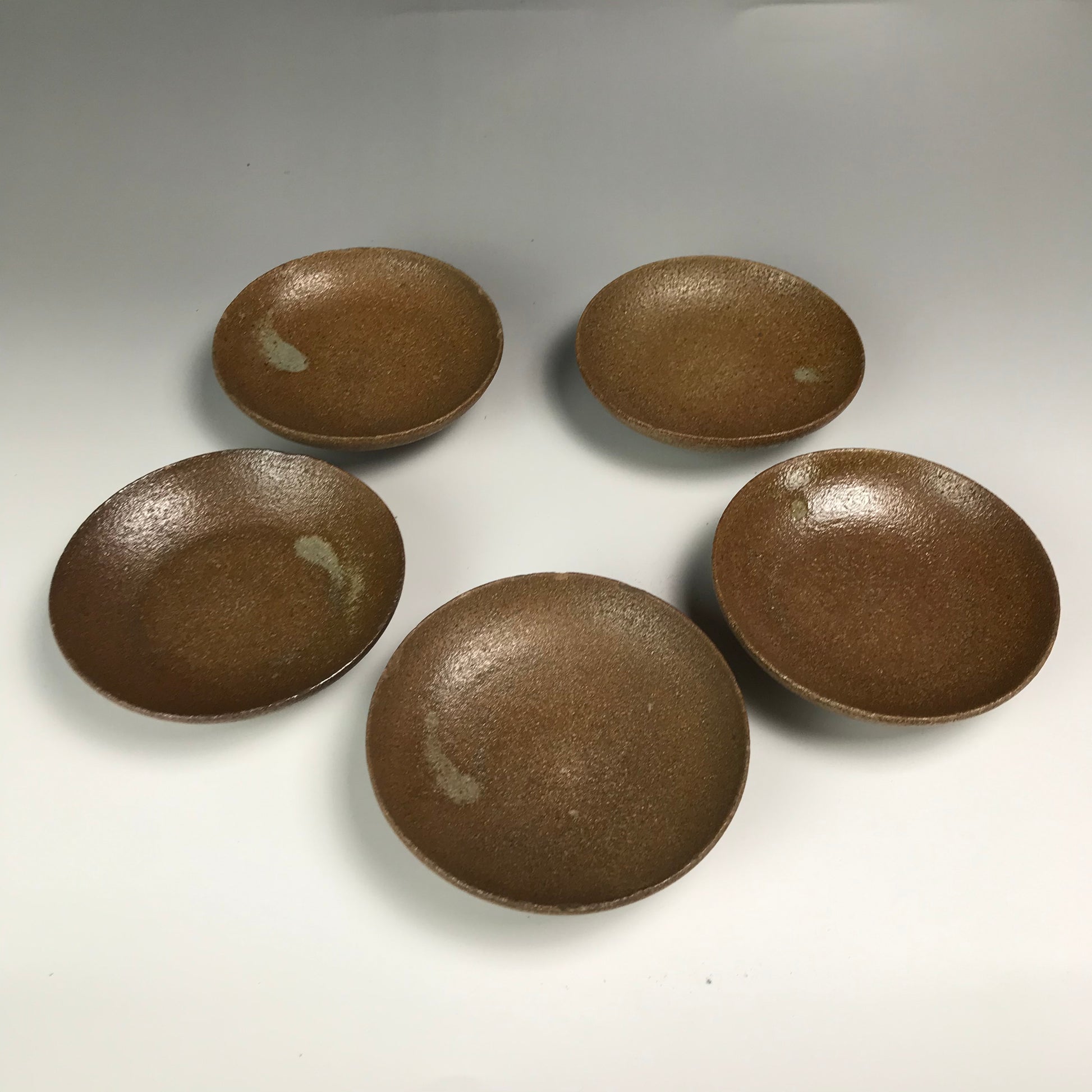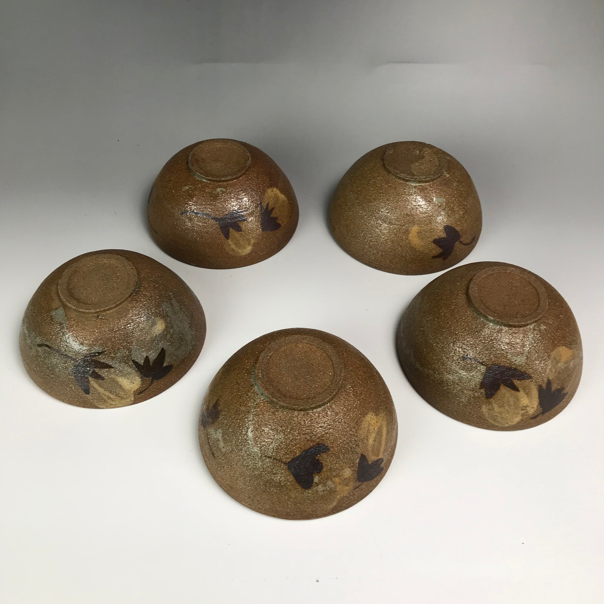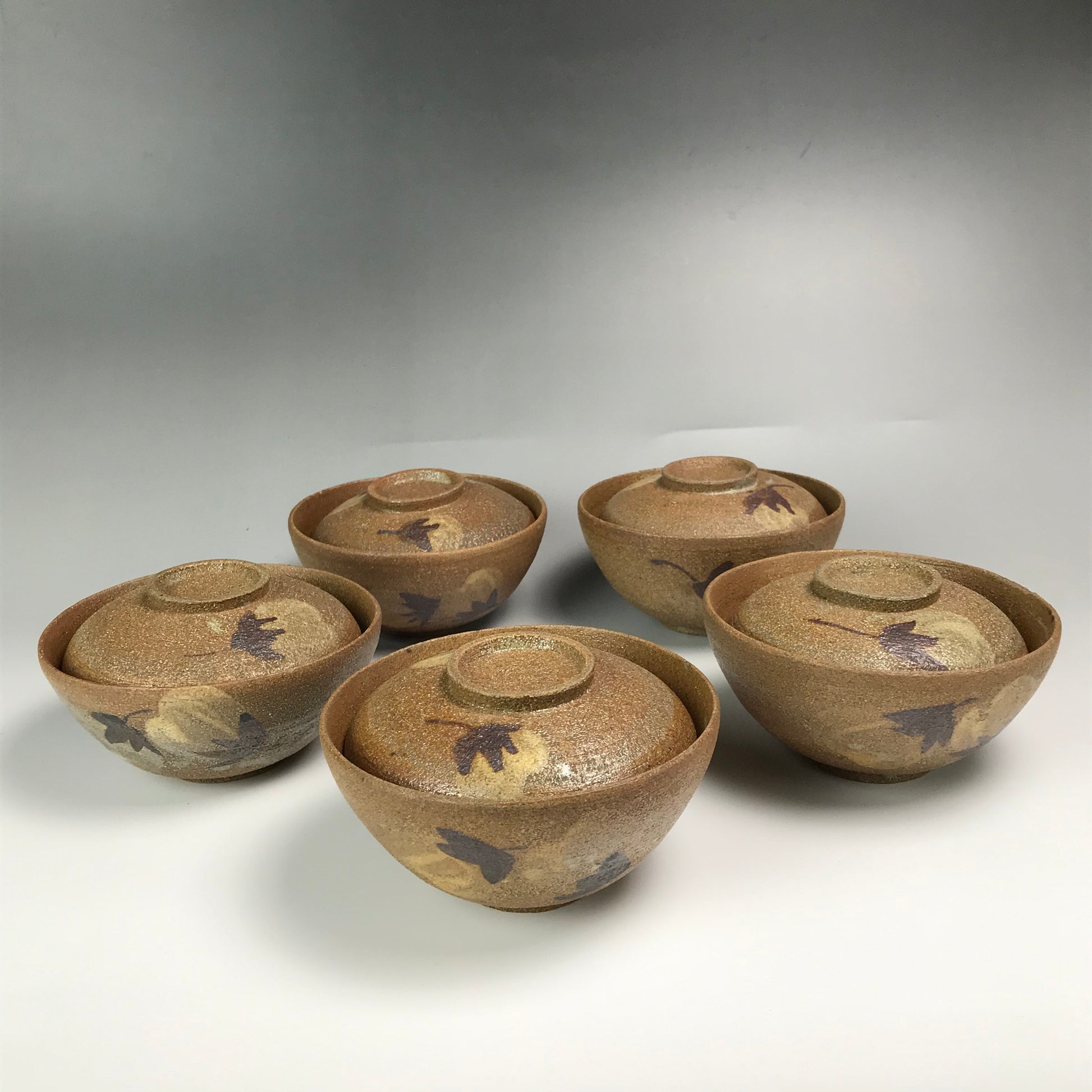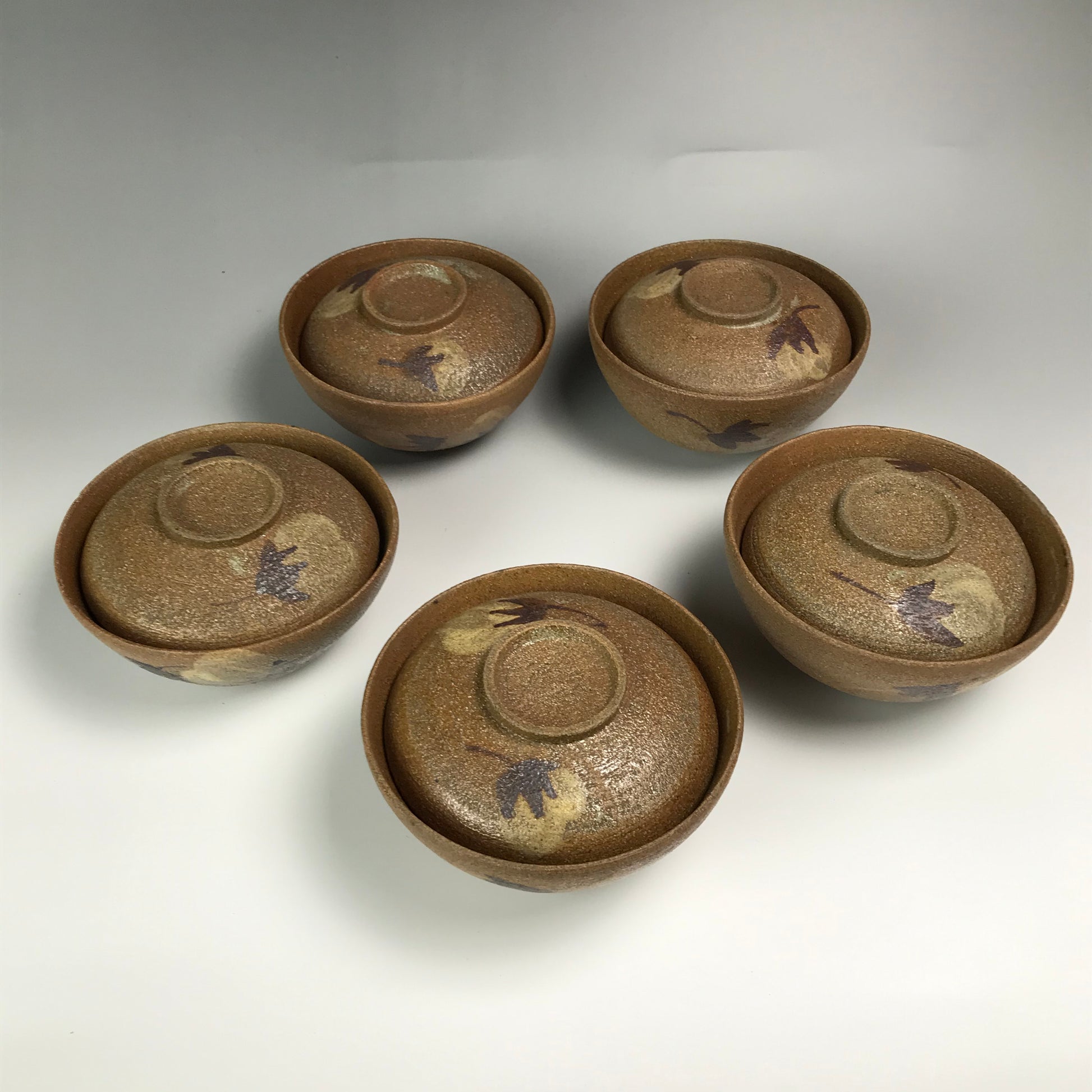 A set of five covered bowls from the Akashi kilns of the 19th century decorated with cotton flowers on brown sandy clay. Each bowl is roughly 11.5 cm (4-1/2 inches) diameter, 6 cm (2-1/4 inches) deep. There are minor abrasions to the soft clay along the rims, but no cracks, and overall in rare fine used condition.
