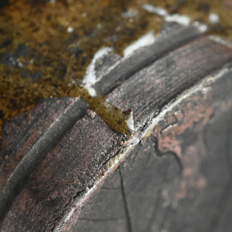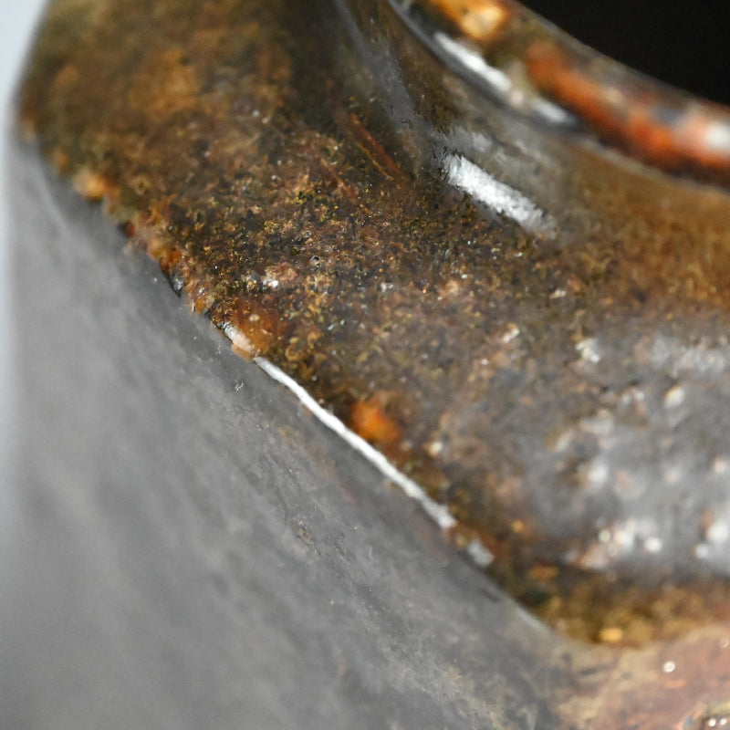 An unusual 6-sided storage jar, the dark iron-rich clay covered in green glaze with the date Genroku 5 ((1692) and a signature scored into the side. Opposite this is an impressed image of a coin as well as a 3-character seal impressed into the side below the shoulder. Interestingly, deeply impressed into the soft clay of the base is a large oak leaf, very unusual for the time. The jar, likely from Tamba, one of the Rokkoyo or six ancient kilns, is 16.5 cm (6-1/2 inches) across, 19.5 cm (just less than 8 inches) tall and in excellent condition.