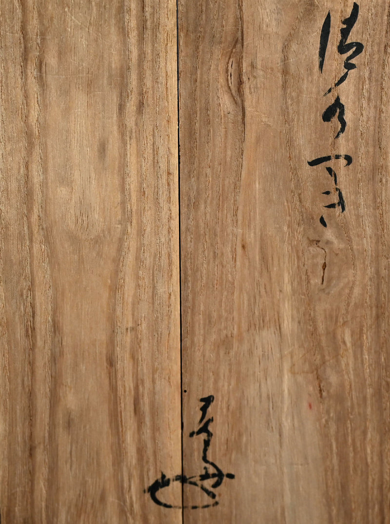 A breathtaking set of five gourd-shaped dishes of Bizen clay with Hidashiki lines covered in pale white glaze, a rare example of Shiro-Bizen enclosed in a dilapidated tiered kiri-wood storage box, each in its own compartment showcasing the value placed on the set. Two the dishes have vibrant gold repairs like lightning across the winter sky. Stamped on the bottom Kiyomizu, it is possible that these were fired in Kyoto in the 19th century. They are 14.5 x 9.5 x 4 cm (roughly 6 x 4 x 1-1/2 inches) each.