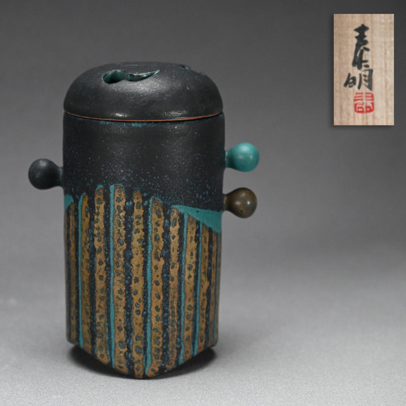 An unusual Koro incense burner by pottery legend Morino Taimei enclosed in the original signed wooden box. It is 9.5 x 13.5 x 17.5 cm (4 x 5-1/2 x 7 inches and is in excellent condition.