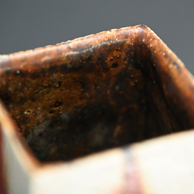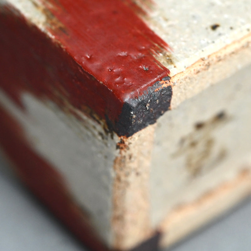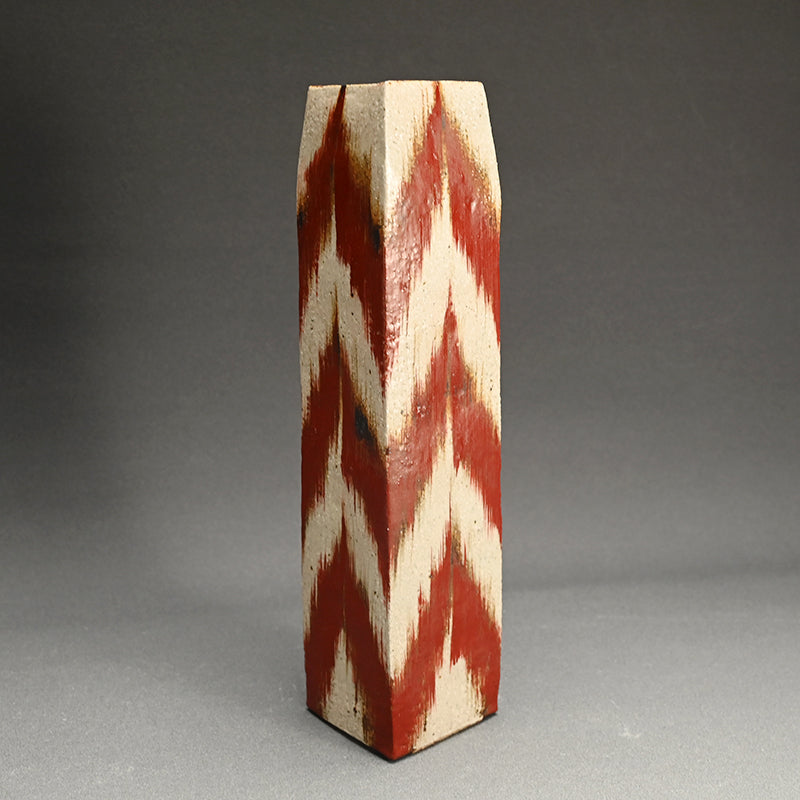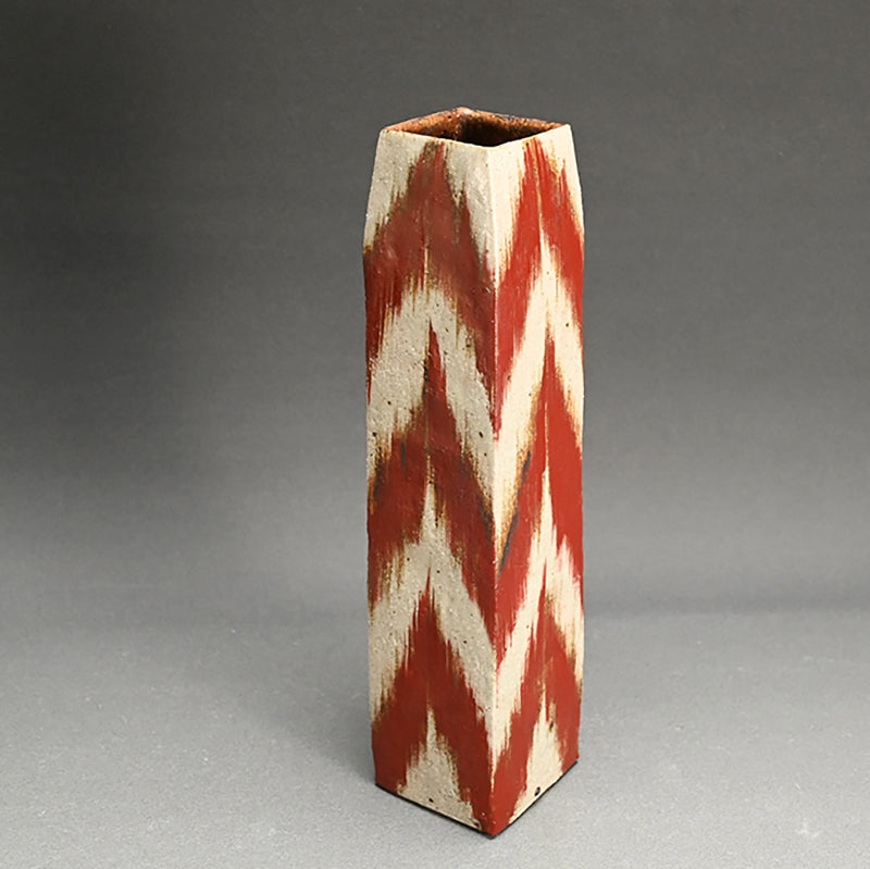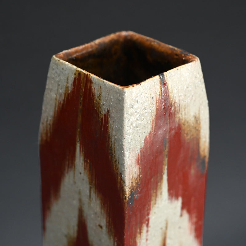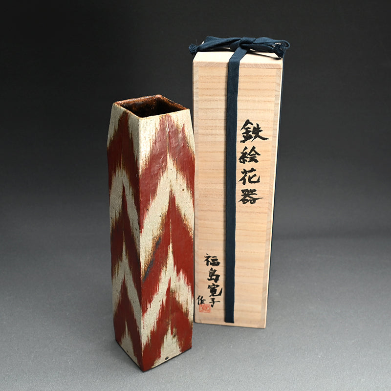 An unusual work in patterned in russet red by female artist Fukushima Hiroko enclosed in the original signed wooden box titled Tetsu-e Kaki. The design is based on traditional Textile patternation, a strong source of inspiration for the artist. The vast majority of work by Hiroko is in blue and white, making this vessel quite unique. The vase is 8.2 cm (3-1/2 inches) square, 35 cm (14 inches) tall and in excellent condition, directly from the artist.