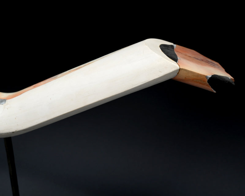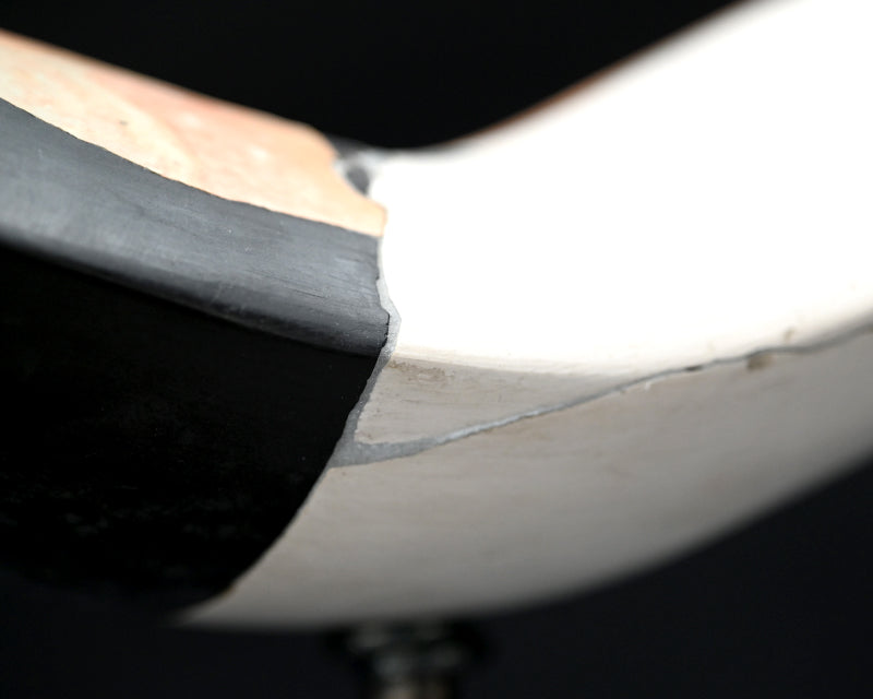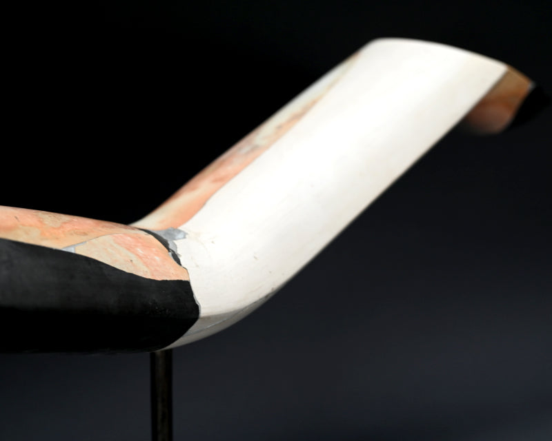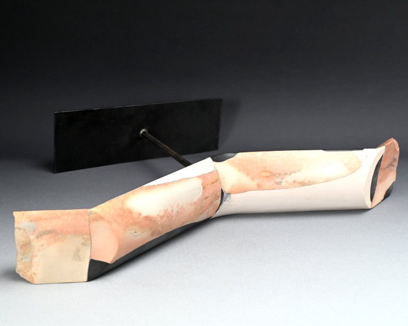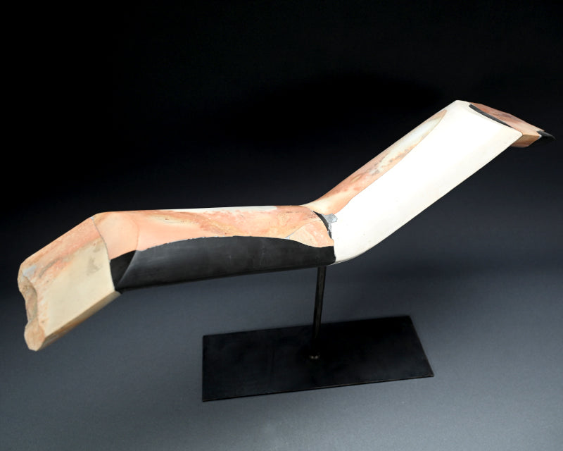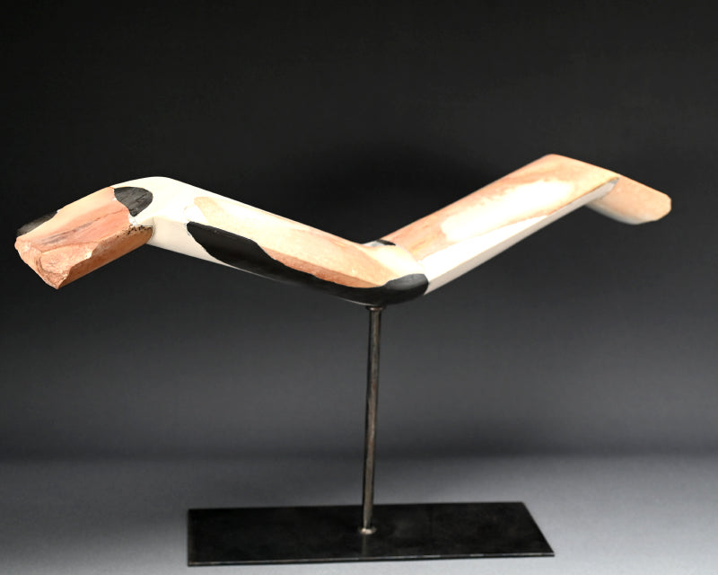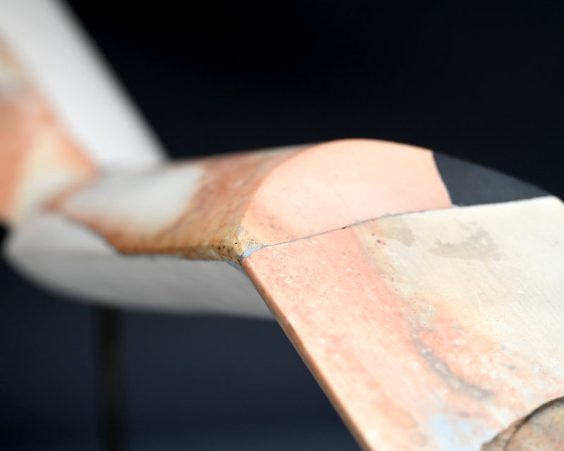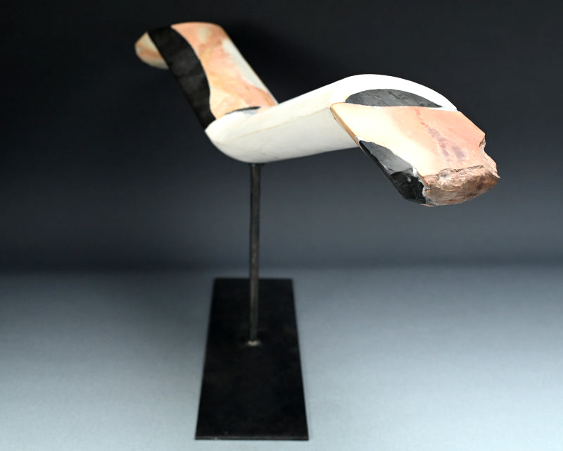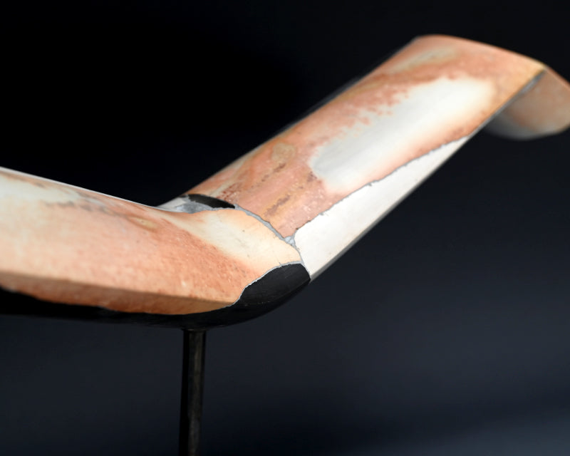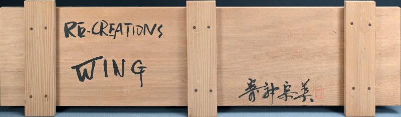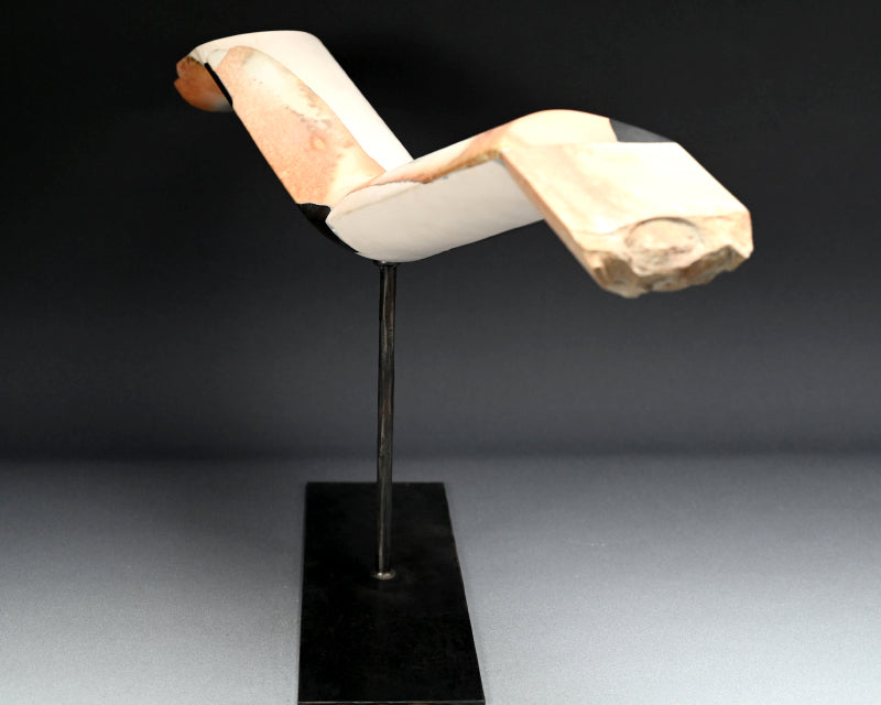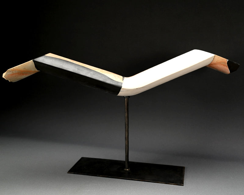 A striking ceramic sculpture like bird in flight by Yorigami Munemi mounted on an iron base and enclosed in the original wooden crate signed and titled Re-Creations, Wing. It is 76 x 12 x 14.5 cm (excluding the base) and in fine condition. This was originally exhibited at the Isetan Department Store and was used as the cover for eth invitation letter (included) as well as being published in their February Newsletter in 1995, both included.