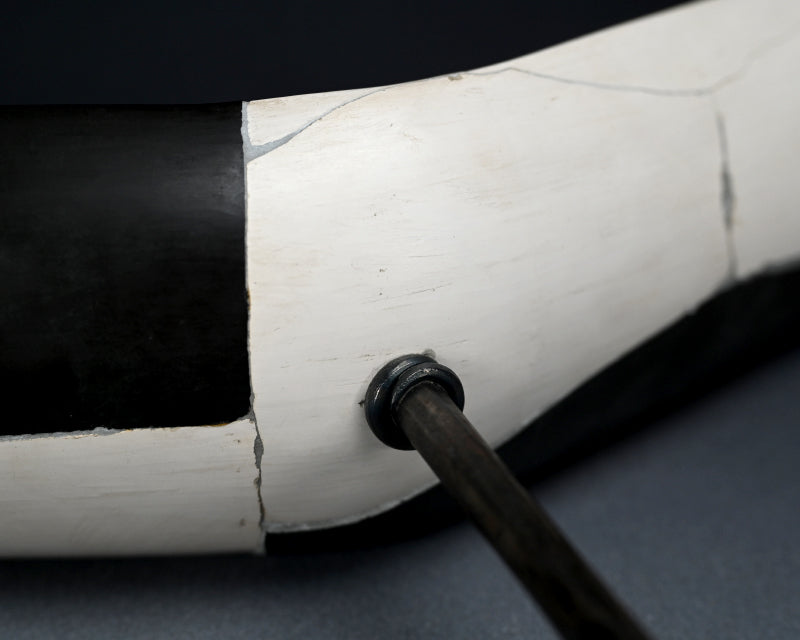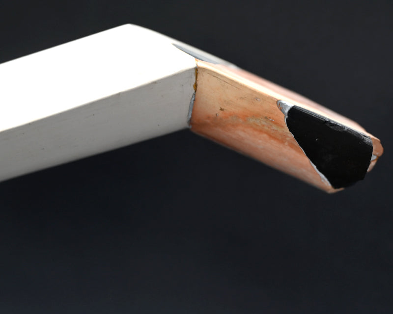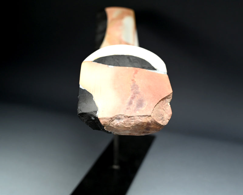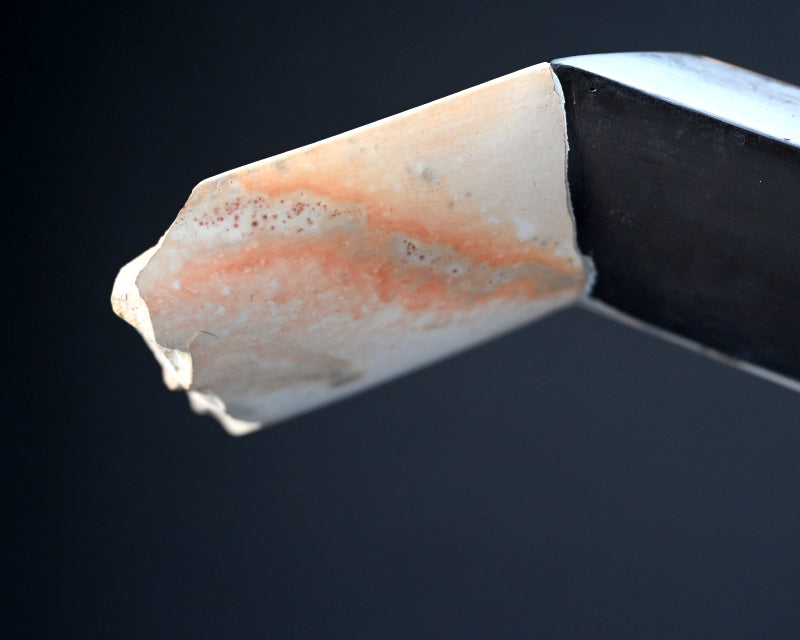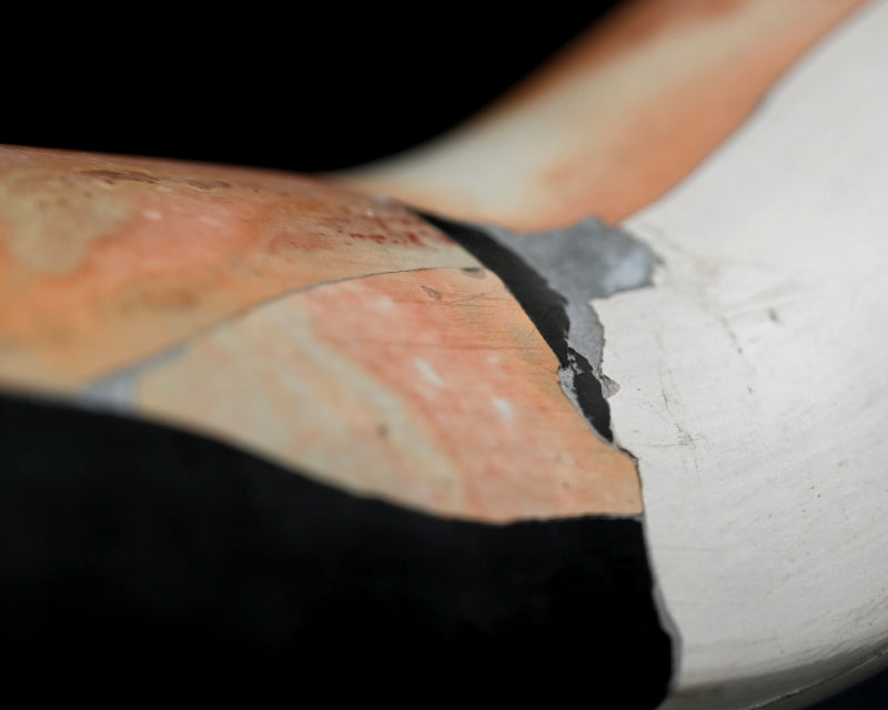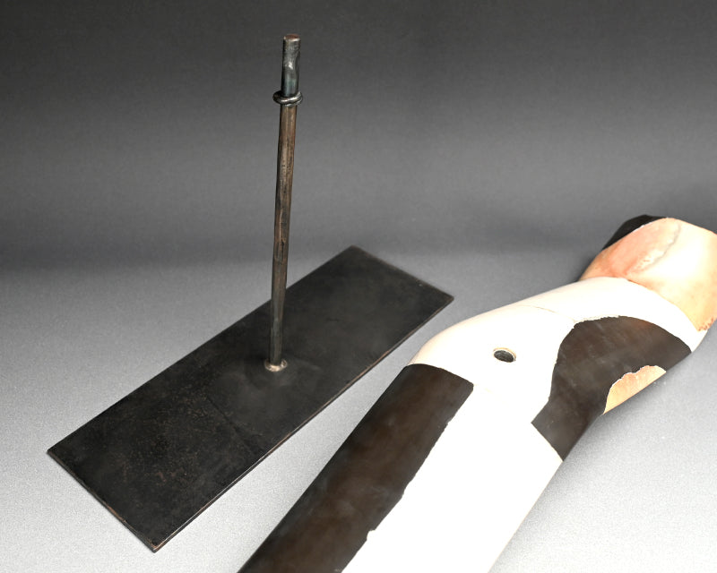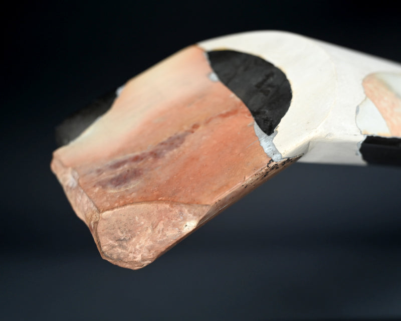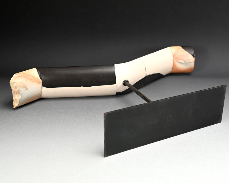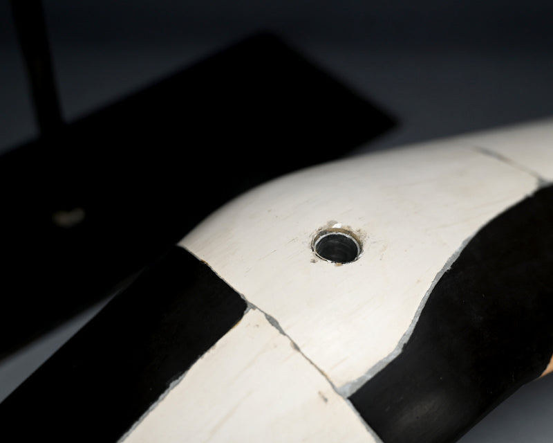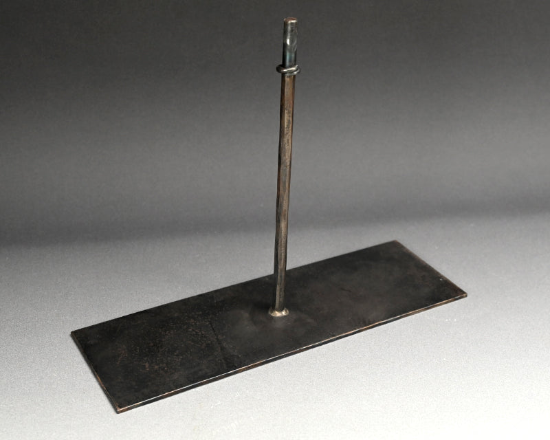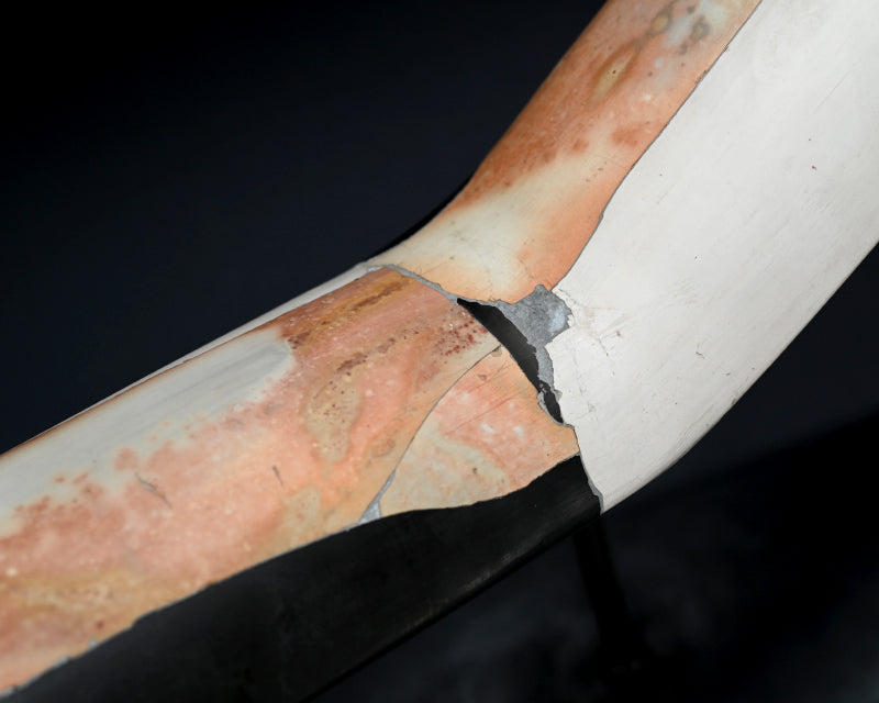 A striking ceramic sculpture like bird in flight by Yorigami Munemi mounted on an iron base and enclosed in the original wooden crate signed and titled Re-Creations, Wing. It is 76 x 12 x 14.5 cm (excluding the base) and in fine condition. This was originally exhibited at the Isetan Department Store and was used as the cover for eth invitation letter (included) as well as being published in their February Newsletter in 1995, both included.
