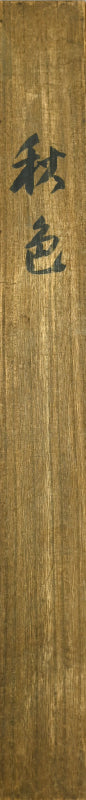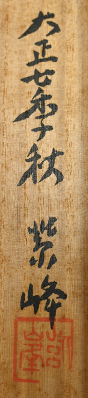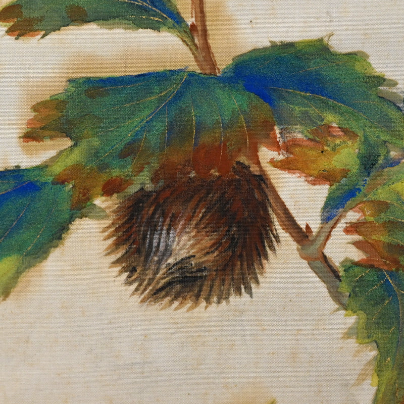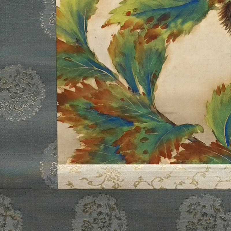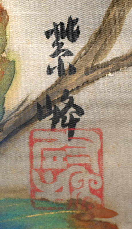 Lush colors evoke the power of life in this vivid painting by important 20th century artist Sakakibara Shiro enclosed in the original signed box titled Shushoku (Autumn Color) dated Autumn of Taisho 7 (1918). It is mounted in an extravagant brocade border with ivory rollers (the rollers will be changed if exporting). It is 57 x 134 cm (22-1/2 57 inches). There are a couple of bubbles in the silk where it has come un-adhered, and faint foxing.