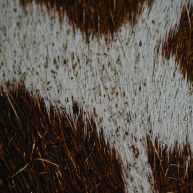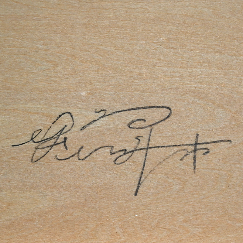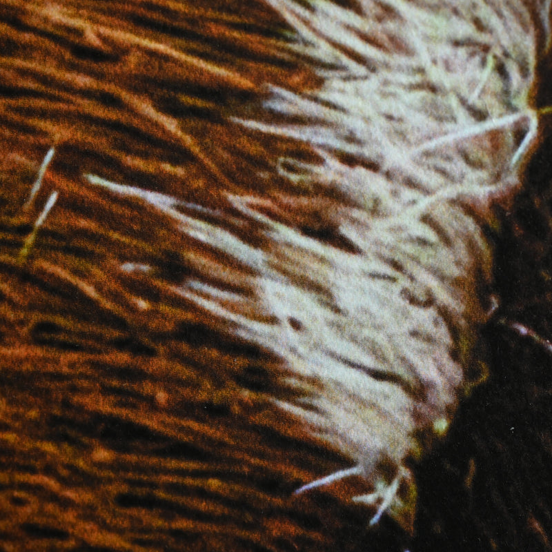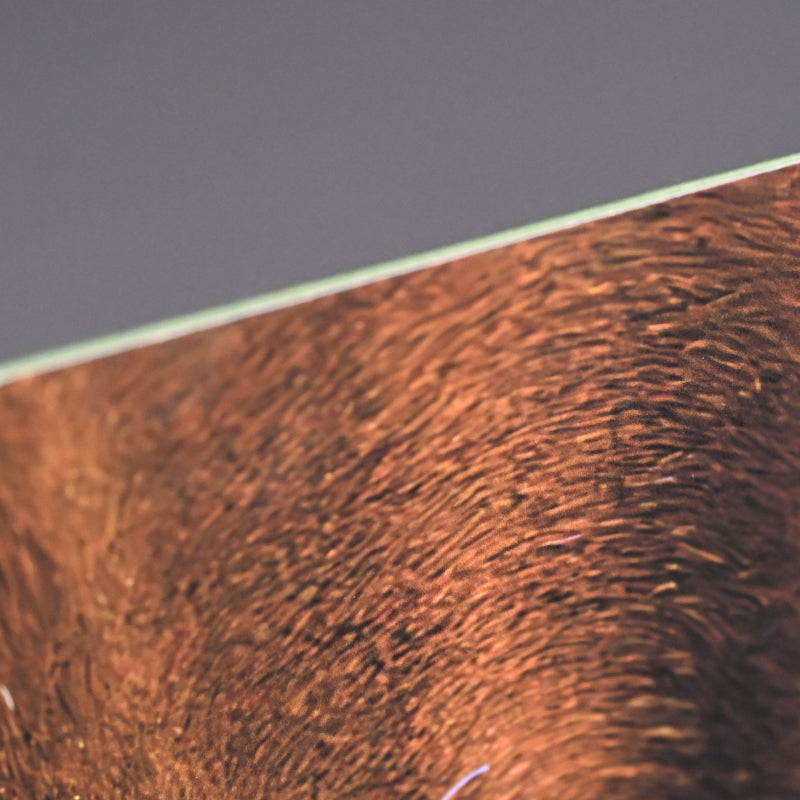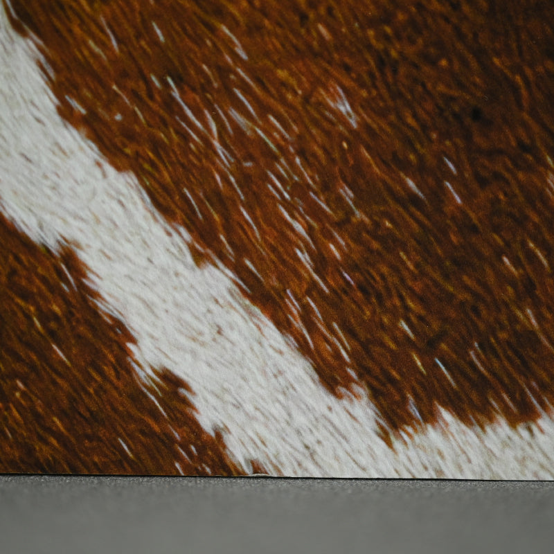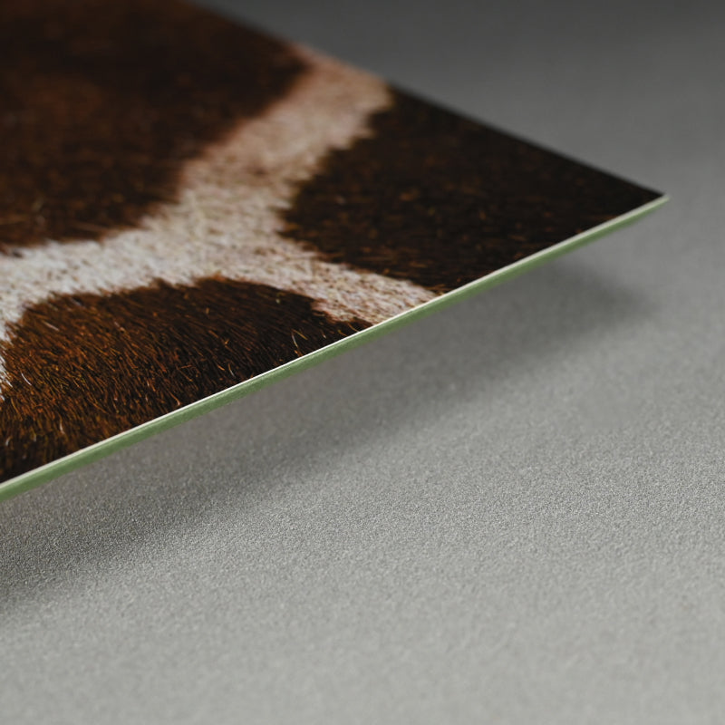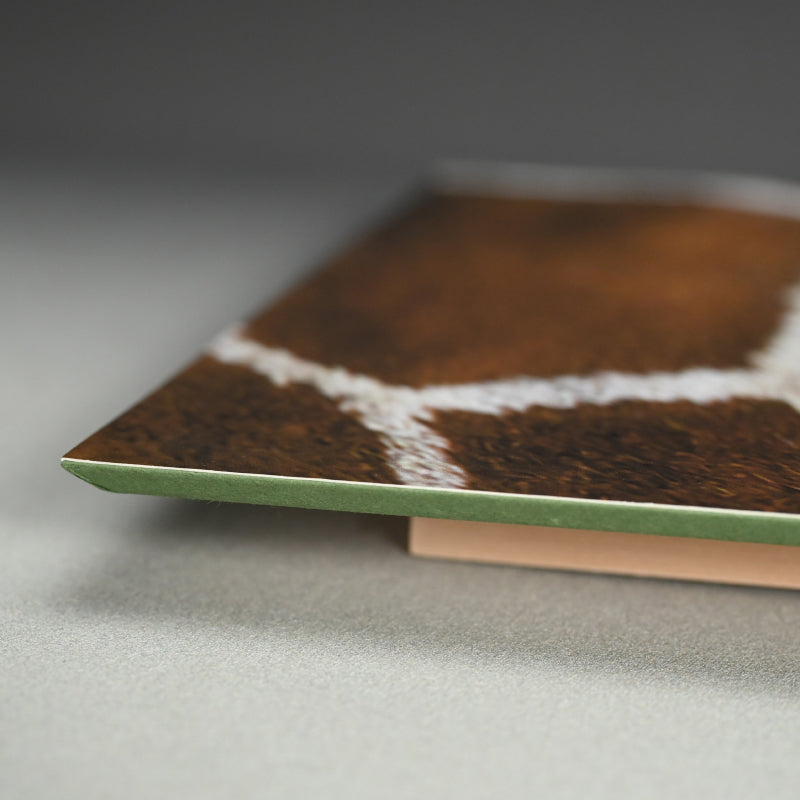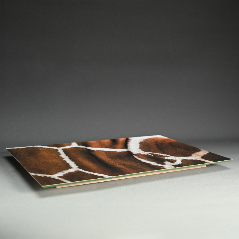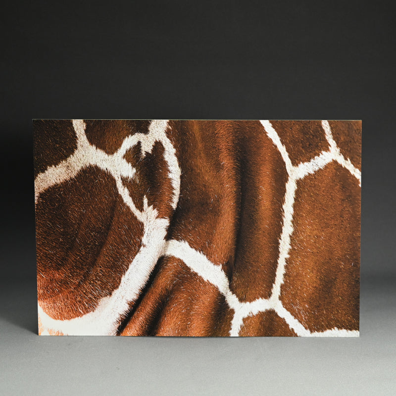 An extreme photograph of the mottled patterning of a young giraffe mounted as a hanging panel by Horitani Shoichi signed on back and numbered 1/15. It is 54.5 x 36 x 3 cm (21-1/2 x 14-1/2 x 1 inches) and is in perfect condition, mounted on a wooden panel elevated from the wall.