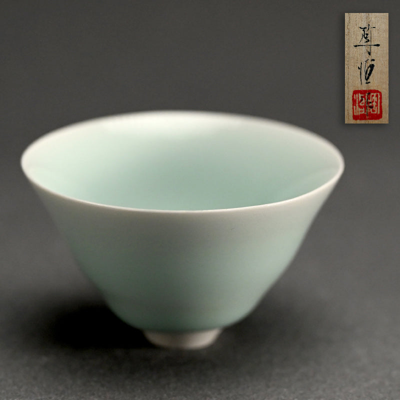 An exquisite inverted cone-shaped celadon sake cup supported by a tiny ring foot by Fukami Sueharu enclosed in the original signed wooden box titled Seihakuji Guinomi. It is 7 cm (3 inches), 4 cm (1-12 inches) tall and in perfect condition.