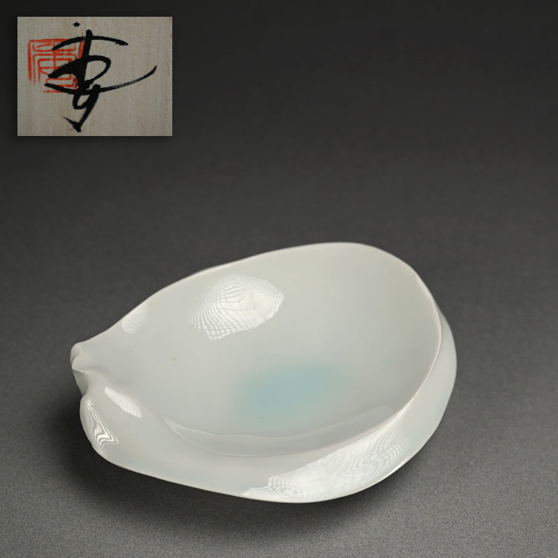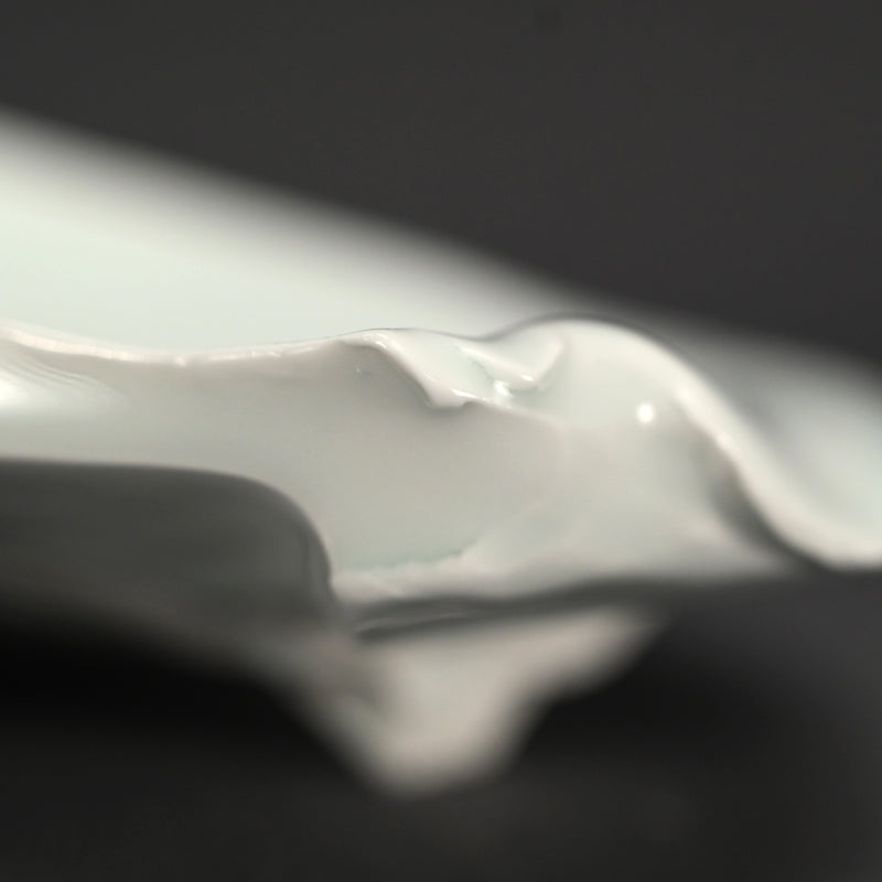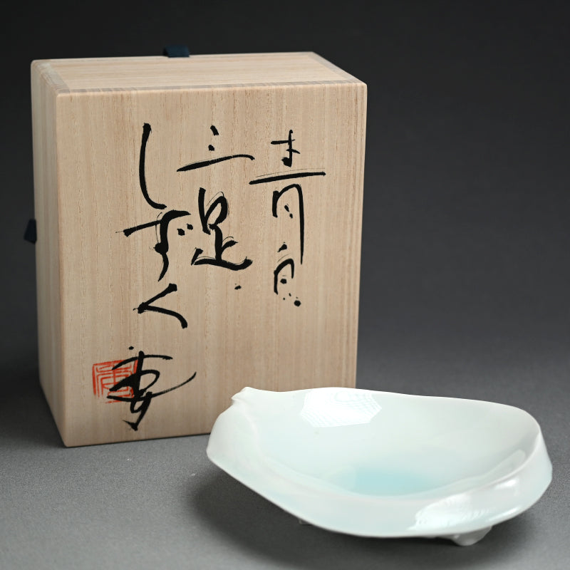 An elegant sliver of ice green porcelain supported on three pinched feet perfect for serving some small hors d’ouerves by Kato Tsubusa enclosed in the original signed wooden box titled Shizuku. It is 14.5 x 17.5 x 5.5 cm (5-3/4 x 7 x 2 inches) and is in perfect condition, directly from the artist this summer.