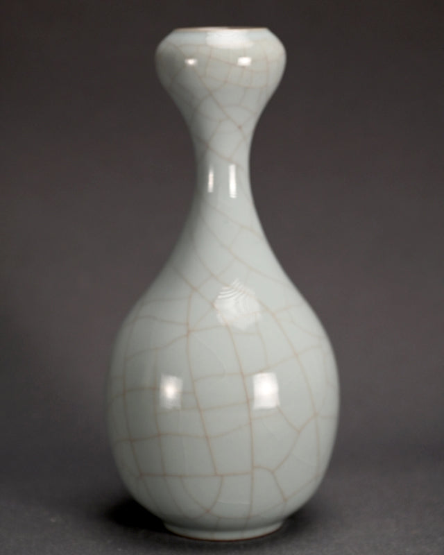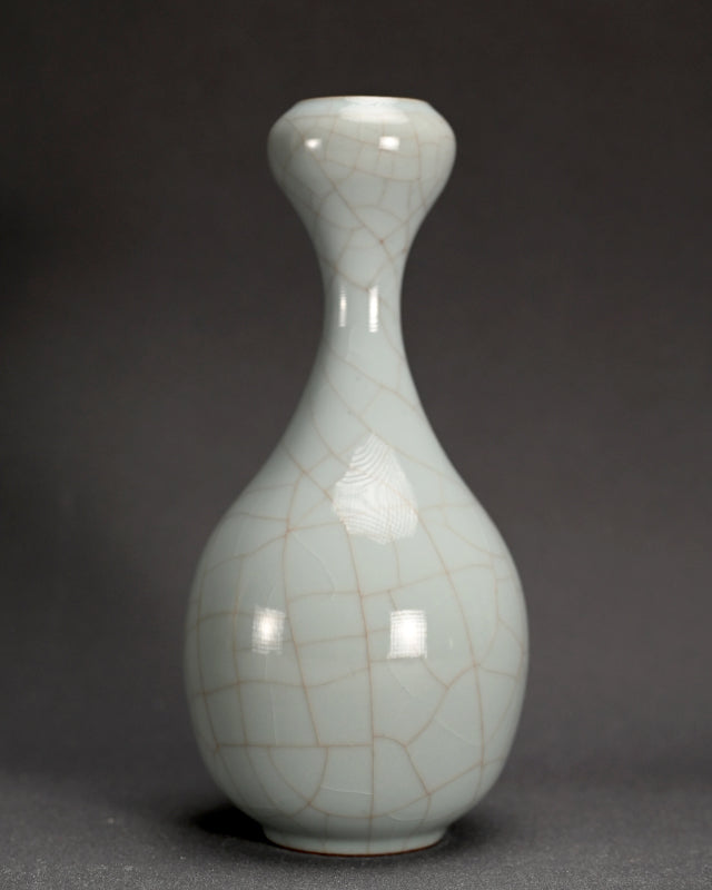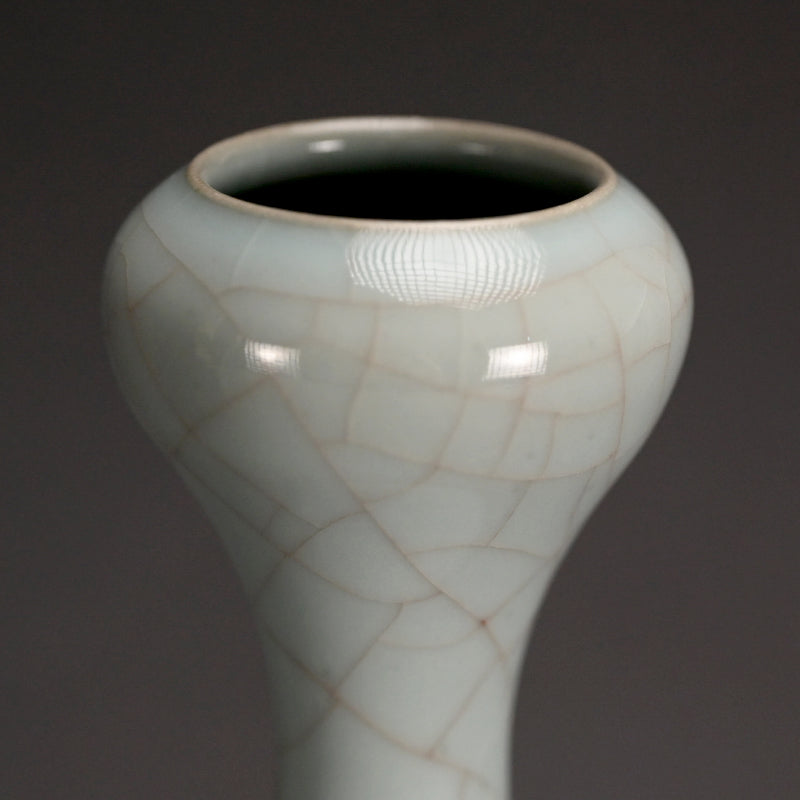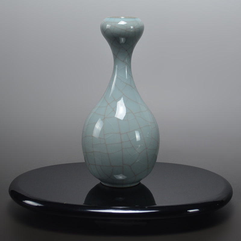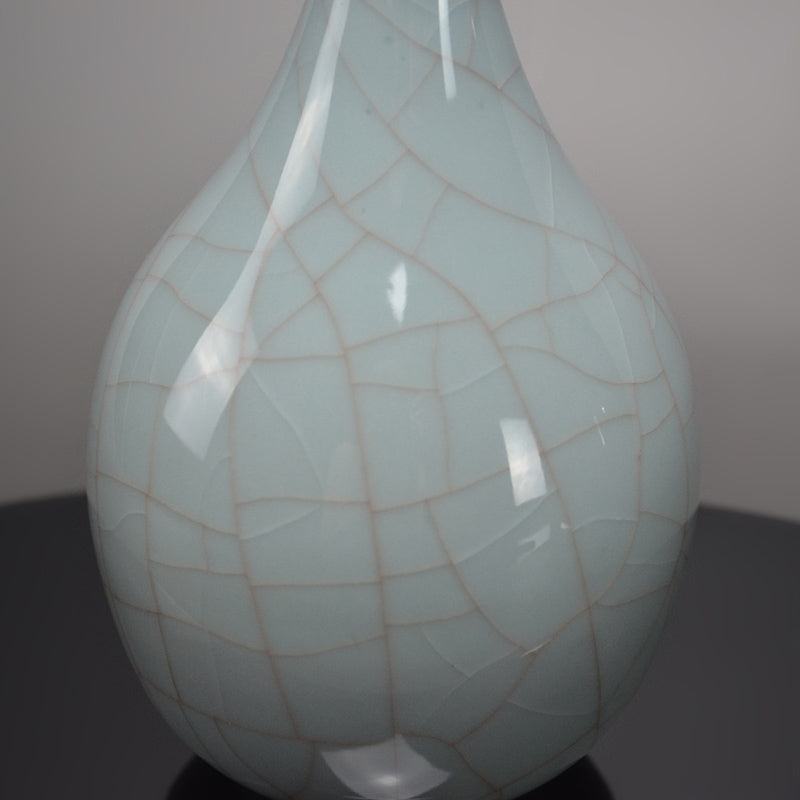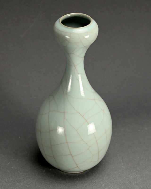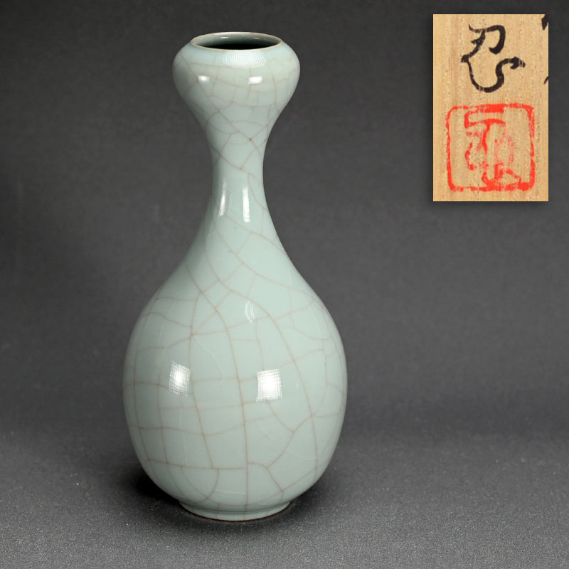 Ever elegant, a form harkening back to Song period Chinese celadons by legendary artist Kawase Shinobu enclosed in the original signed wooden box titled Seiji Hanaire. The jade glaze is widely fissured, likening to cracked green ice. It is 22 cm (9 inches) tall and in excellent condition.