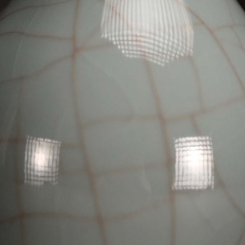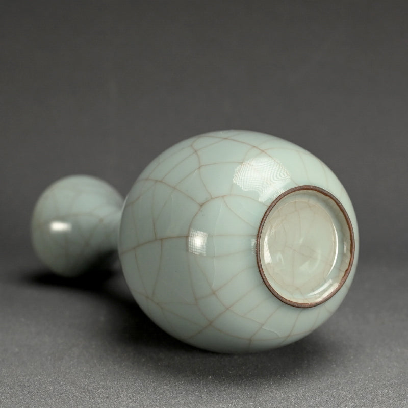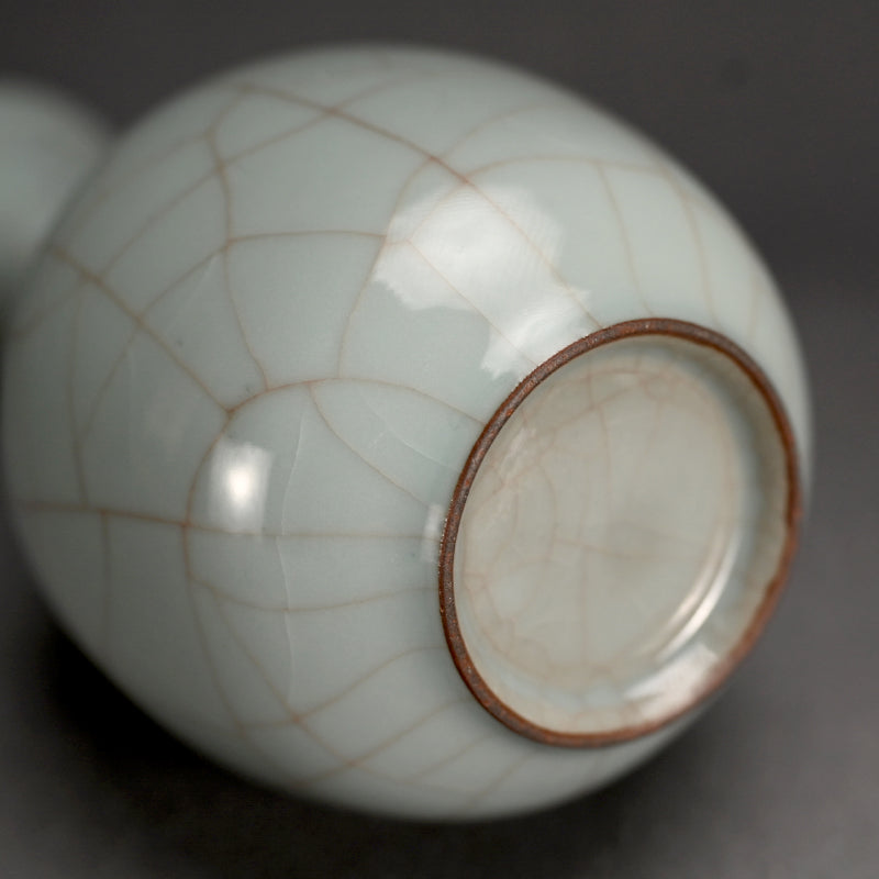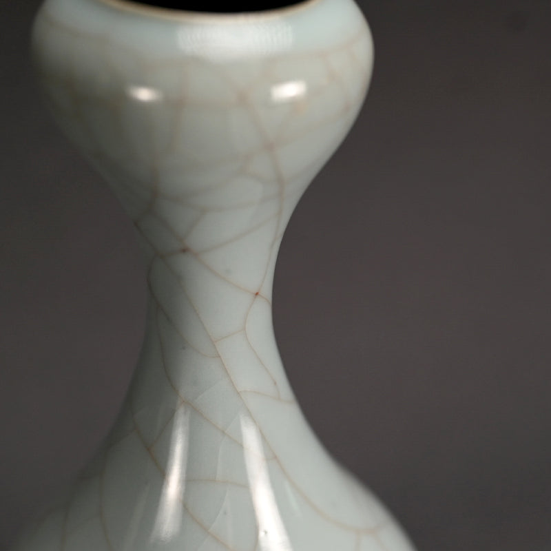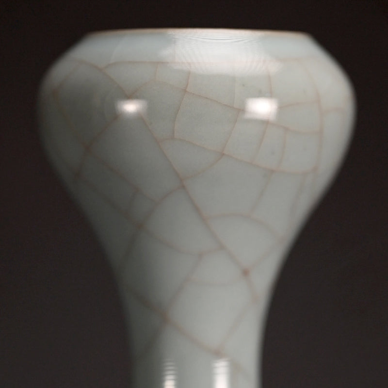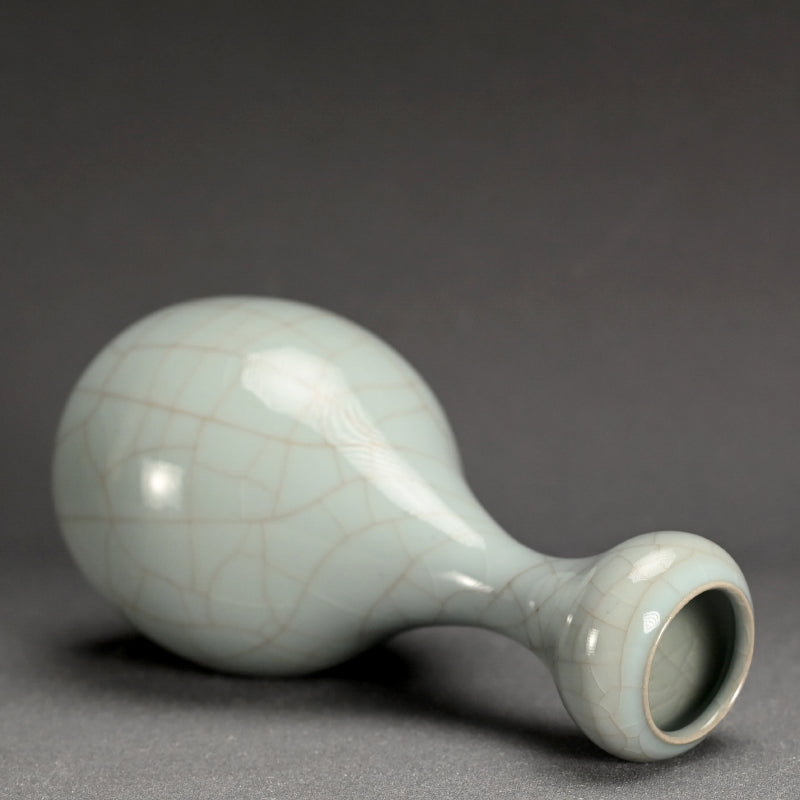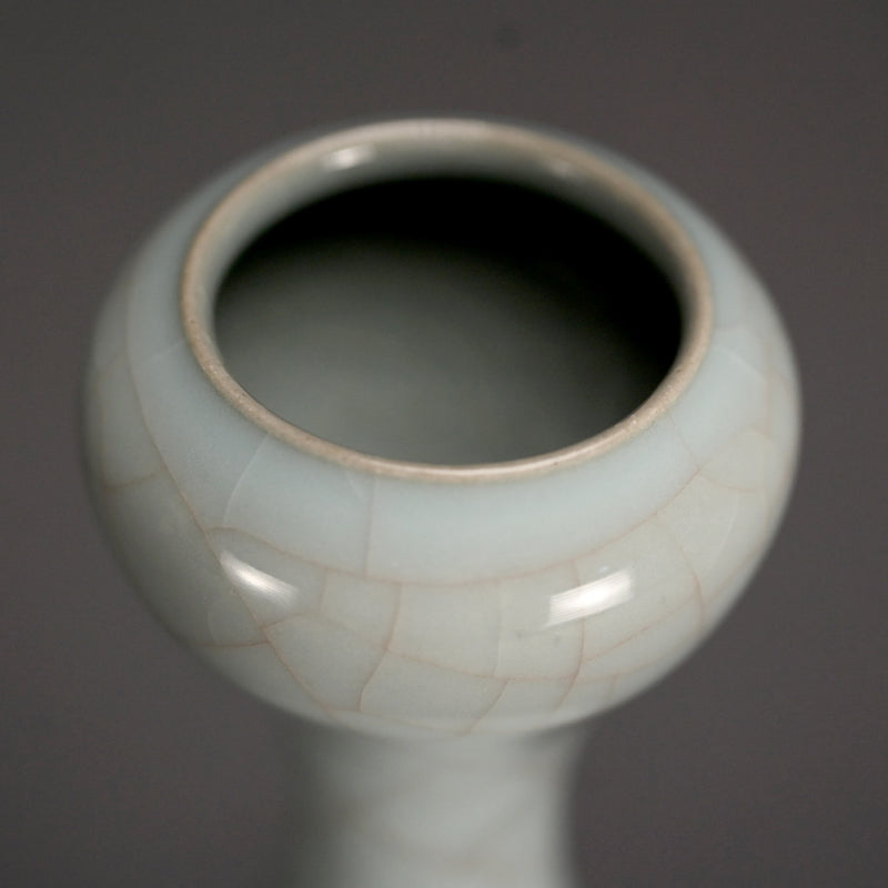 Ever elegant, a form harkening back to Song period Chinese celadons by legendary artist Kawase Shinobu enclosed in the original signed wooden box titled Seiji Hanaire. The jade glaze is widely fissured, likening to cracked green ice. It is 22 cm (9 inches) tall and in excellent condition.