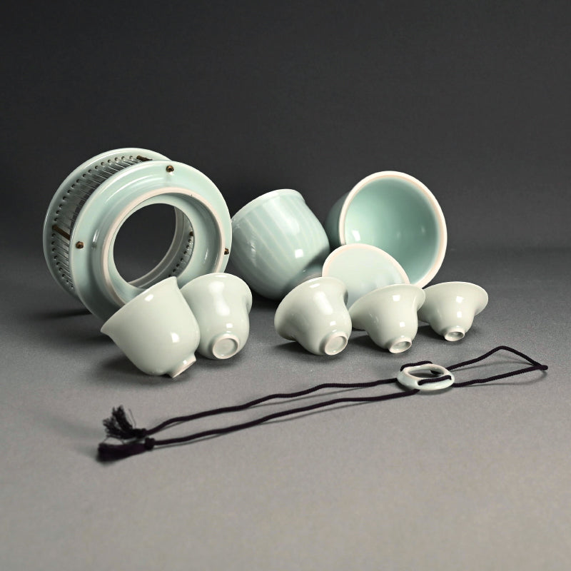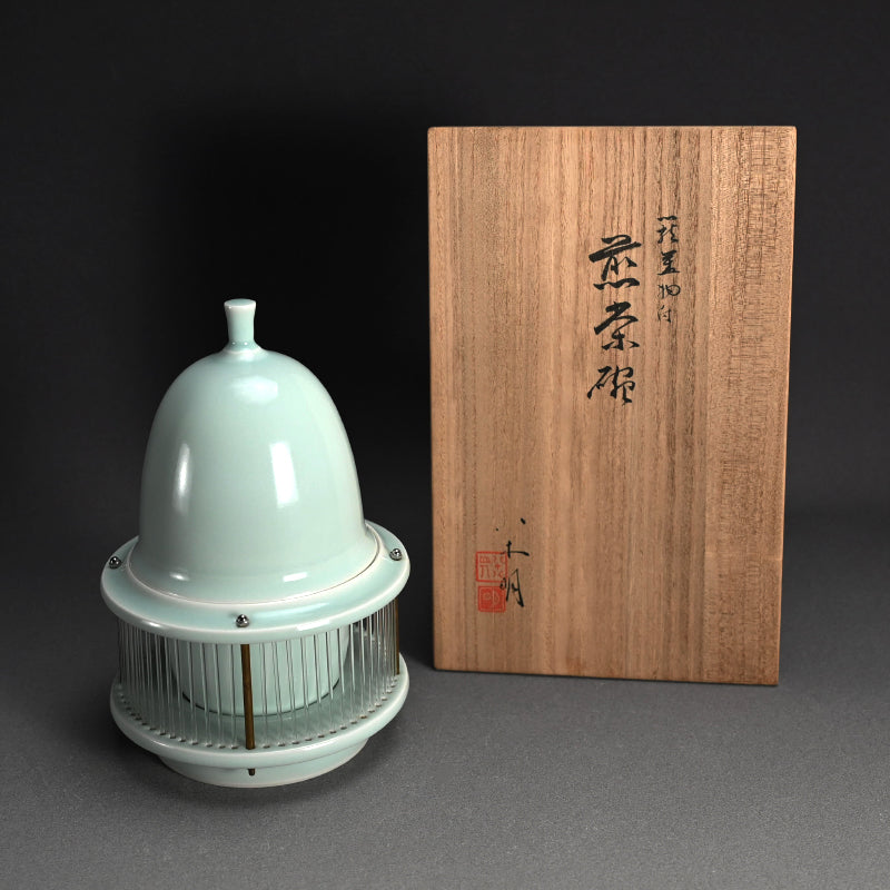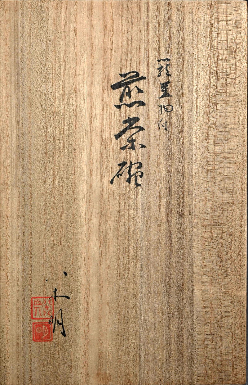 A set of nesting tea cups in a lidded cylinder set into a domed container by Yagi Akira enclosed in the original signed and compartmentalized wooden box titled Sencha-wan. The Outside container is 26 cm (10-1/2 inches) diameter, 20.5 cm (8 inches) tall and all is in excellent condition.