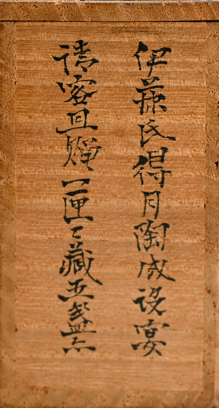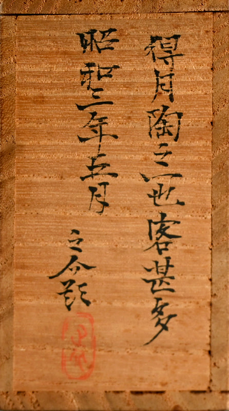 A set of five small Sencha Tea Cups decorated with a leaf inside, a verse of four archaic characters outside enclosed in the original signed wooden box dated Showa 3 (1928). They are 4.5 cm (just less than 2 inches) diameter, 2.5 cm (1 inch) tall and in excellent condition.
