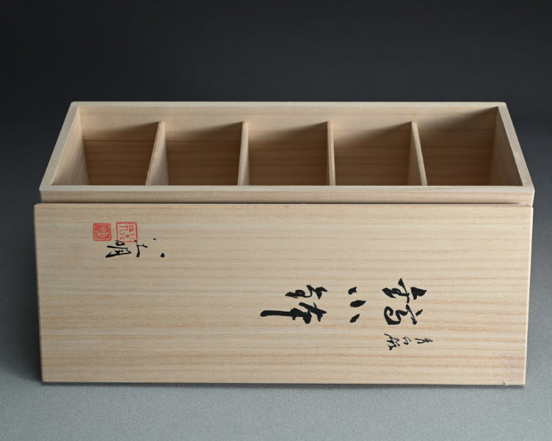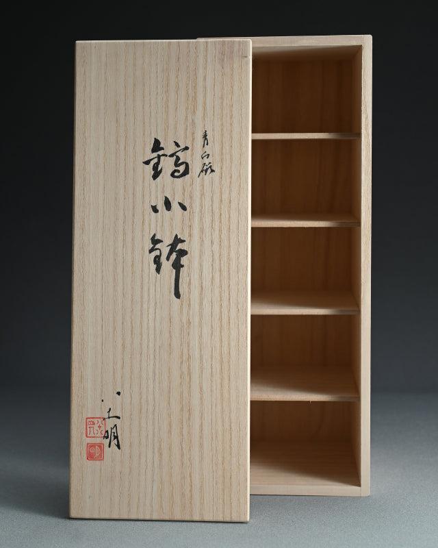 A set of five sculpted bowls of exquisite celadon by master of the craft Yagi Akira enclosed in the original signed wooden box titled Seihakuji Wan. Each is 12.5 cm (5 inches) diameter, 6.5 cm (2-1/2 inches) tall and all are in perfect condition, directly from the artist.