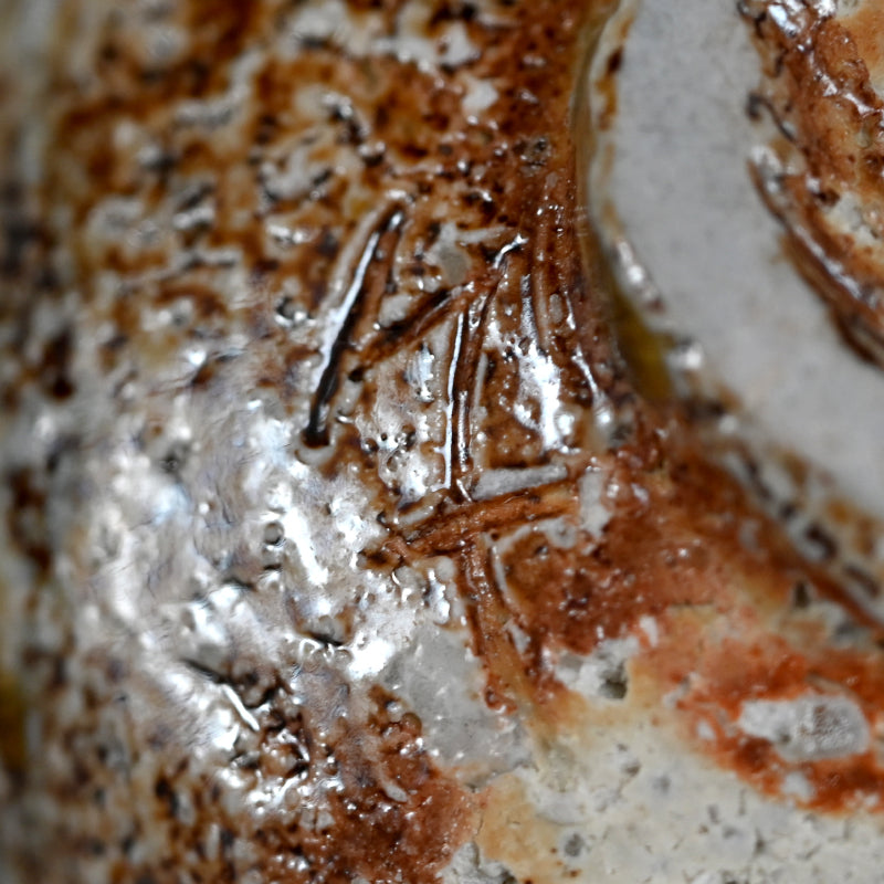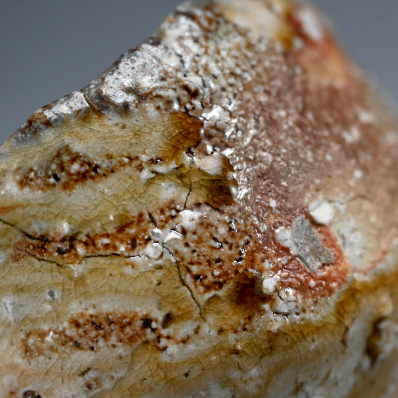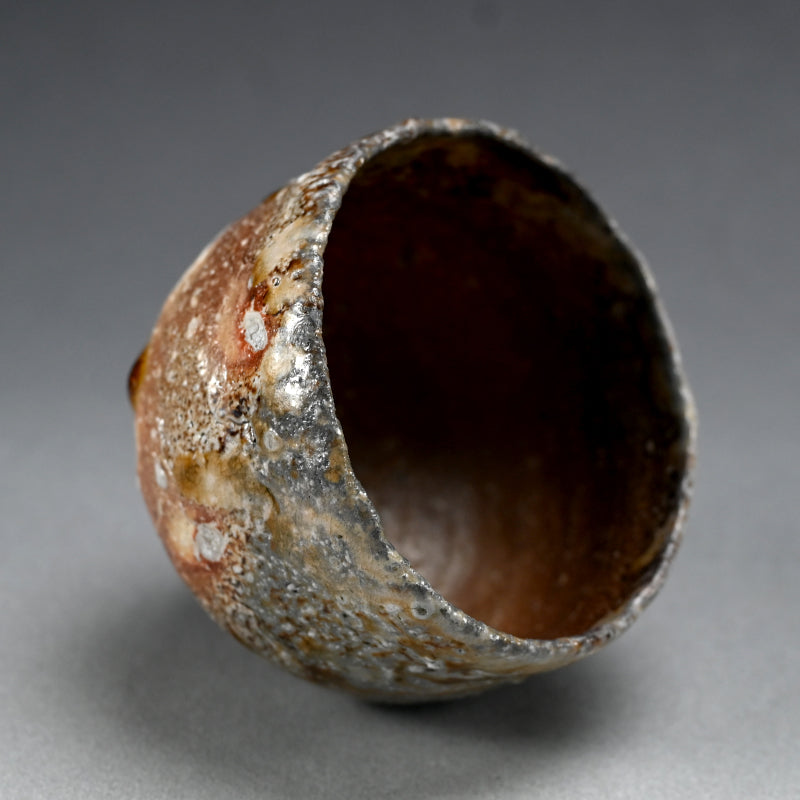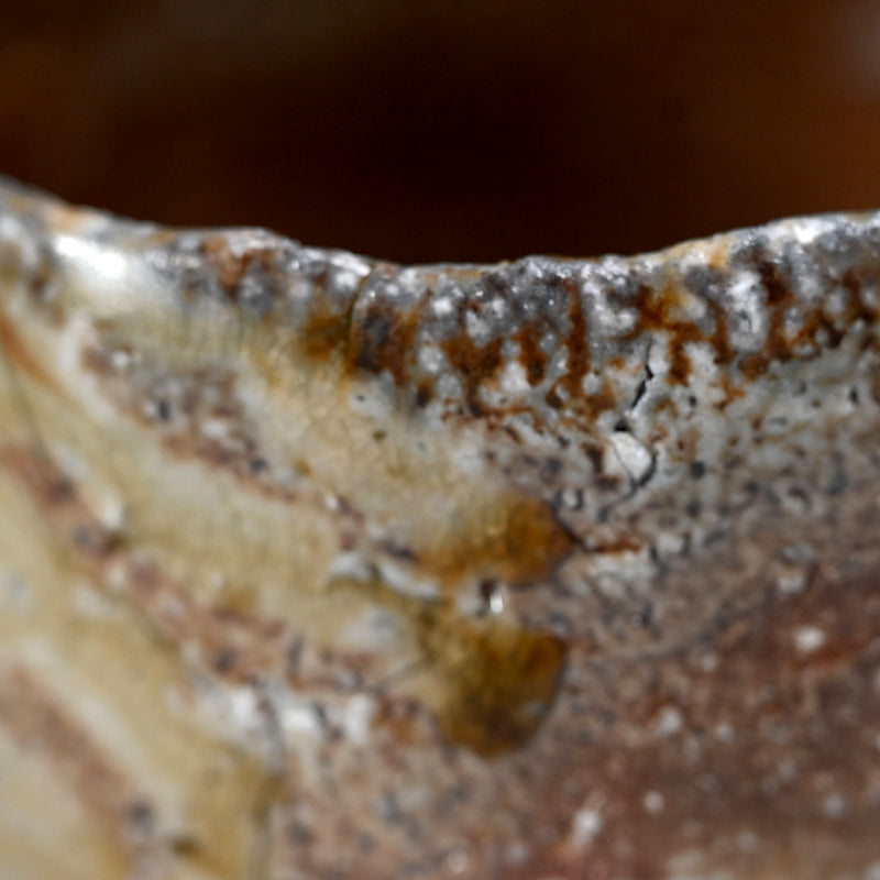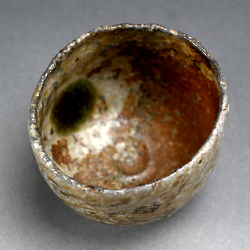 One of two stellar Chawan we picked up this summer from Furutani Taketoshi enclosed in the original signed wooden box titled Shigaraki Shizen-yu Chawan. Typical of his bowls, and a feature which makes them stand out, he is able to get a very thin wall, which makes the bowls light and easy to handle, with a delicate feel quite apart from the wild effects they receive in the firing. It is 12 x 11 x 9 cm (5 x 4-1/2 x 3-1/2 inches) and is in perfect condition, directly from the artist.