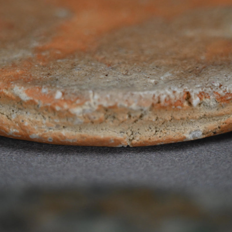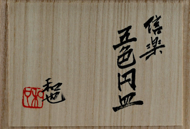 A set of five small slab plates, each with unique firing effects, by Furutani Kazuya enclosed in the original signed wooden box titled Shigaraki Goshoku Enzara. The artist has striven to achieve five unique kiln effects on the set, both by placement, temperature and multiple firing. From spare Hishoku to smokey molten ash and every shade between, a unique look into the world of Shigaraki Ceramic Artistry. Each plate is roughly 15 cm (6 inches) diameter, 1.5 cm (5/8 inch) thick and all are in excellent condition, directly from the artist.