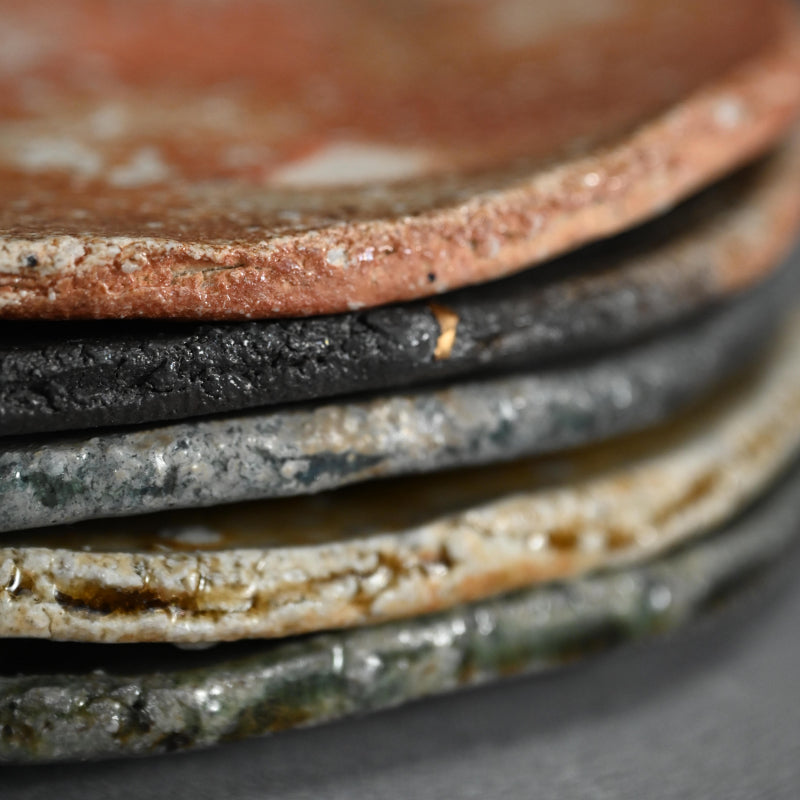 A set of five large slab plates, each with unique firing effects, by Furutani Kazuya enclosed in the original signed wooden box titled Shigaraki Yohen Enzara. The artist has striven to achieve five unique kiln effects on the set, both by placement, temperature and multiple firing allowing each piece the freedom to erode, with the intention of kintsugi gold repairs. From spare Hishoku to smokey molten ash and every shade between, a unique look into the world of Shigaraki Ceramic Artistry. Each plate is roughly 21.5 cm (8-1/2 inches) diameter, 1.5 cm (5/8 inch) thick and all are in excellent condition, directly from the artist.