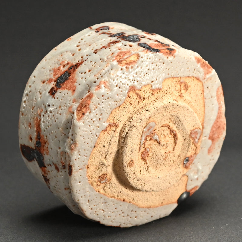A voluminous tea bowl of red-tinged clay covered in pin-holed white shino glaze with a dramatic pattern in iron by Mino legend Suzuki Goro enclosed in the original signed wooden box titled simply Shino Chawan. It is 15 cm (6 inches) diameter, 9 cm (3-1/2 inches) tall and in excellent condition.