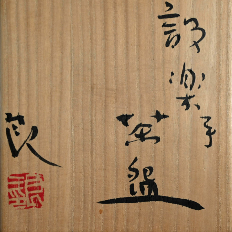 An austere large bowl in ashen color by Koie Ryoji enclosed in the original signed wooden box titled Shitara-te Chawan. It is 14 x 13 x 8 cm (roughly 5-1/2 inches diameter, 3-1/4 inches tall) and in perfect condition.