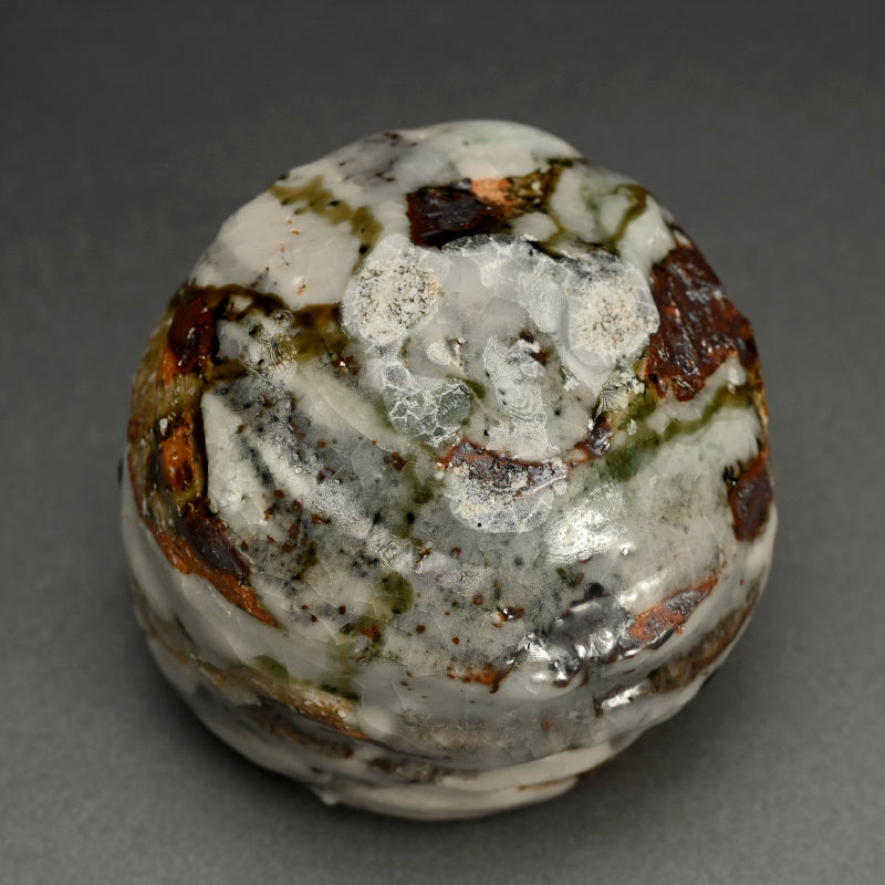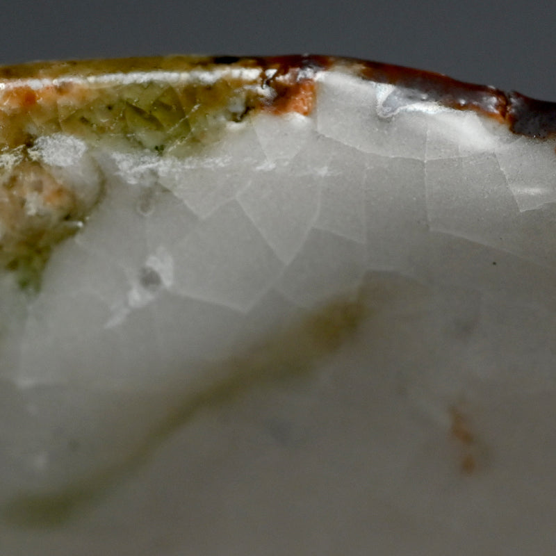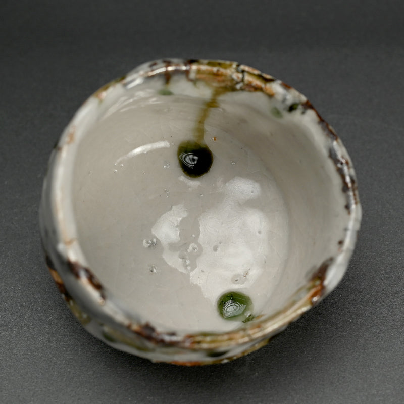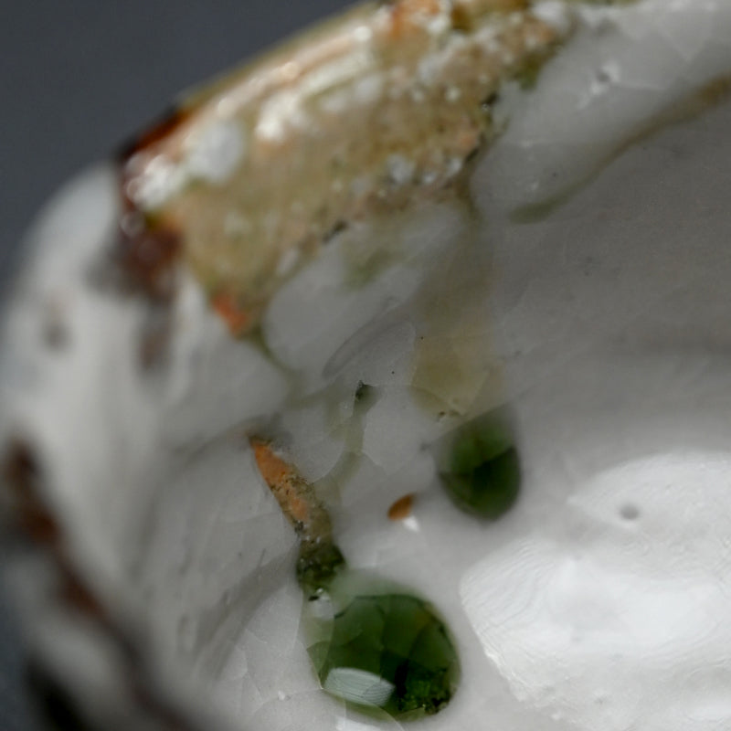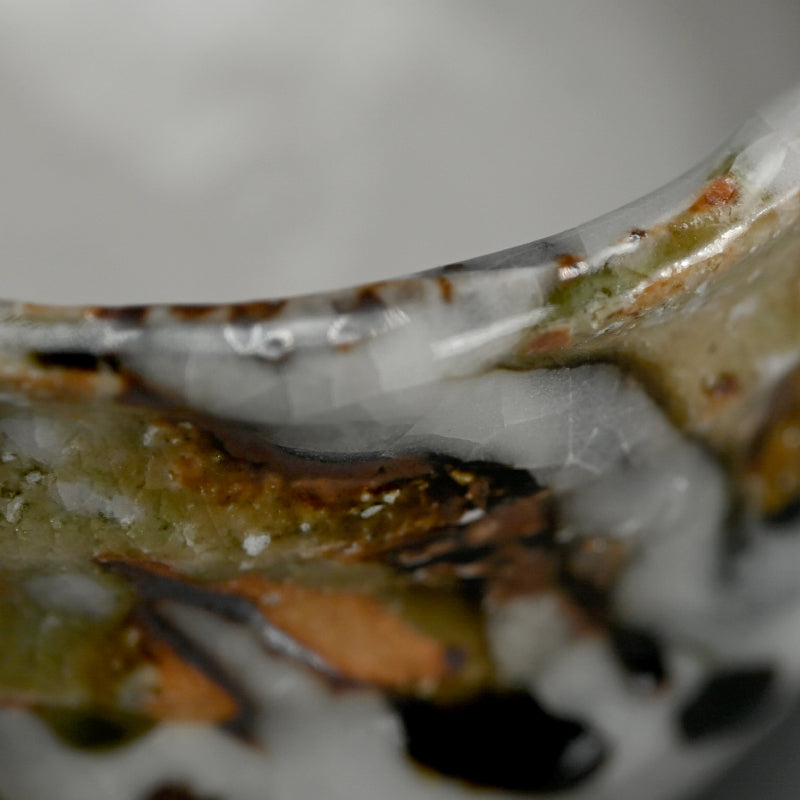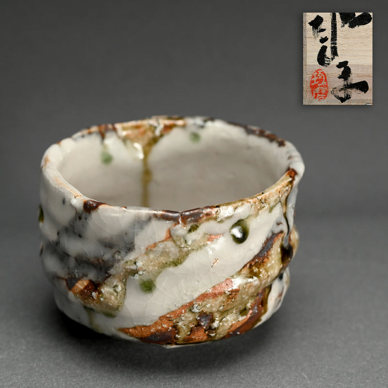 Deep grooves, traces from the artist fingers, score the vertical sides of this proud Tea Bowl by Murakoshi Takuma covered in his signature combination of three glazes and enclosed in the original signed wooden box titled Shunju Chawan. This piece was fired vertically in the kiln, allowing the ash to run like tears of joy down both inside and out. It is 13 x 12 x 9 cm (roughly 5 cm diameter, 3-1/2 inches) tall and in excellent condition, from his firing 2024 autumn.