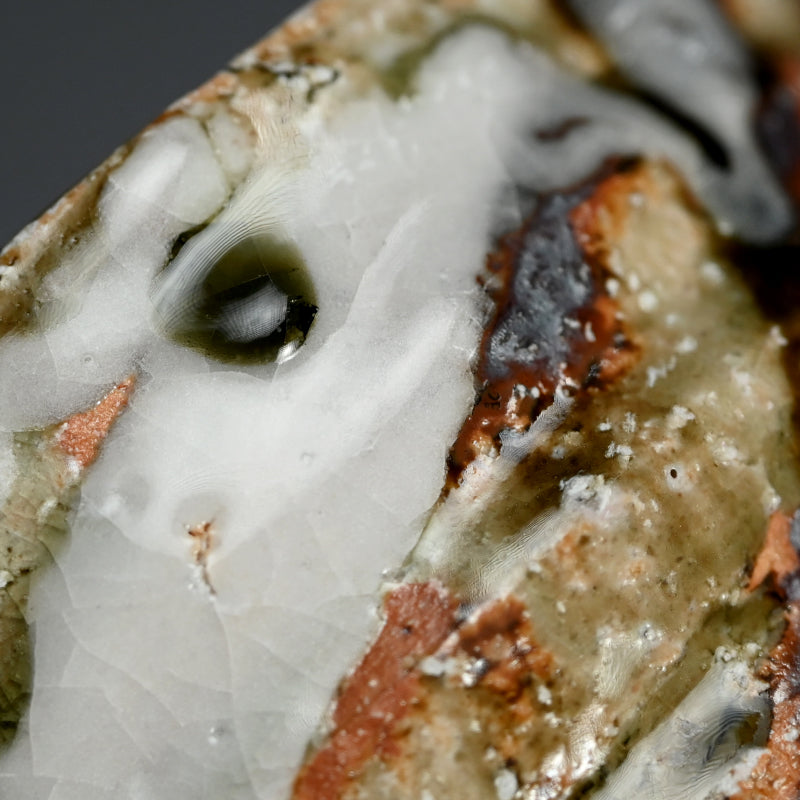 Murakoshi Takuma is one of those enigmas who simply lives to work with clay. He does not seek to make a living through pottery, but through his primal approach has earned a following which keeps his work in high demand. He was born in Aichi prefecture in 1954 and began his stroll down the pottery path in 1980 under the tutelage of Kyoto potter Umehara Takehira. Favoring very rough Shigaraki glaze, he established his own kiln in 1997 in the Kiyomizu pottery district of Kyoto, then moved to Nagaoka in 2002. Although eschewing the world of competitive exhibitions, he has been picked up by many of Japan’s preeminent galleries, including private exhibitions at the prestigious Kuroda Toen of Tokyo’s Ginza District.