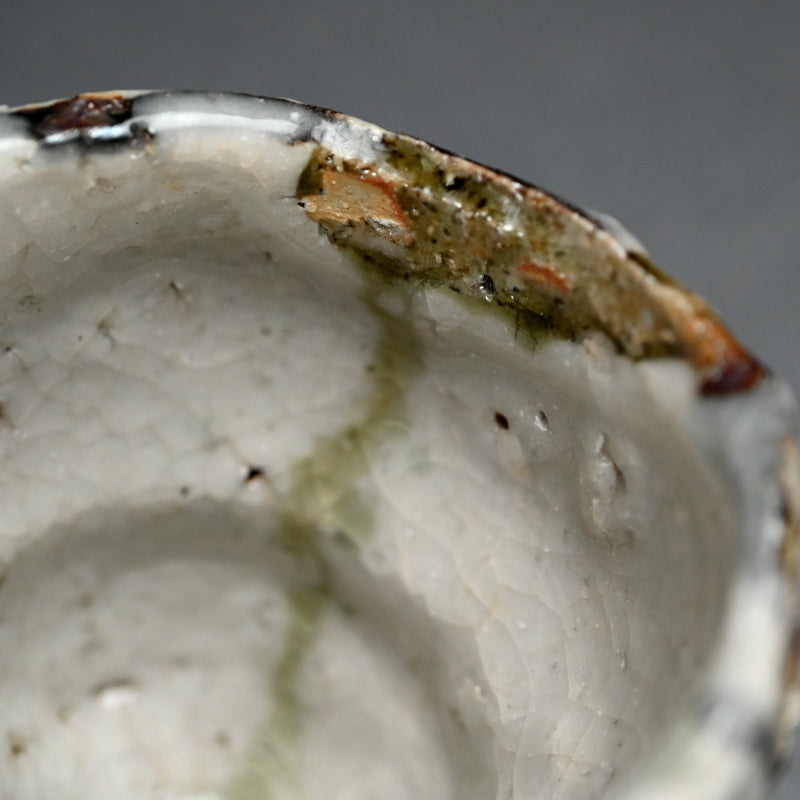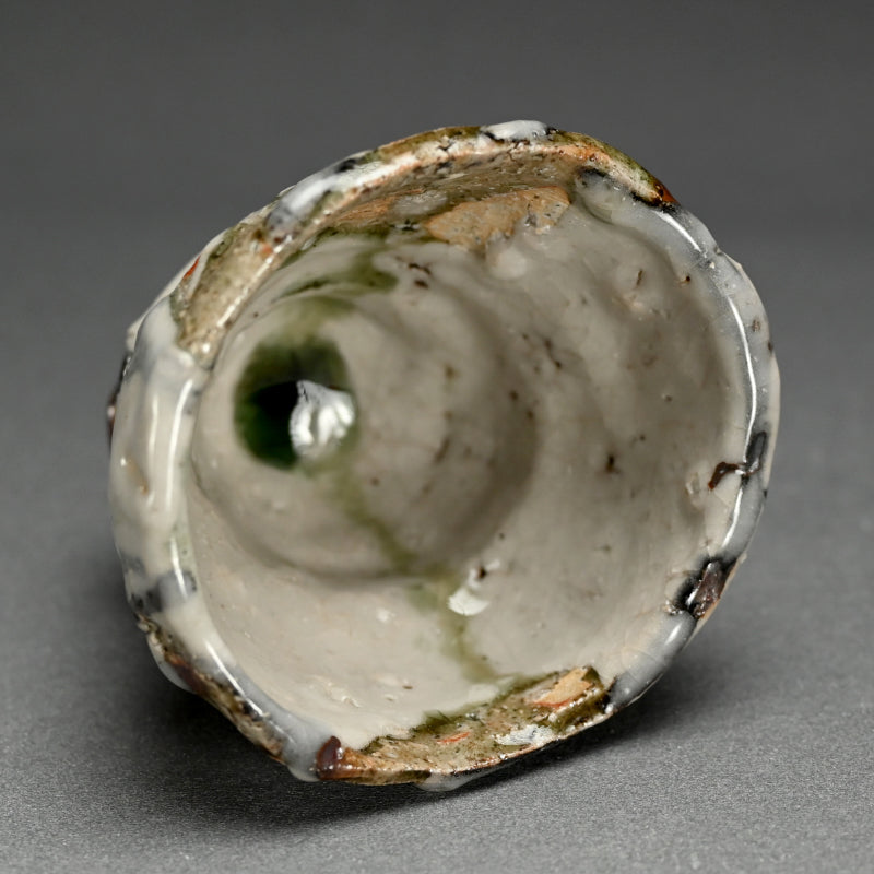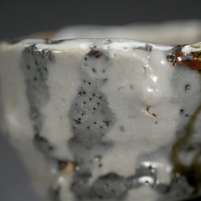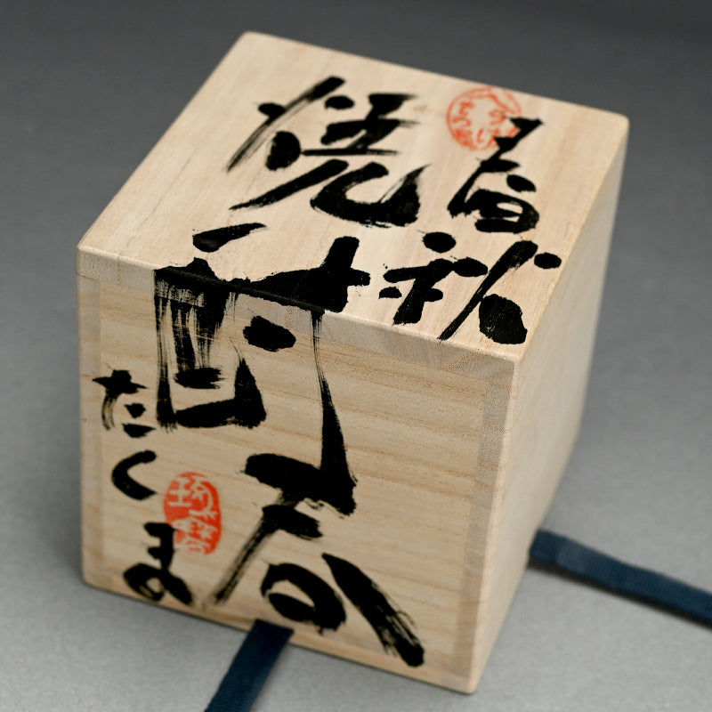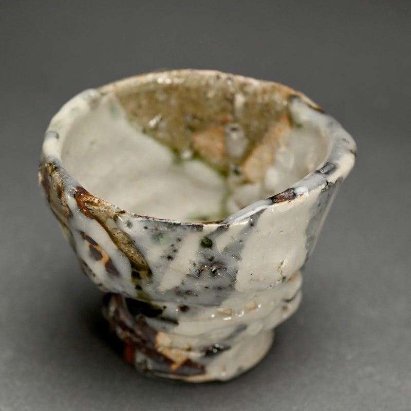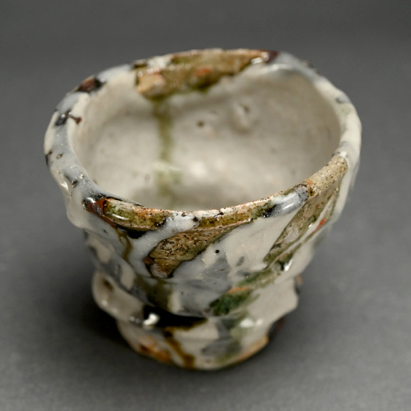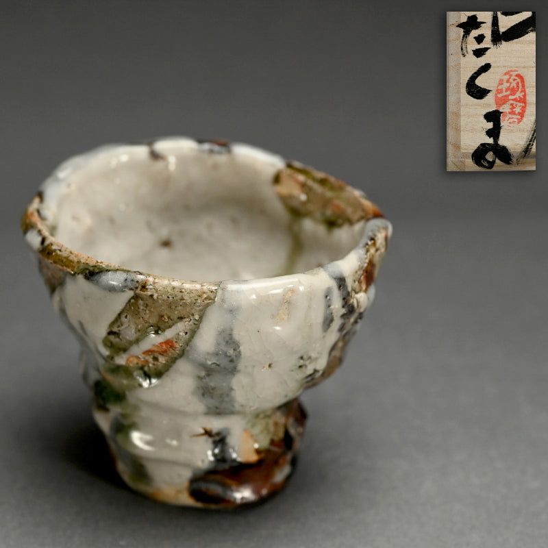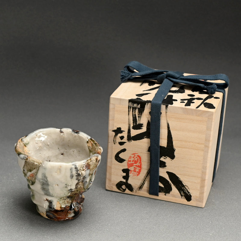 Not just for alcohol, this is perfect for winter tea, a beautifully formed deep cup covered in tri-colored glaze occasionally revealing the rough clay beneath by Murakoshi Takuma enclosed in the original signed wooden box titled Shunju Shochu-nomi. Literally translated Shunju is Spring and Fall, a phrase denoting all the colors of the seasons, and it is the term he has chosen to poetically describe the various colorations of his work. This cup is 11.5 x 10.5 x 9.5 cm (roughly 4-1/2 x 4 x 4 inches) and is in excellent condition, directly from the artist.