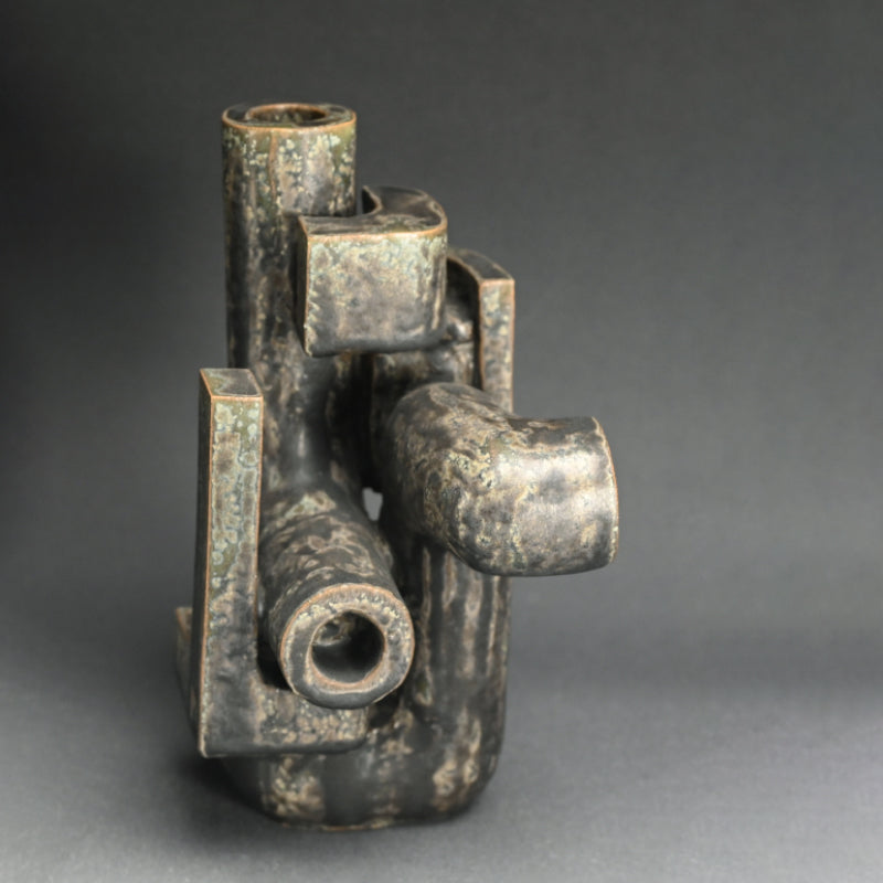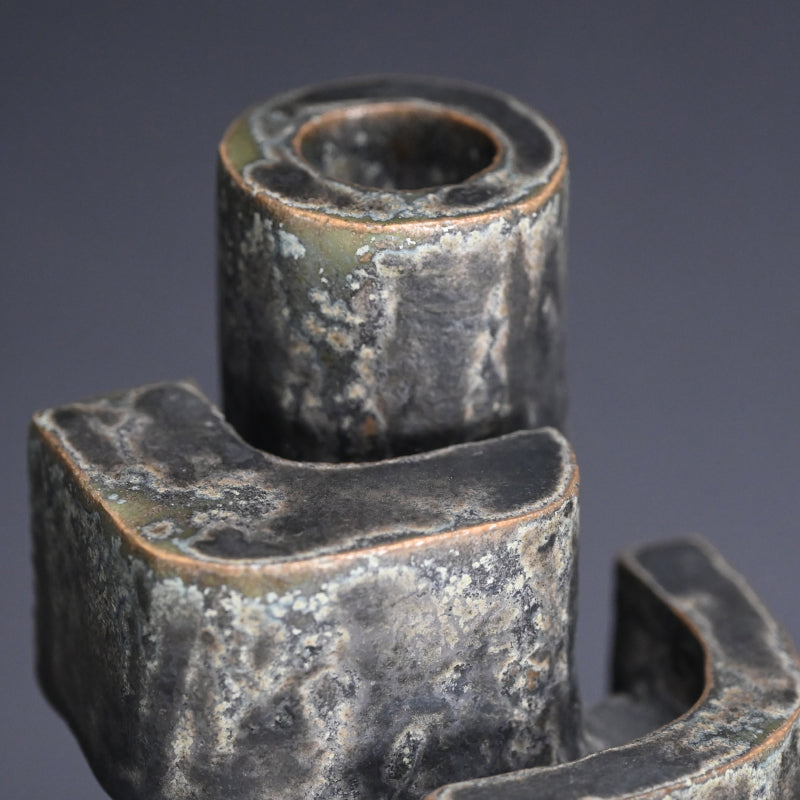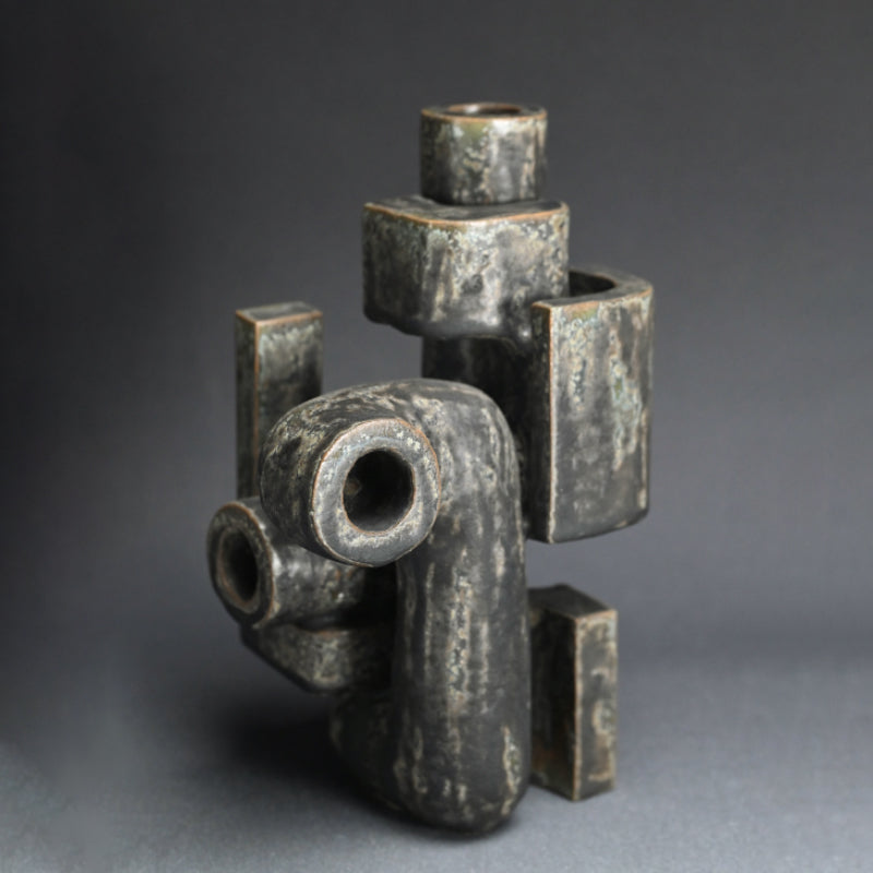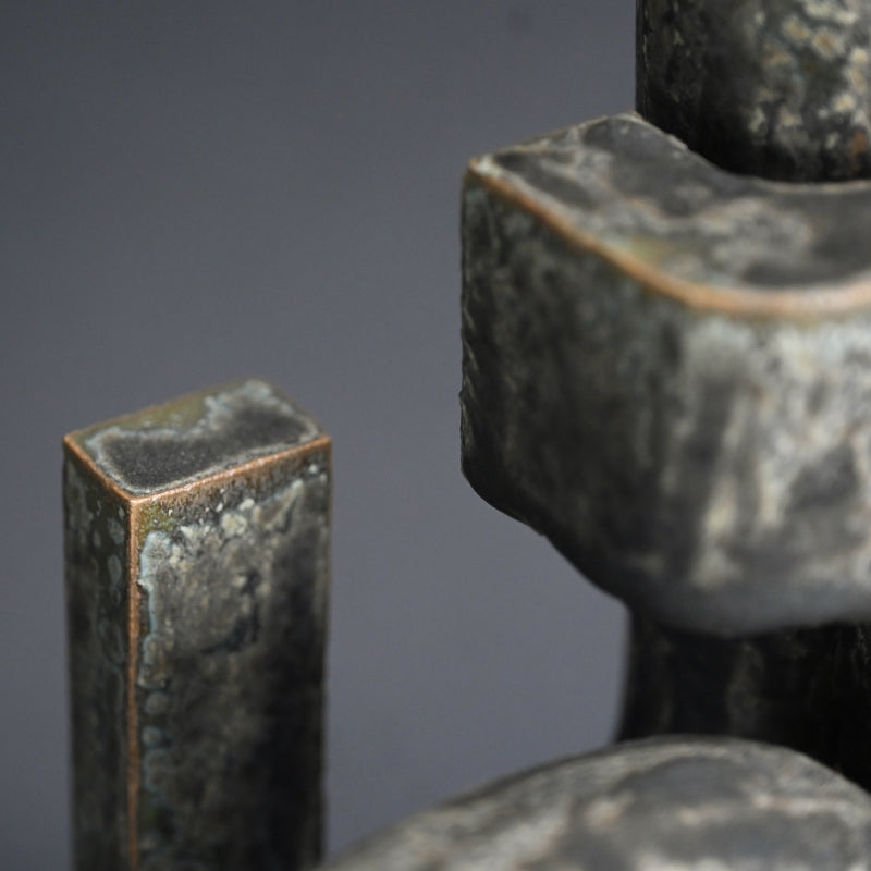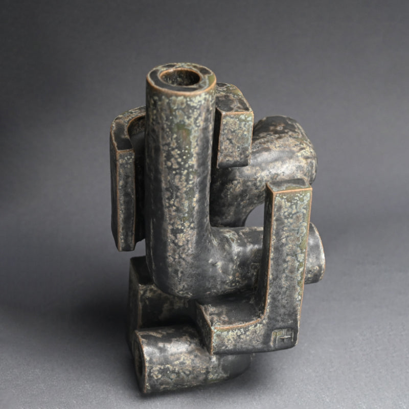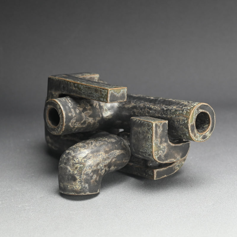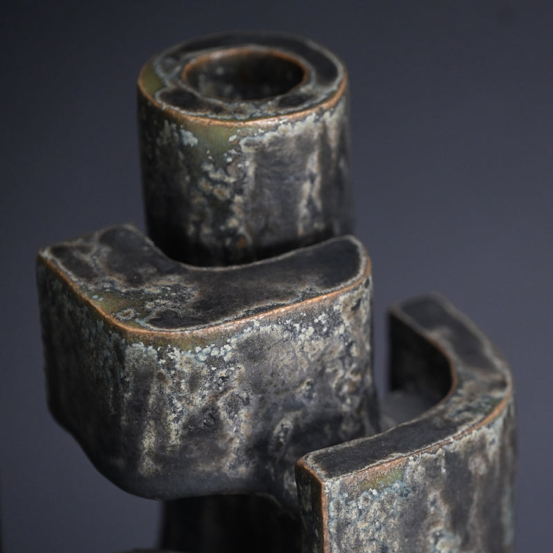 Although imbued with the rustic sheen of metal, Sugitani’s works are in fact creations in Shigaraki clay that are hand-built into interlocking forms that are almost Escher-esque in their simple complexity. After blending a base white clay, the artist begins the rigorous process of hand-coiling his sculptures into the forms in his mind’s eye. After carving and smoothening the surfaces, the artist bisque-fires the work. Sugitani applies an original glaze that is rich in copper, and after a main firing in his gas-kiln, imbues his works with the distinctive patina of rusted metal. (Ceramics Now Magazine).