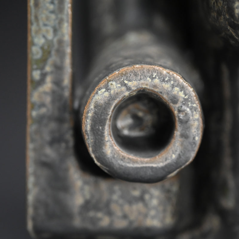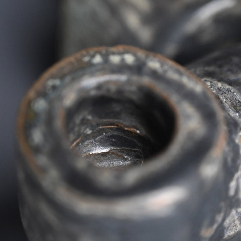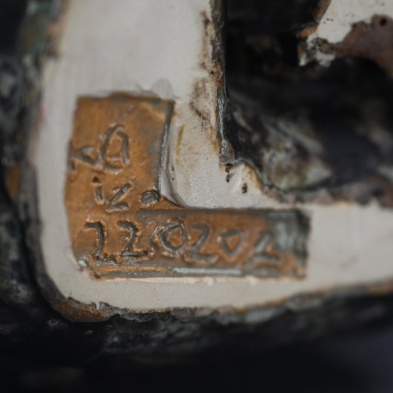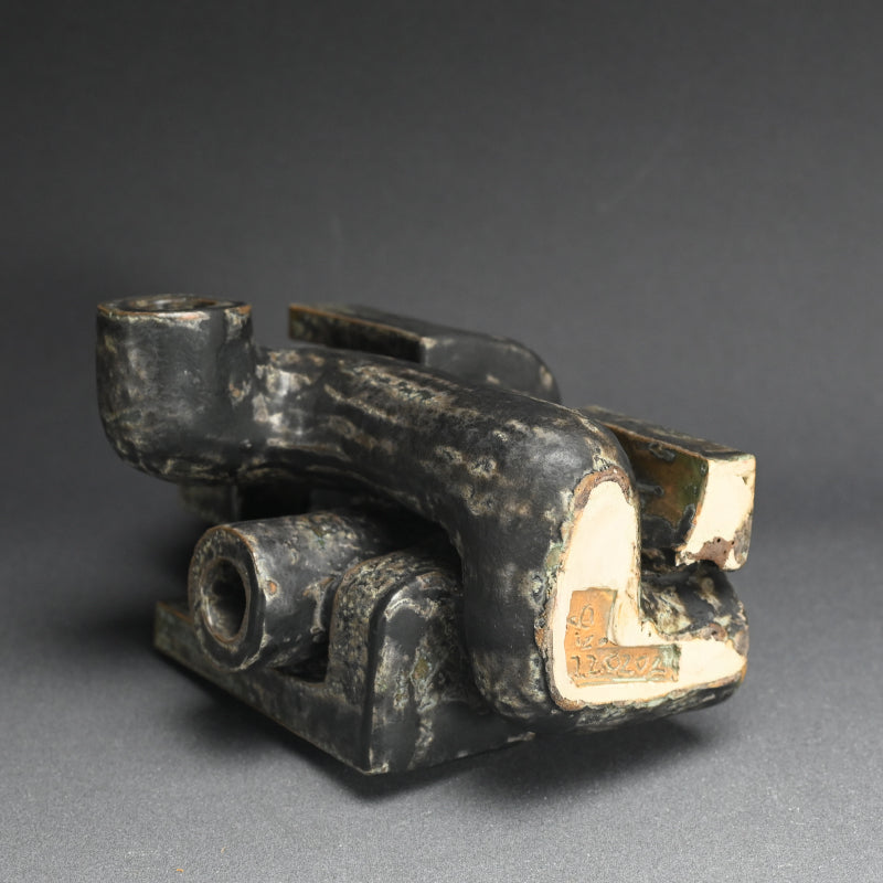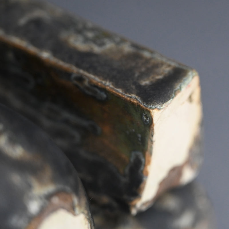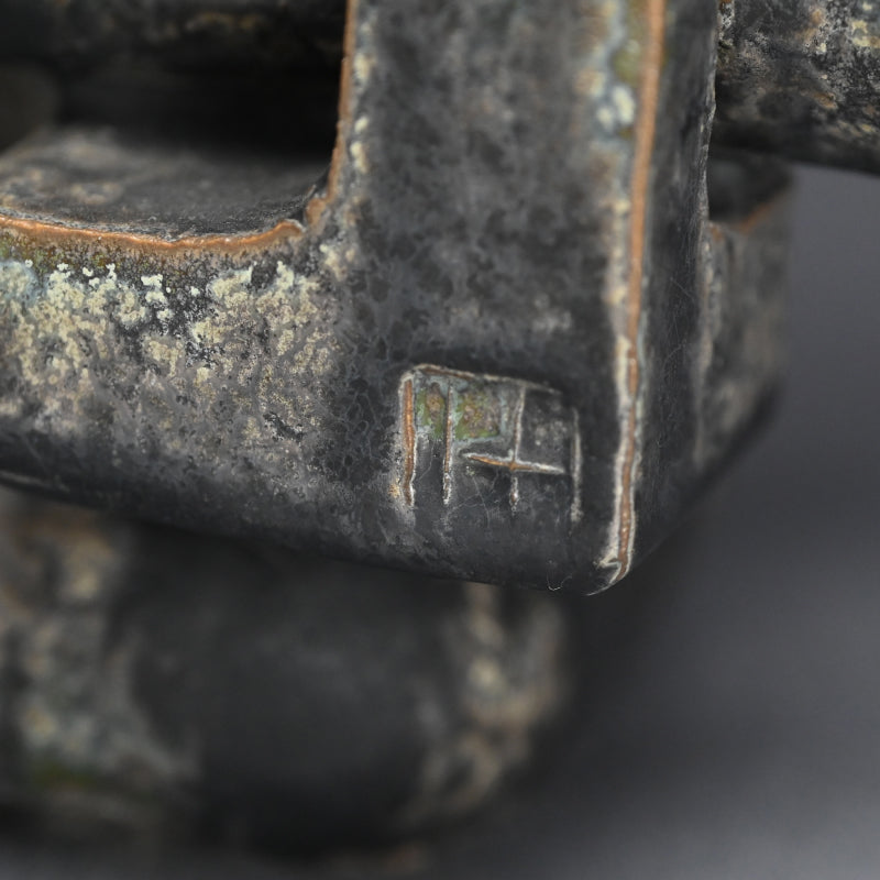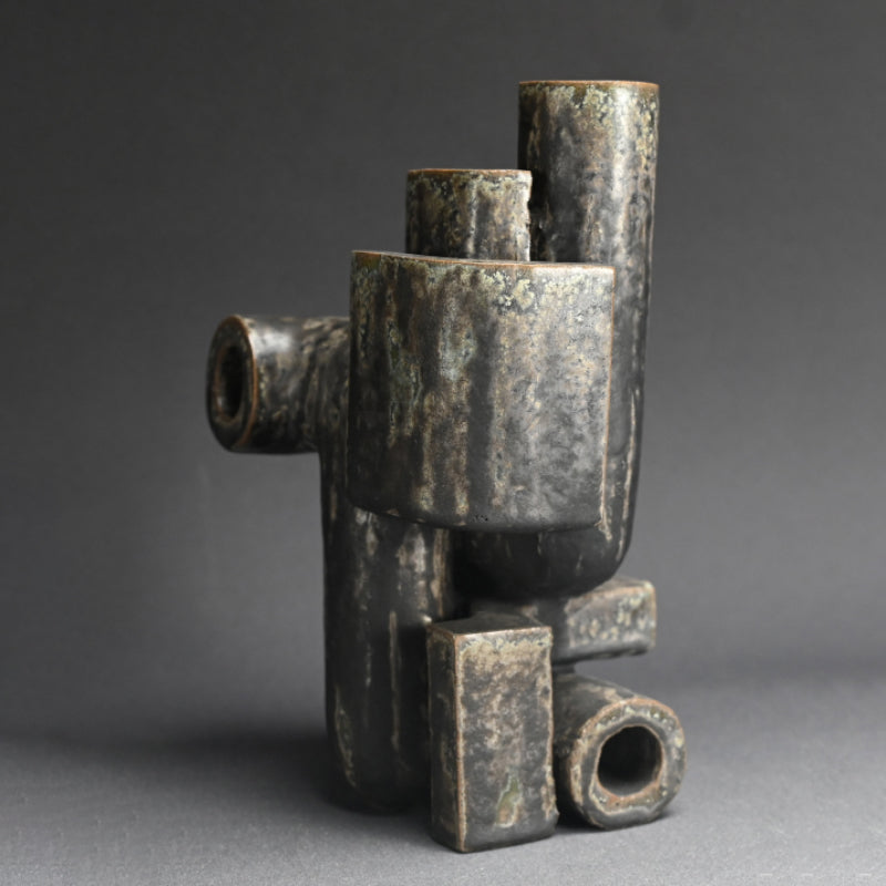 Although imbued with the rustic sheen of metal, Sugitani’s works are in fact creations in Shigaraki clay that are hand-built into interlocking forms that are almost Escher-esque in their simple complexity. After blending a base white clay, the artist begins the rigorous process of hand-coiling his sculptures into the forms in his mind’s eye. After carving and smoothening the surfaces, the artist bisque-fires the work. Sugitani applies an original glaze that is rich in copper, and after a main firing in his gas-kiln, imbues his works with the distinctive patina of rusted metal. (Ceramics Now Magazine).