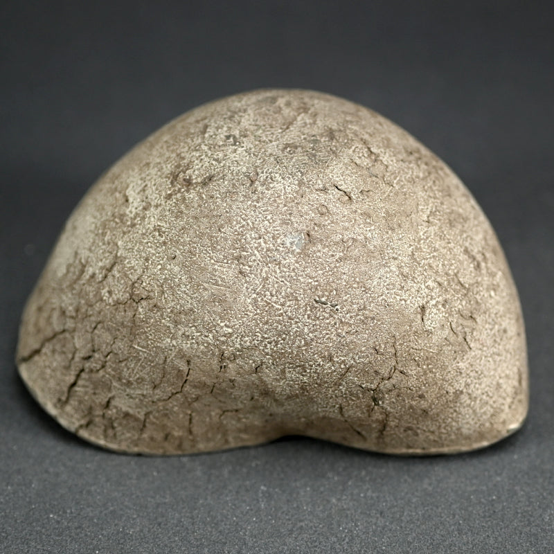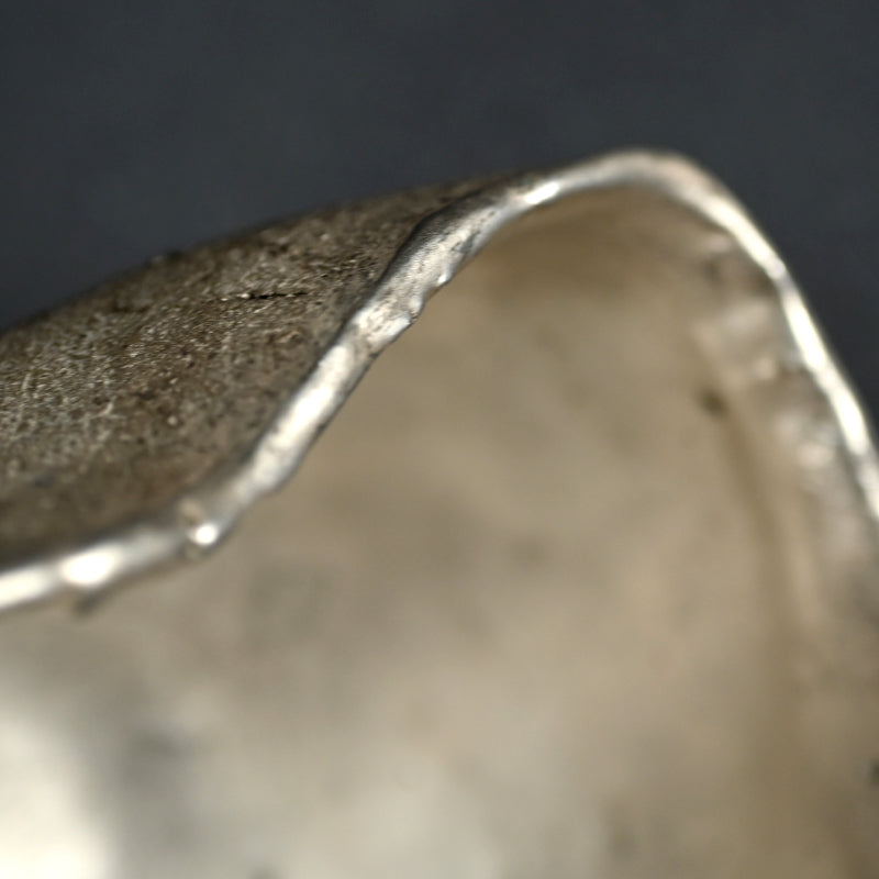 A silver colored bean shaped bowl by Ogawa Machiko enclosed in the original signed wooden box titled simply Utsuwa (vessel). It is 14 x 10 x 7.5 cm (5-1/2 x 4 x 3 inches) and is in perfe3ct condition.
