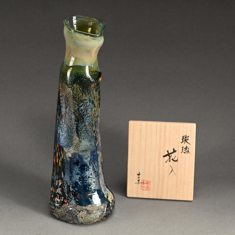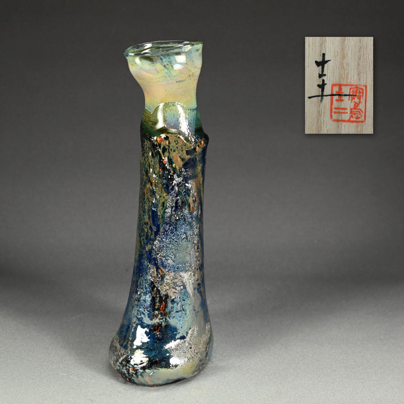 A rare large vase by Okushima Keiji of colored and oxidized glass infused with silver enclosed in the original signed wooden box titled Hari Hana-ire. It is 11.5 cm (4-1/2 inches) diameter, 35 cm (16 inches) tall and in excellent condition, directly from the artist this year.