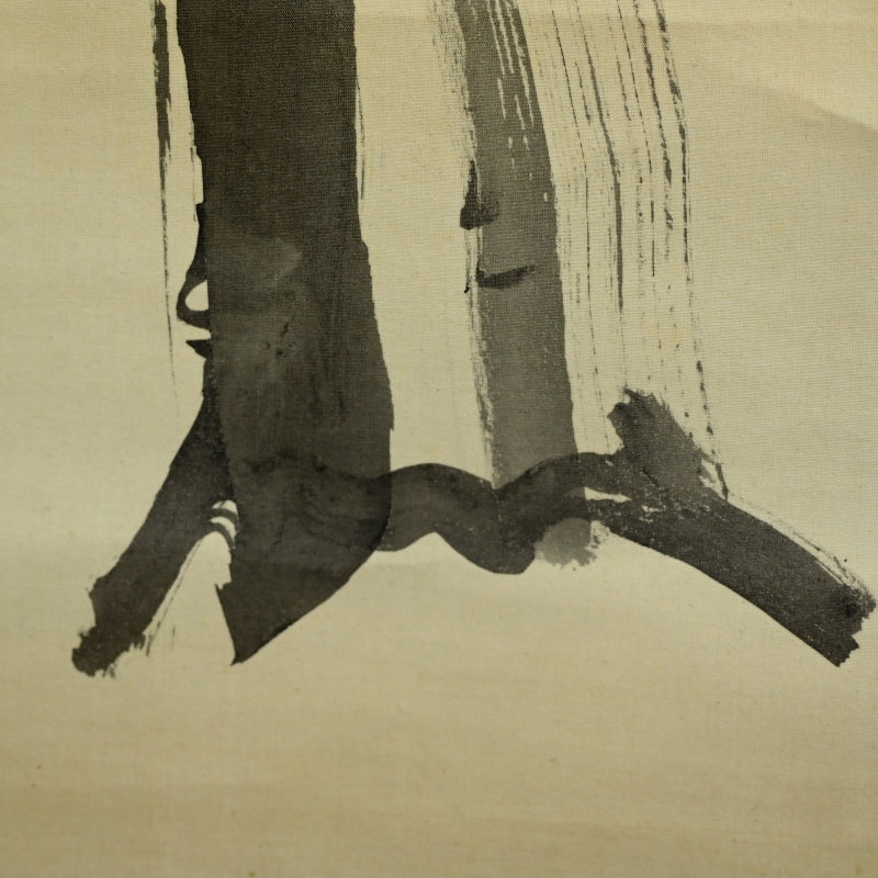 The silhouette of a crow hunched on the leafless branches of a dead tree under the full moon by Shoji Chikushin enclosed in the original signed wooden box titled Gekka Tori no Zu. Ink on silk in a pale cloth border with ivory rollers (these will be changed for export). The scroll is 48 x 193 cm (19 x 76 inches) and is in overall excellent condition.