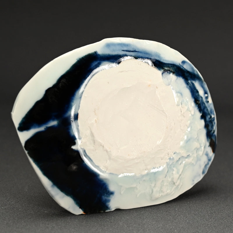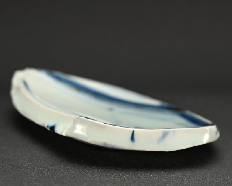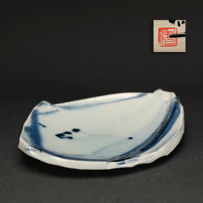 A small shard slab decorated with indigo by Kato Tsubusa enclosed in the original signed wooden box. It is perfect for serving Wagashi Japanese sweets before tea. The dish measures 16 x 12 x 3cm (6 x 5 x 1 inches) and is in perfect condition, directly from the artist.