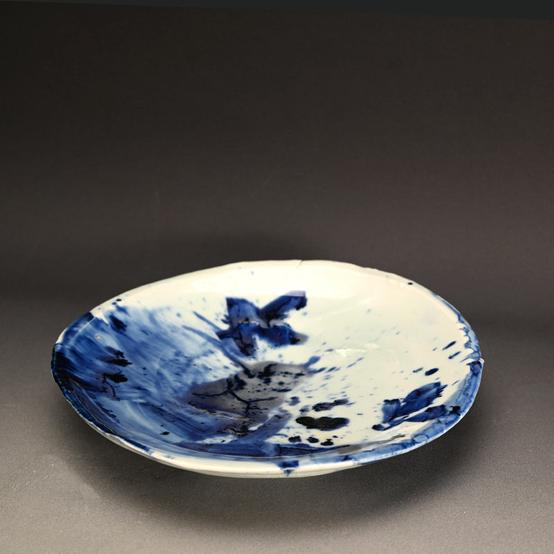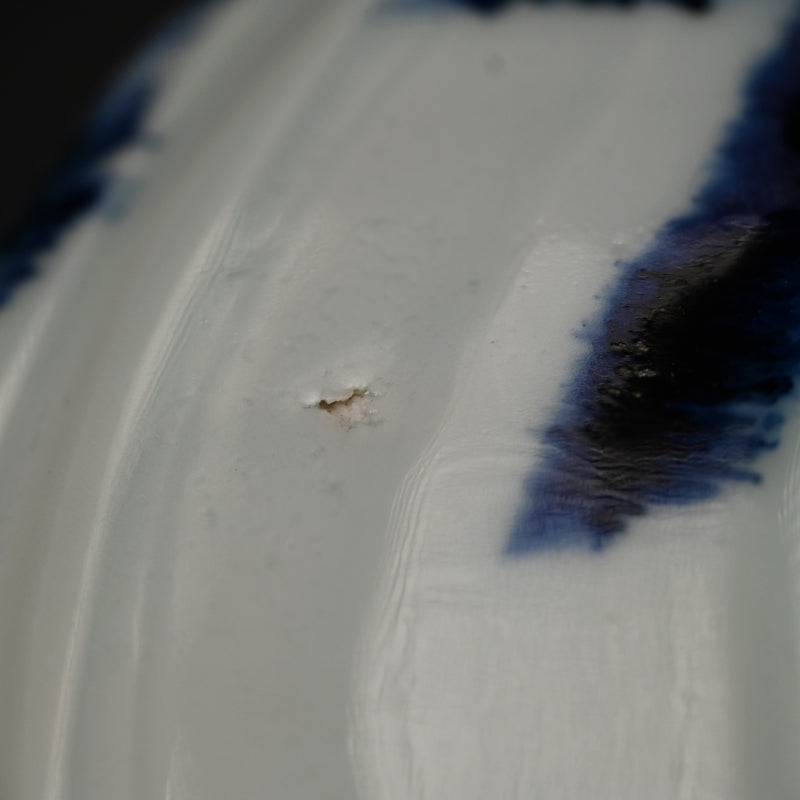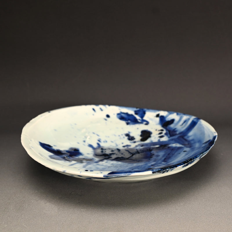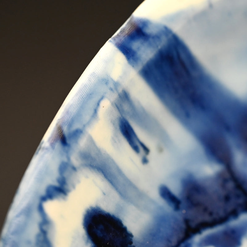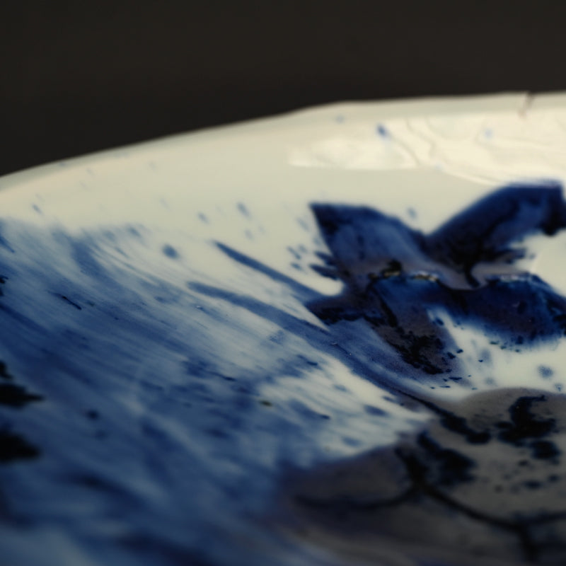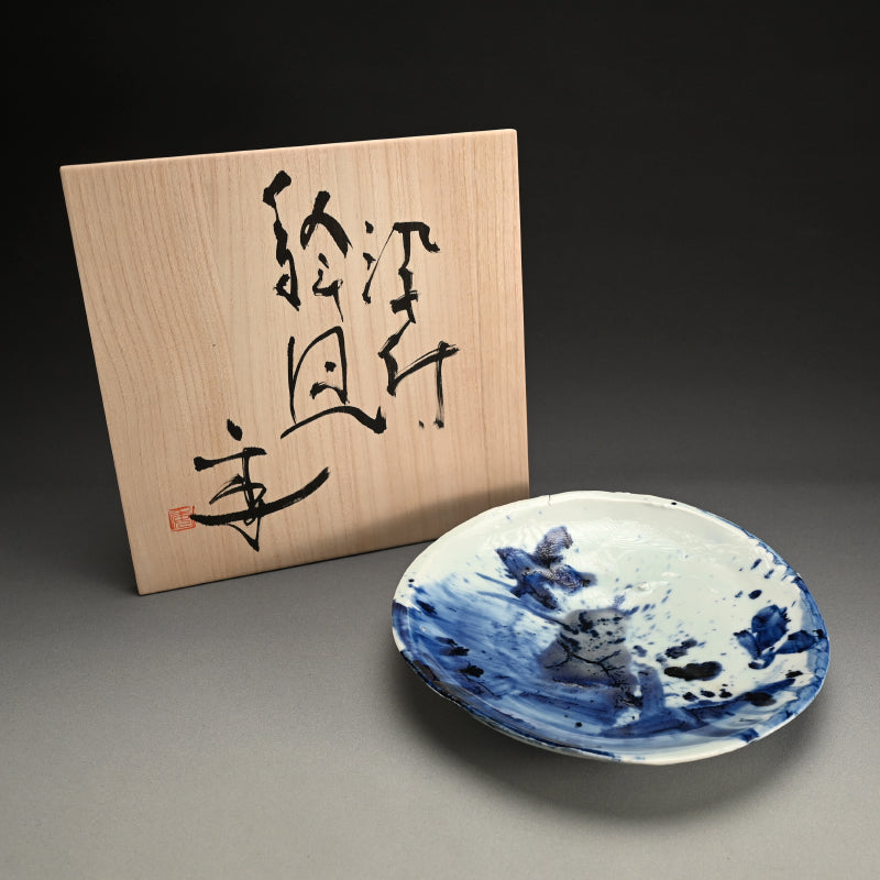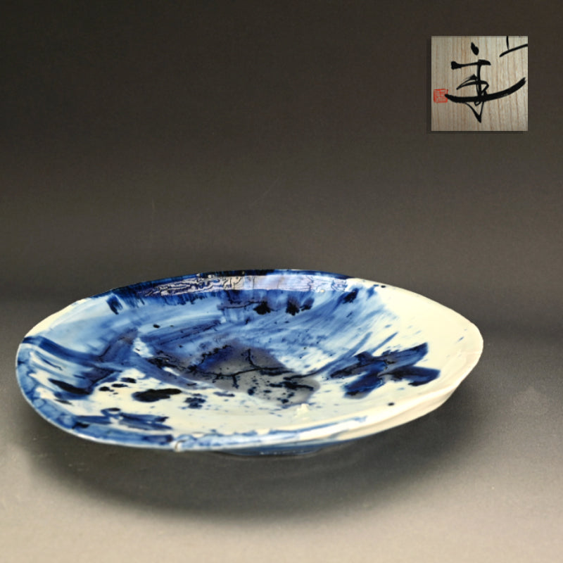 Dramatic Rorschach blots of blue splash on the white porcelain surface of this large platter by Kato Tsubusa enclosed in the original signed wooden box.  It is roughly 39 cm (15-1/2 inches) diameter, 7.5 cm (3 inches) tall and is in perfect condition, directly from the artist this summer.