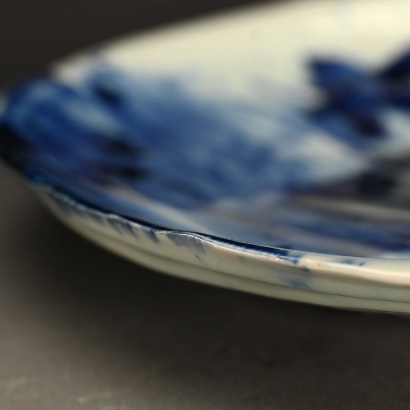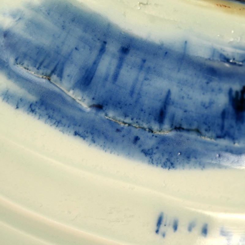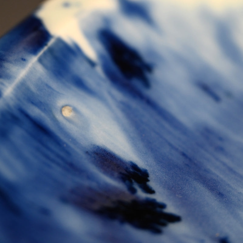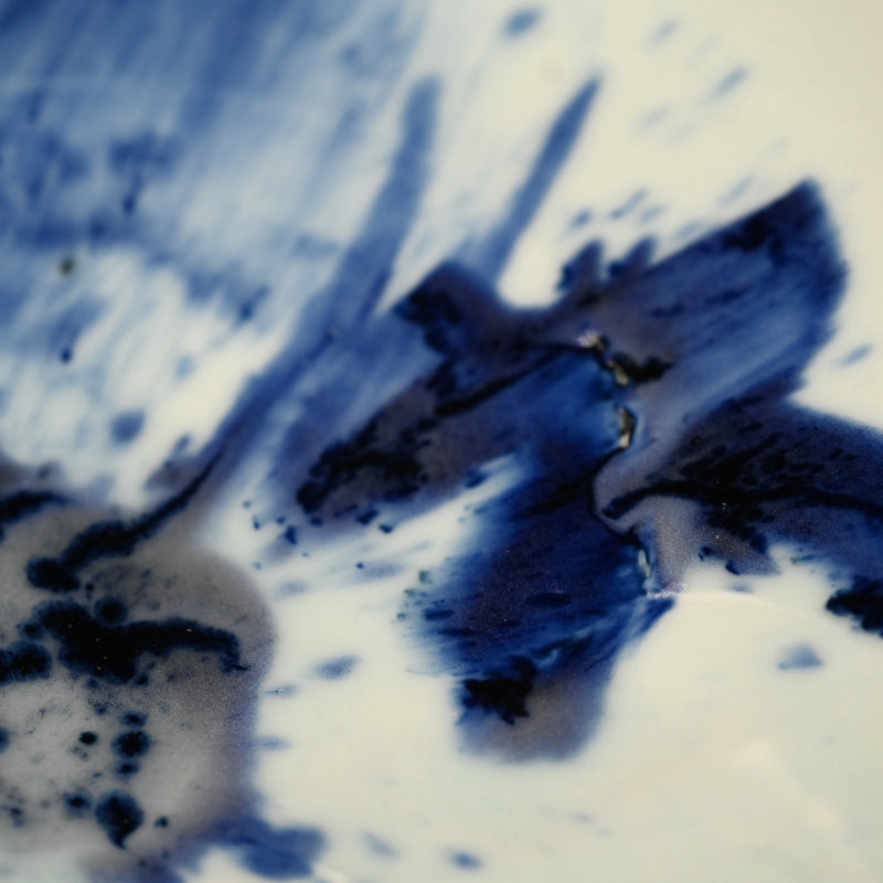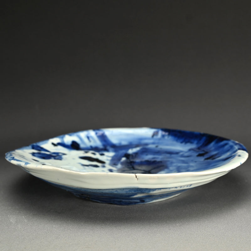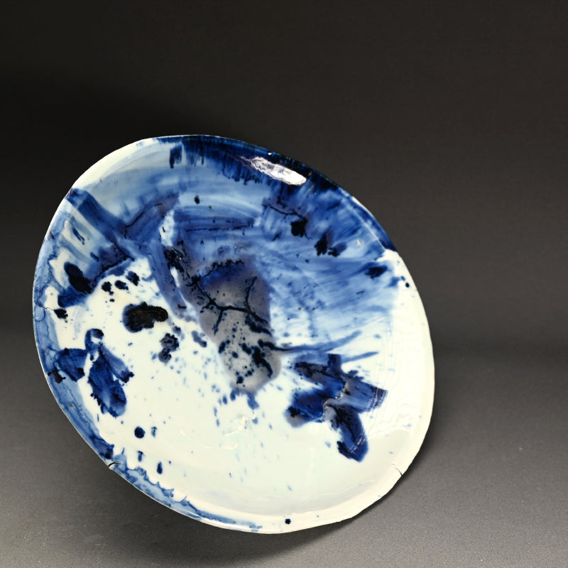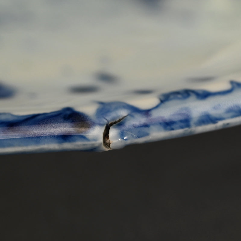 Dramatic Rorschach blots of blue splash on the white porcelain surface of this large platter by Kato Tsubusa enclosed in the original signed wooden box.  It is roughly 39 cm (15-1/2 inches) diameter, 7.5 cm (3 inches) tall and is in perfect condition, directly from the artist this summer.