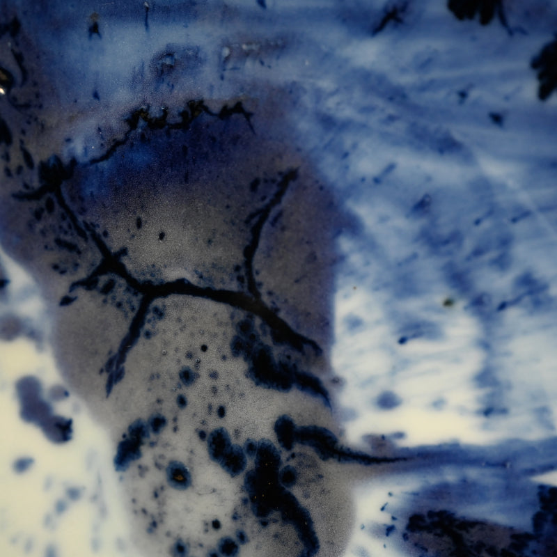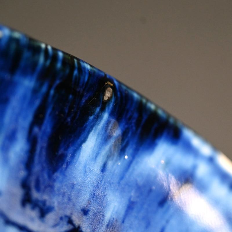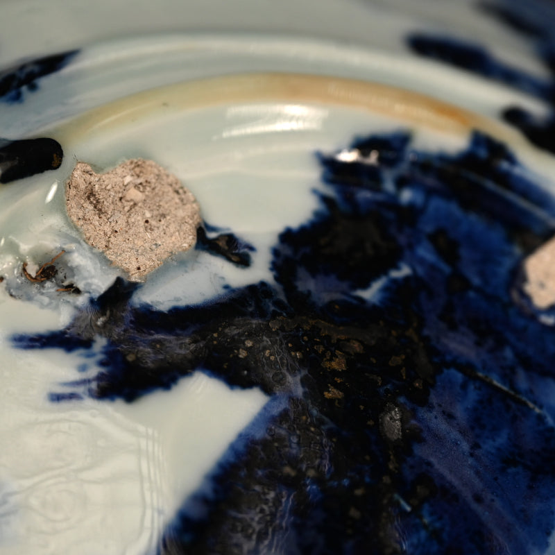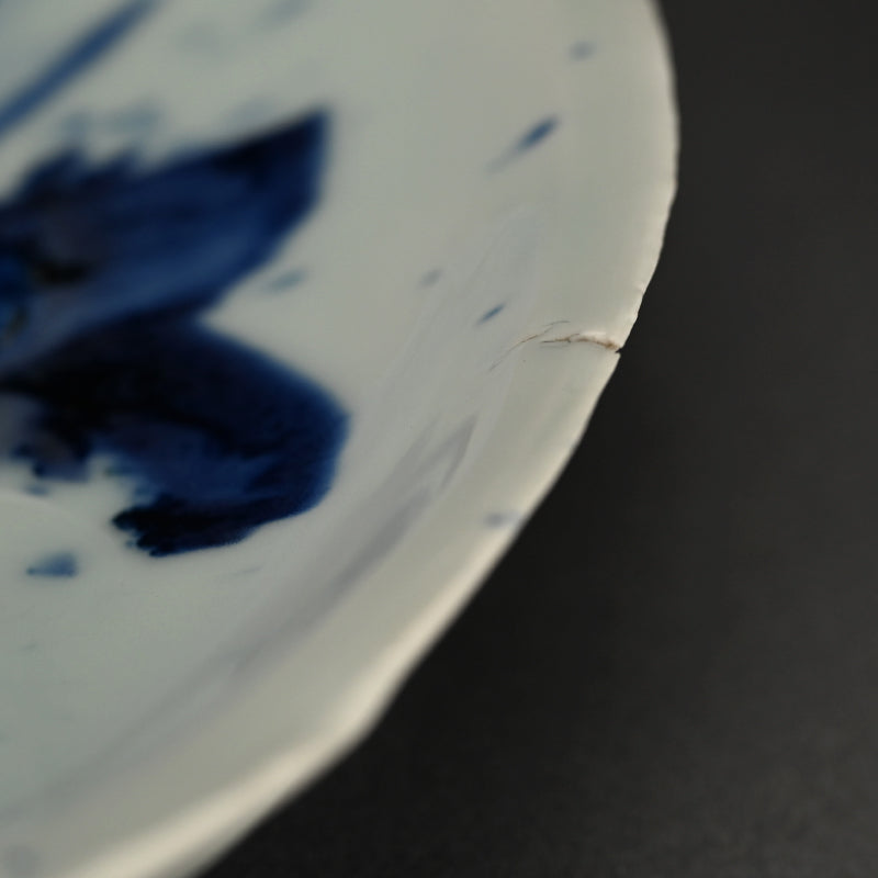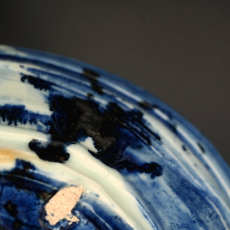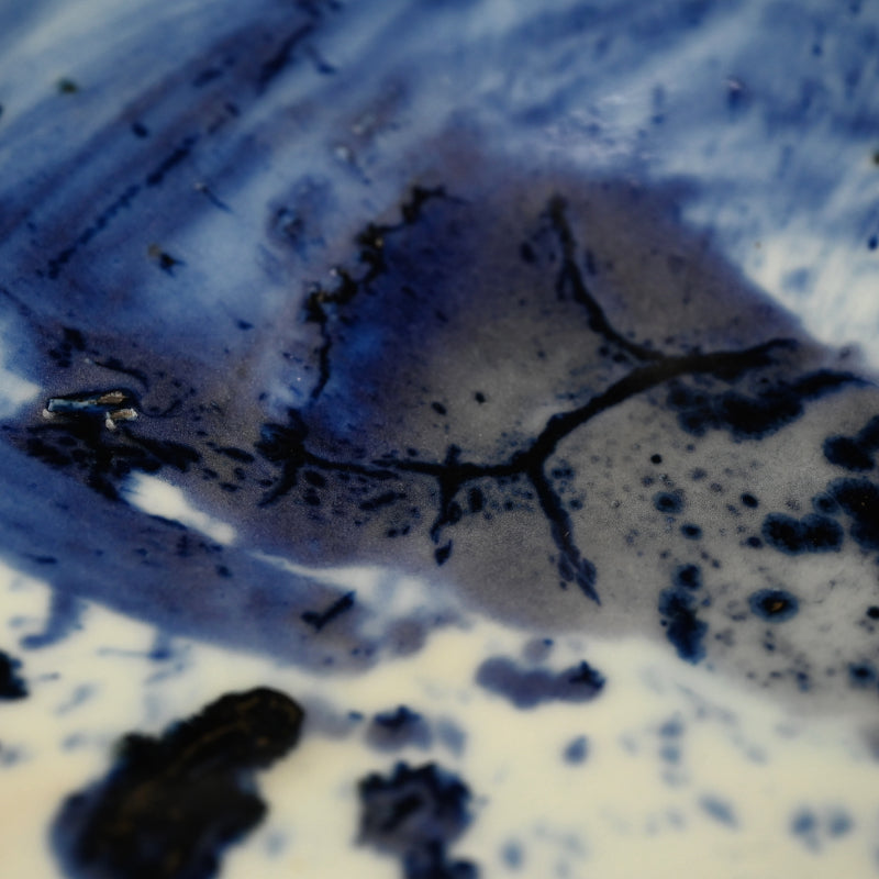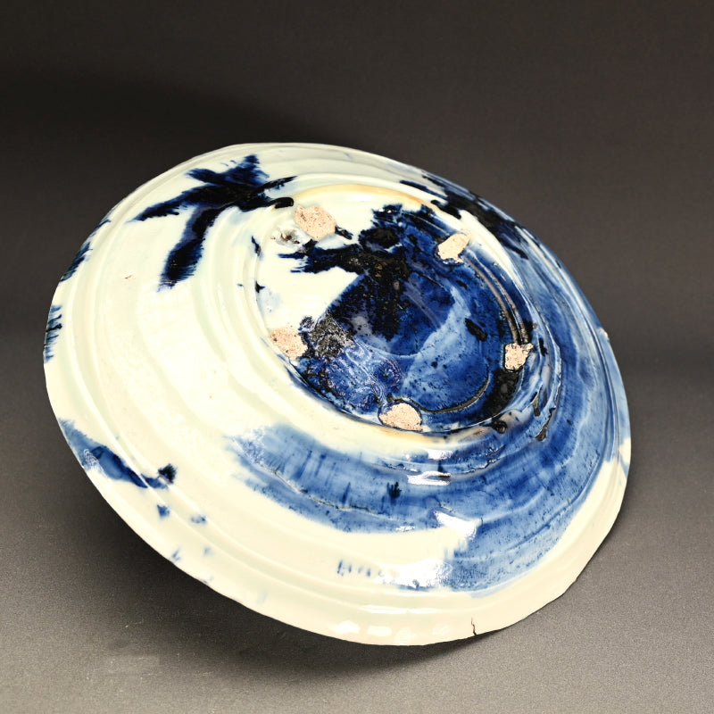 Dramatic Rorschach blots of blue splash on the white porcelain surface of this large platter by Kato Tsubusa enclosed in the original signed wooden box.  It is roughly 39 cm (15-1/2 inches) diameter, 7.5 cm (3 inches) tall and is in perfect condition, directly from the artist this summer.
