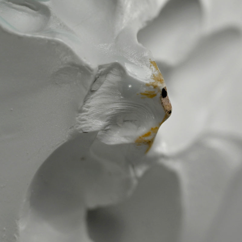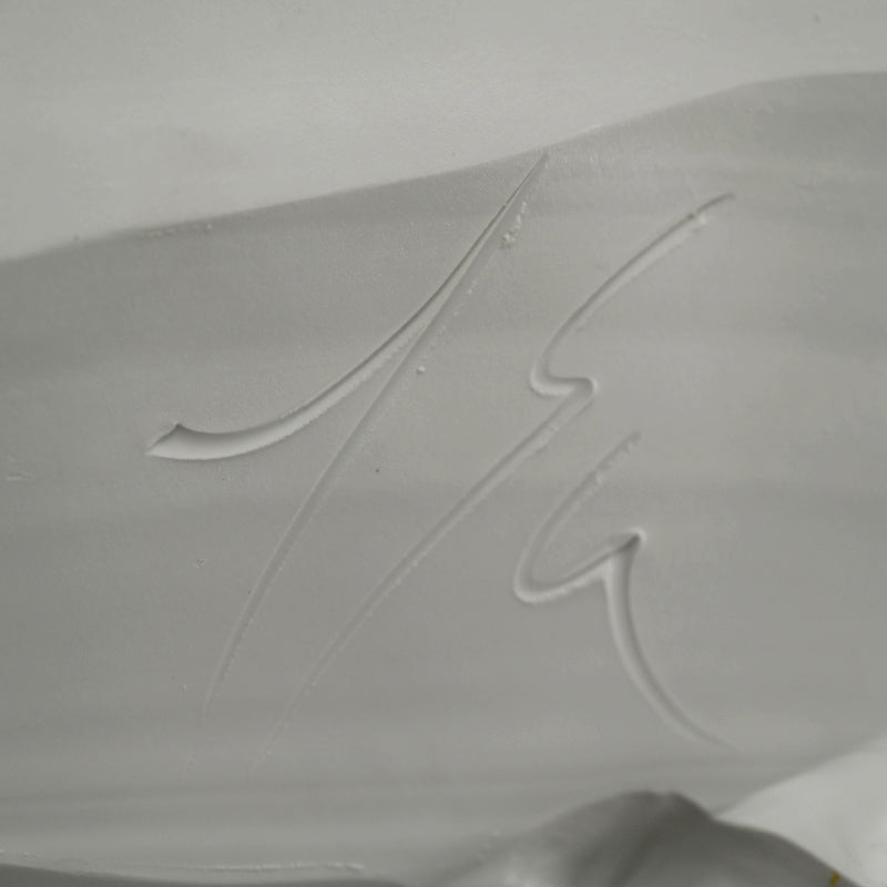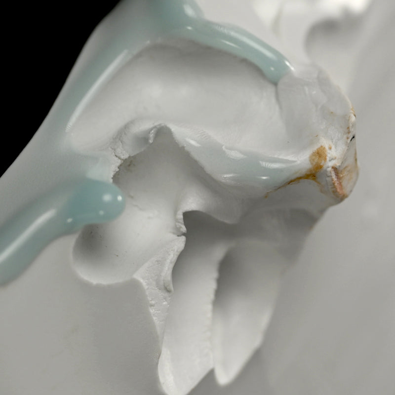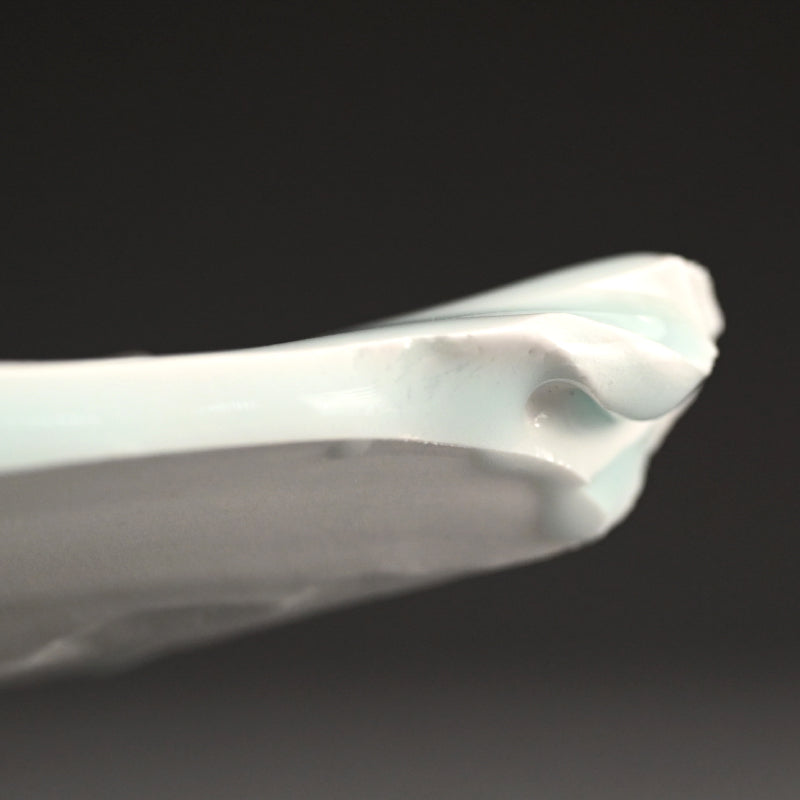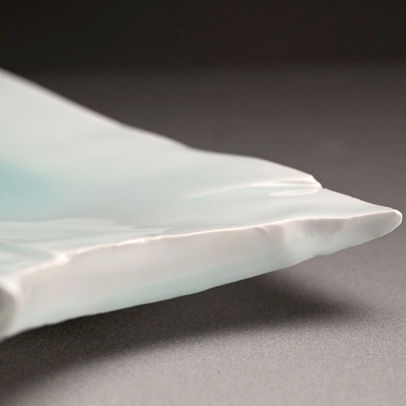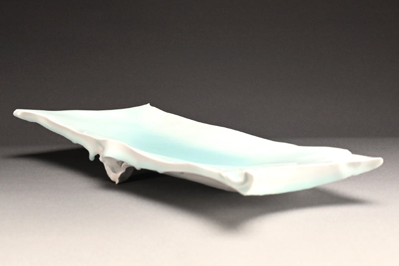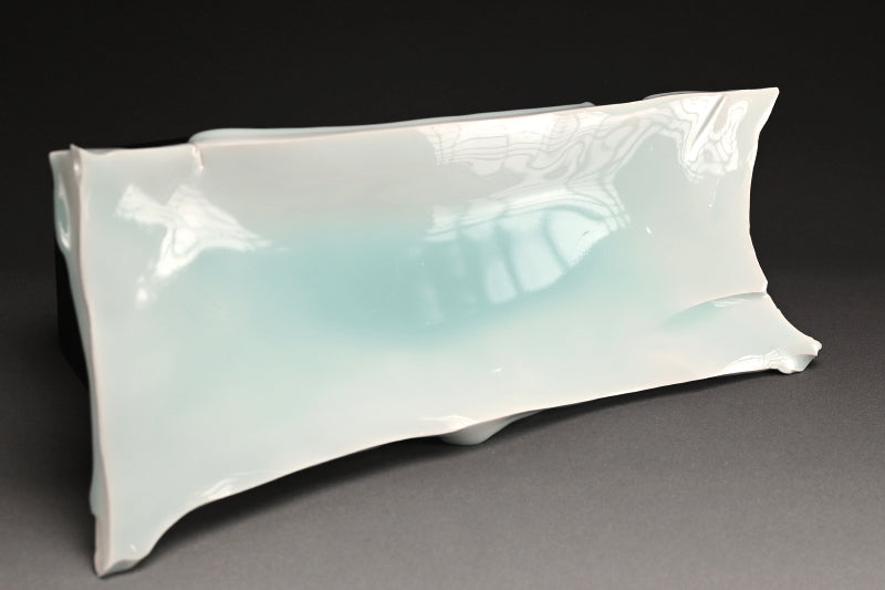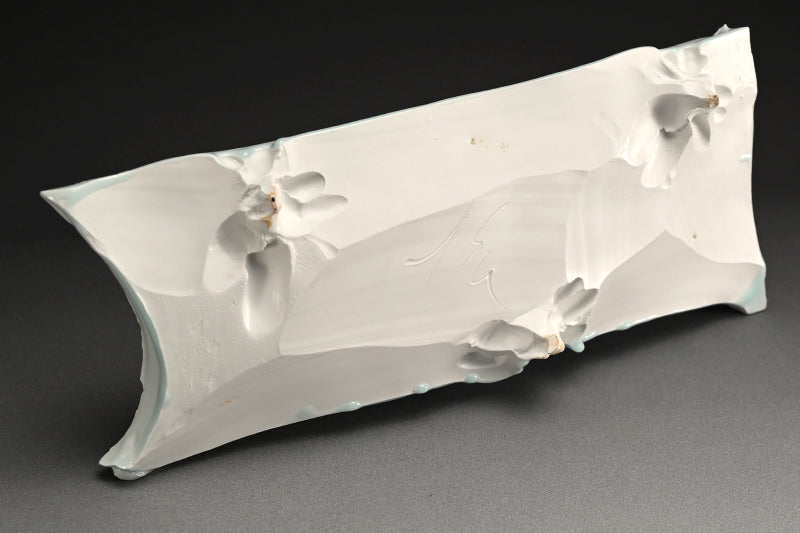 A spectacular elongated form rent from white porcelain clay covered in pale icy glaze by Kato Tsubusa enclosed in the original signed wooden box. This is a splendid and yet functional example of this artists work. It is 50.5 x 22 x 7 cm (20 x 9 x 3 inches) and is in perfect condition, directly from the artist this summer.