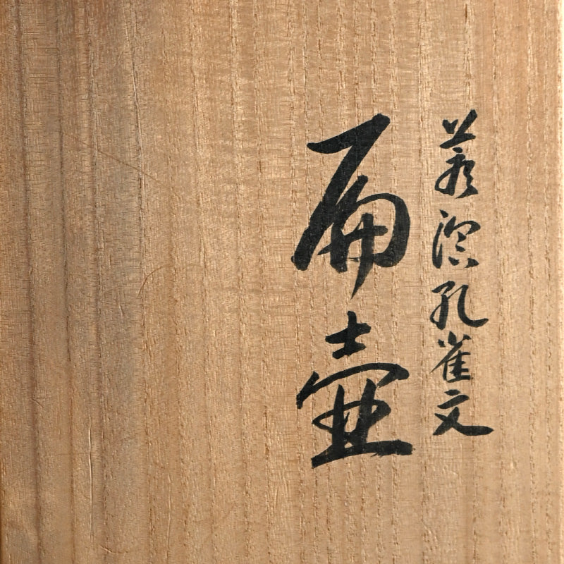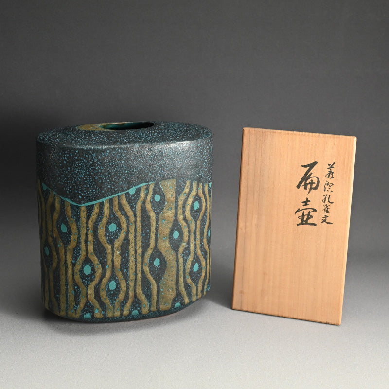 A masterpiece by contemporary ceramic legend Morino (Hiroaki) Taimei enclosed in the original signed wooden box showing his famous Kujaku (Peacock) design. It is 27 x 14.5 x 30.5 cm (6 x 11 x 12 inches) and is in excellent condition.