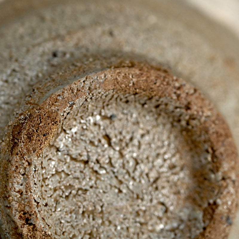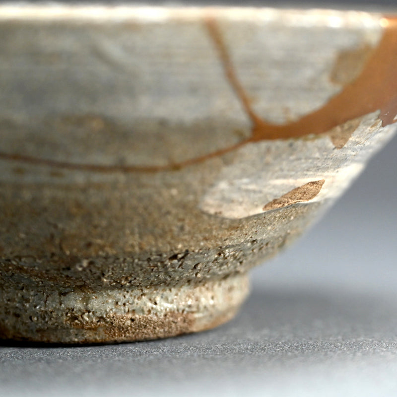 A flaring Edo period Hakeme bowl exquisitely repaired with vivid gold where the side has once been severely damaged. The sand-textured clay is revealed about the rim where the glaze has been worn away with time and use. The foot is masterfully crafted from a dark iron rich clay, likely from the Karatsu region. The workmanship is incredible. The bowl is 16.5 cm (6-1/2 inches) diameter and stands 7 cm (3 inches) tall.