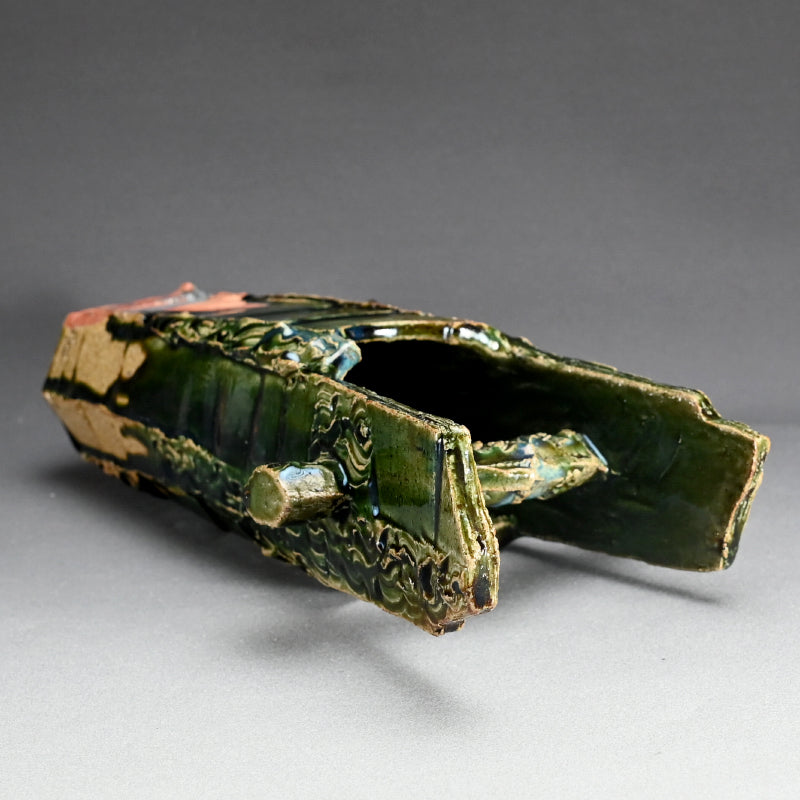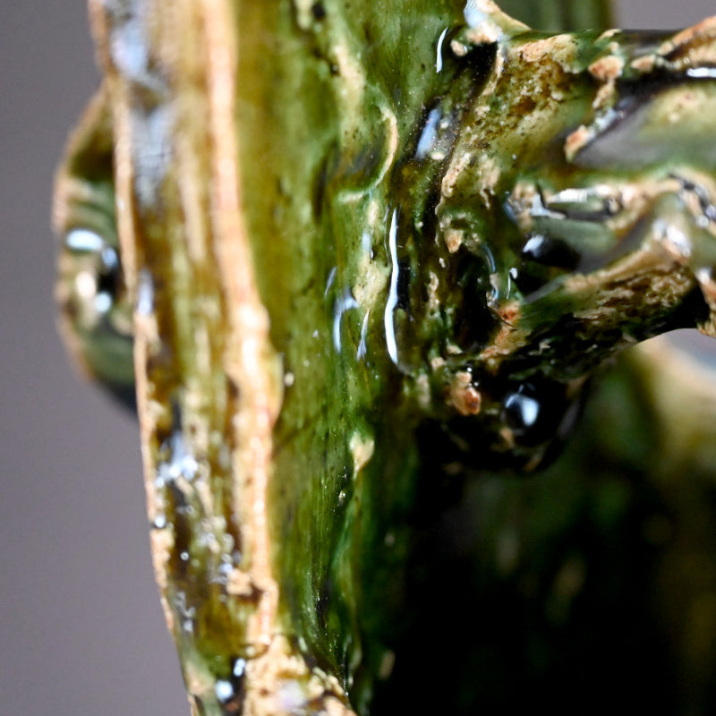 A striking large vessel in rich Oribe green by Takauchi Shugo enclosed in the original signed wooden box titled Otibe Te-tsuki Oke Kaki. It is 25 x 13 x 47 cm (10 x 5-1/4 x 18-1/2 inches) and is in excellent condition.