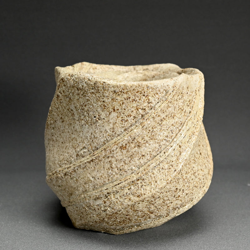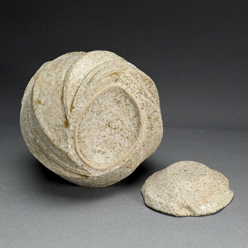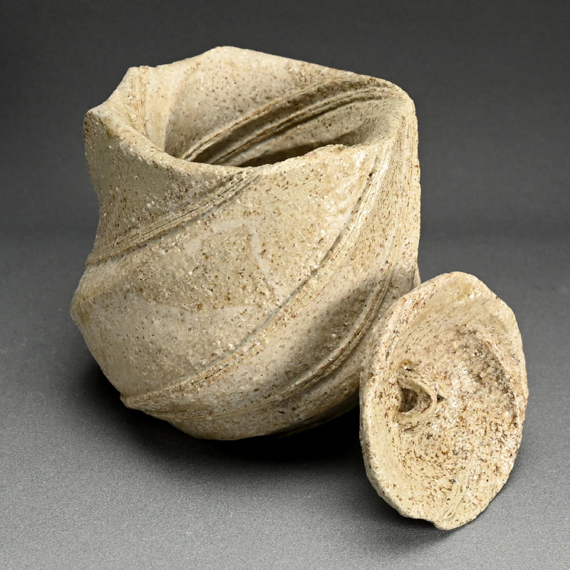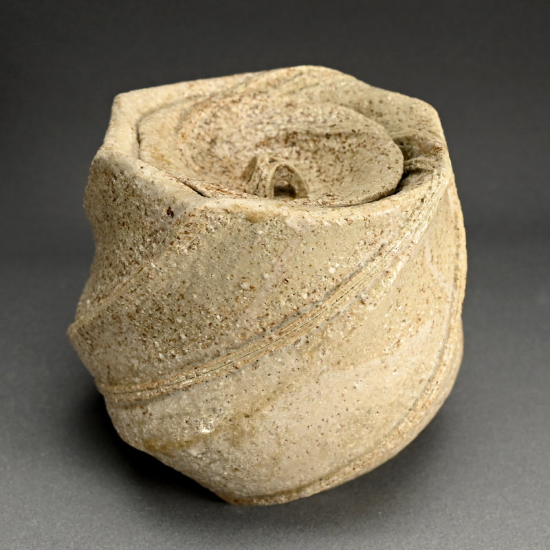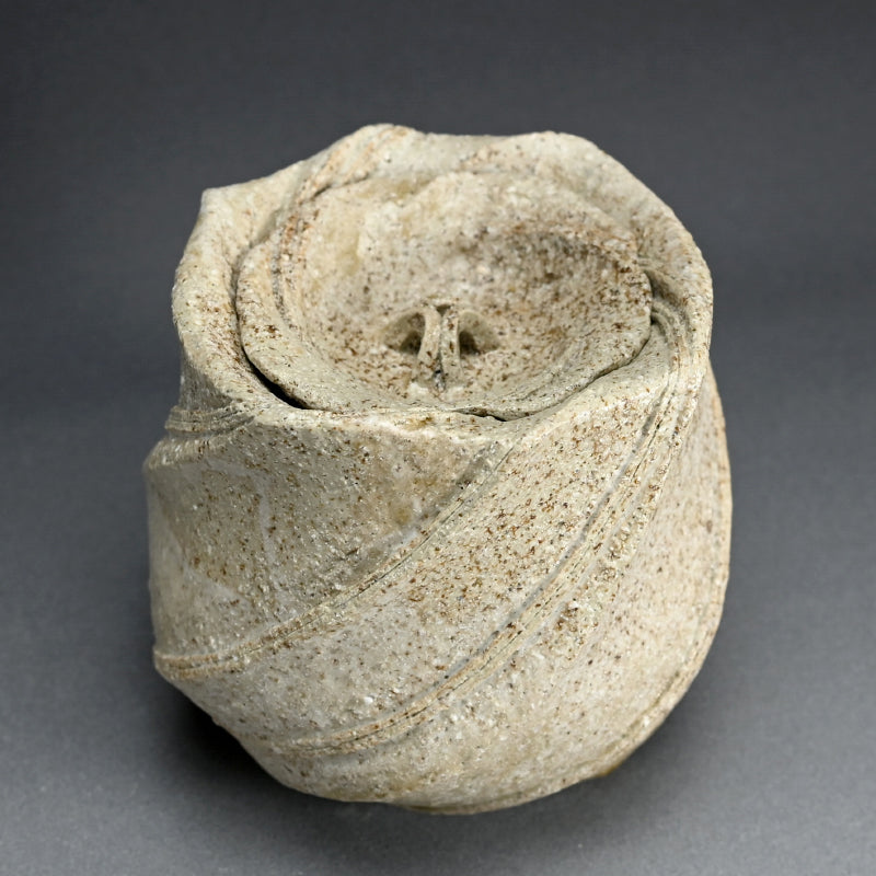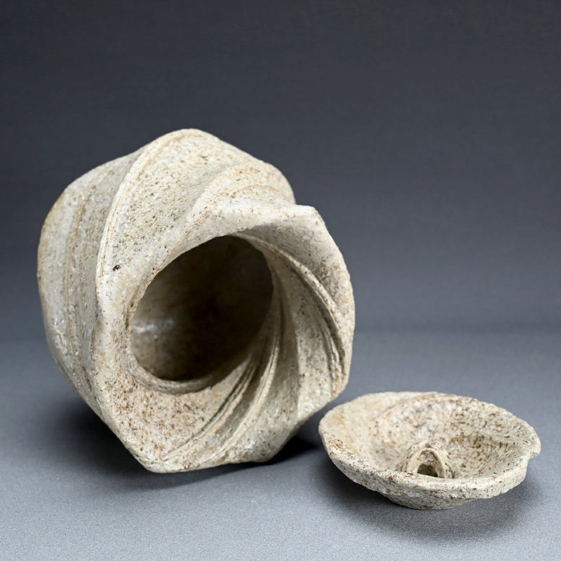 A spectacular spiraling water jar with the original ceramic lid by Sakiyama Takayuki in his signature sandy clay enclosed in the original signed wooden box titled Choto (Sound Wave). It is 18.6 cm (7-1/4 inches) diameter, 16.4 cm (6-1/2 inches) tall and in perfect condition.