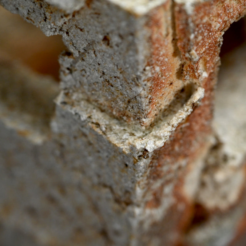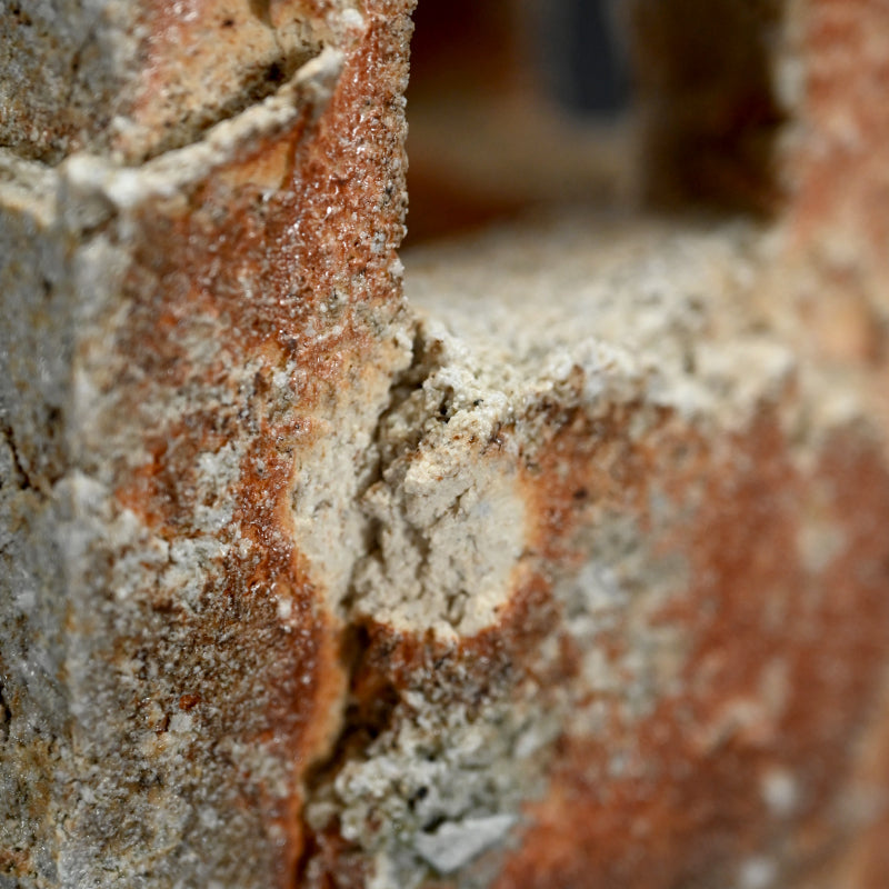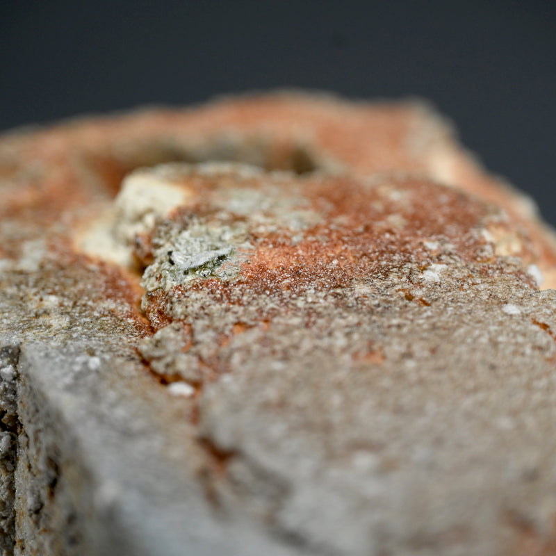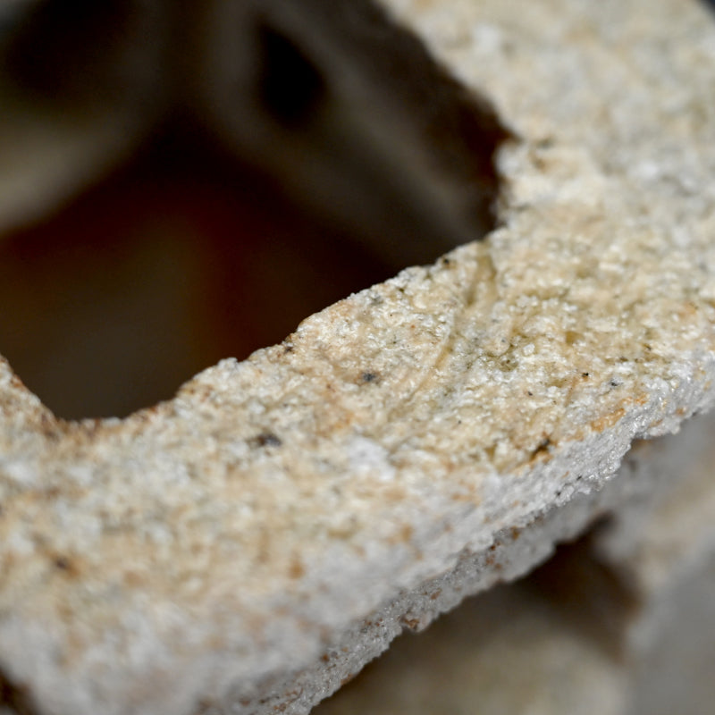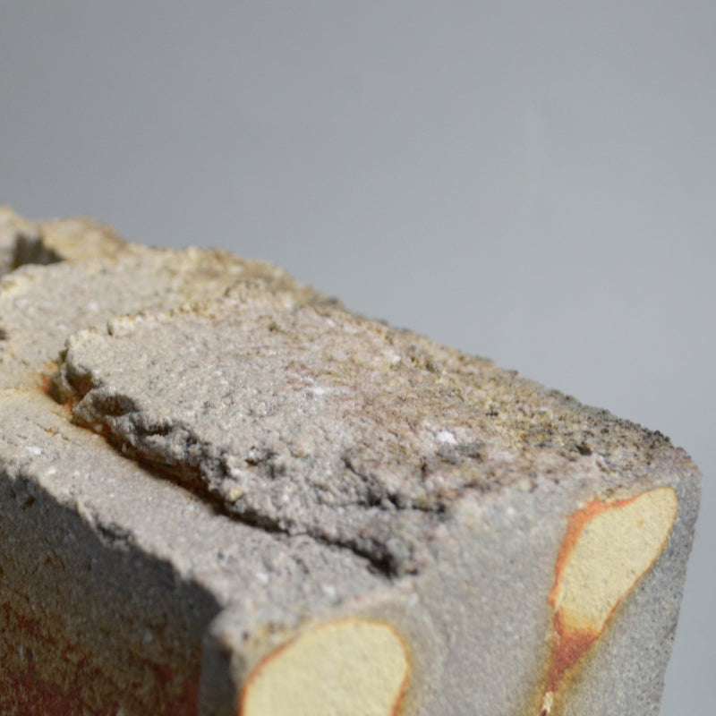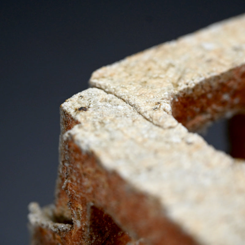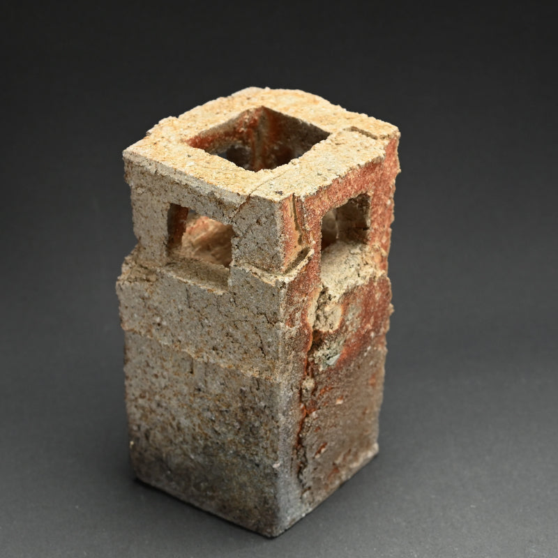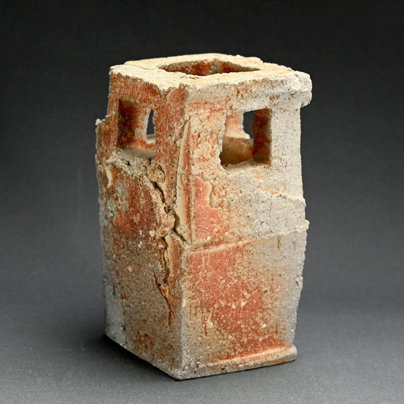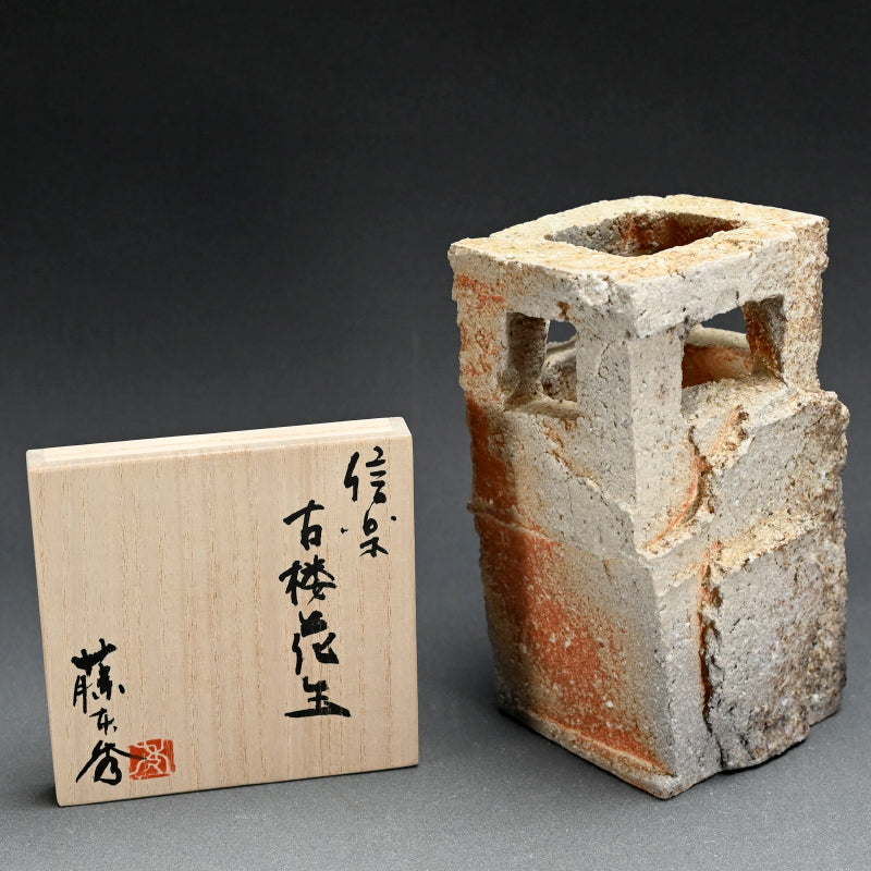 A rough architectural form like some faltering old concrete structure falling to degradation by Fujimoto Hide enclosed in the original signed wooden box titled Shigaraki Ko-ro Hanaike (Two Storied Structural Vase). It is 12.5 cm (5 inches) square, 22.5 cm (9 inches) tall and in perfect condition, directly from the artist.