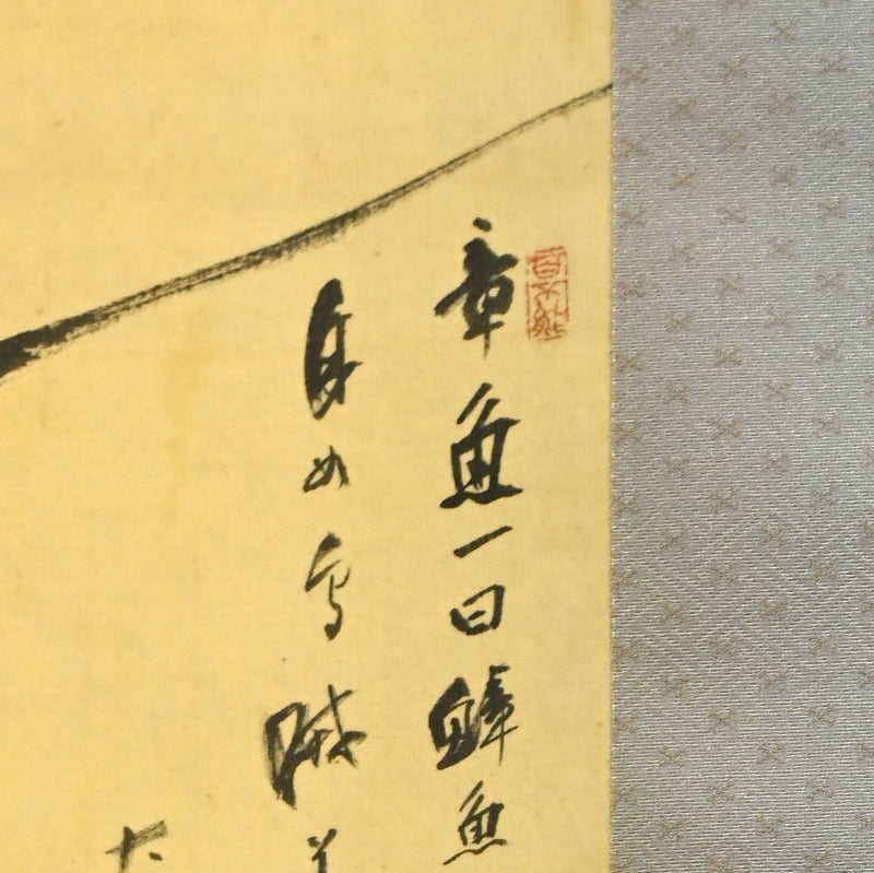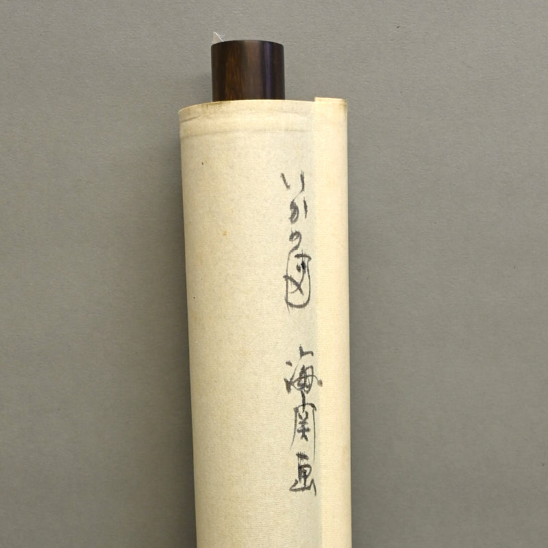 A playful painting of squid hanging to dry in the sun dated 1918 by Hashimoto Kaikan enclosed in a modern wooden box titled Ika Hoshi Zu.  The painting is performed with pigment on silk, completely restored in patterned silk reflecting the original and featuring ebony rollers.  It is 54 x 195.8 cm (inches) and in excellent condition.