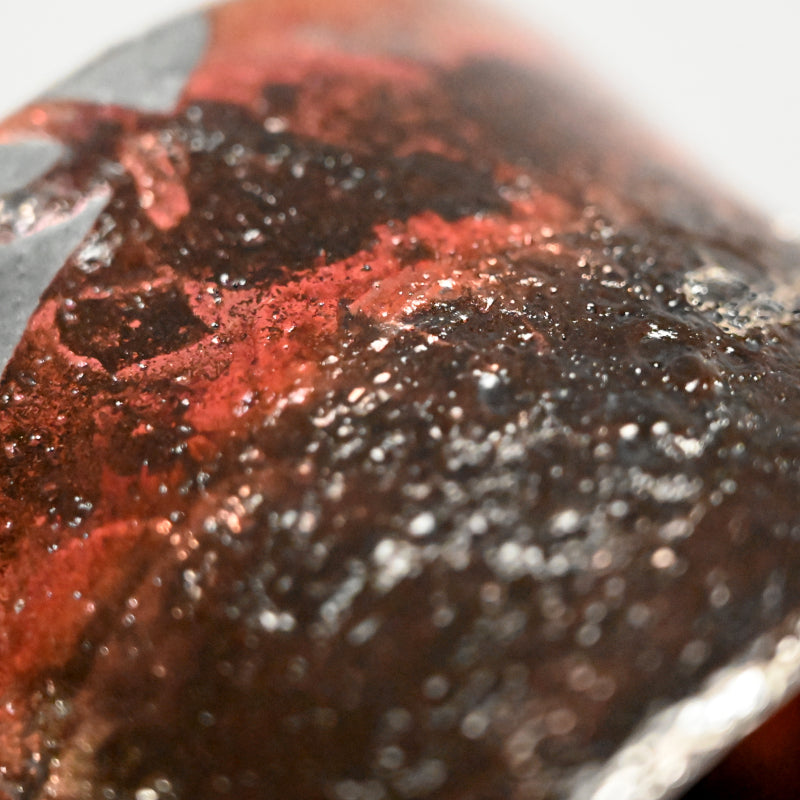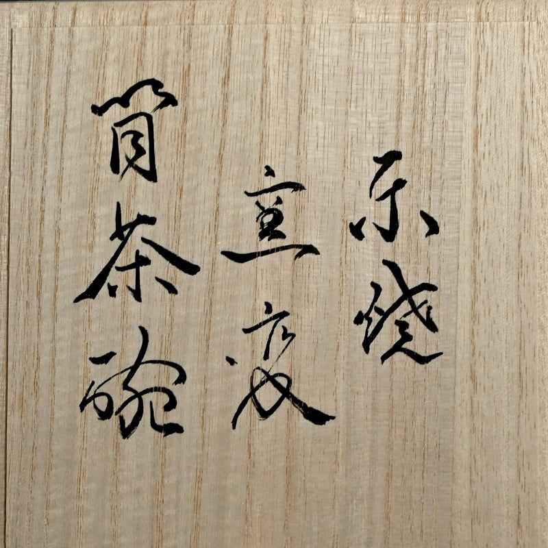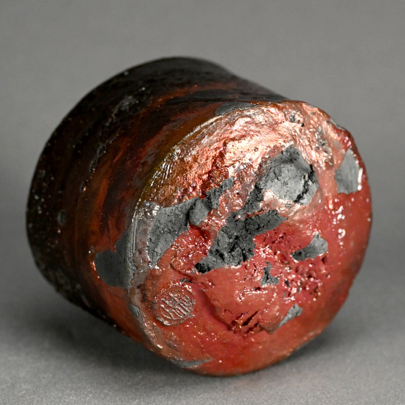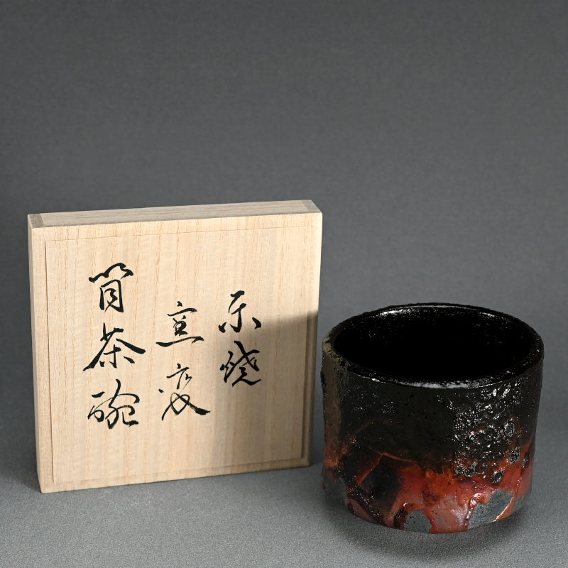 Gaseous red galactic clouds shimmer on the surface both inside and out of this stellar Balck Raku Tea Bowl by Hashimoto Tomonari enclosed in the original signed wooden box titled Raku-yaki Yohen Tsutsu Chawan. It is 11.5 cm (4-1/2 inches) diameter 10 cm (4 inches) tall and in excellent condition.