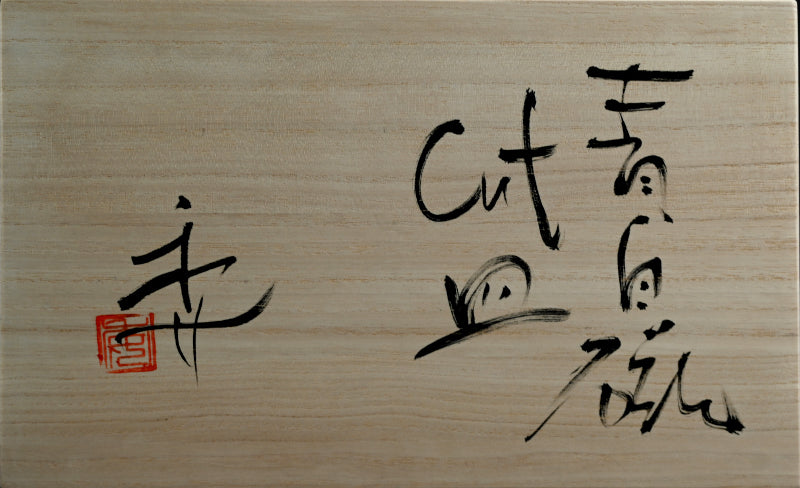 A kuwa-formed (hoe-shaped) porcelain plate cut from an elongated slab of sheer white porcelain covered in crackled Icy blue by Kato Tsubusa enclosed in the original signed wooden box titled Seihakuji Cut Sara. It is 32 x 18.5 x 7 cm (13 x 7-1/2 x 3 inches) and is in excellent condition, directly from the artist this summer.