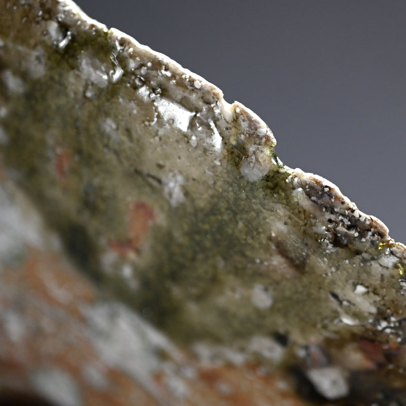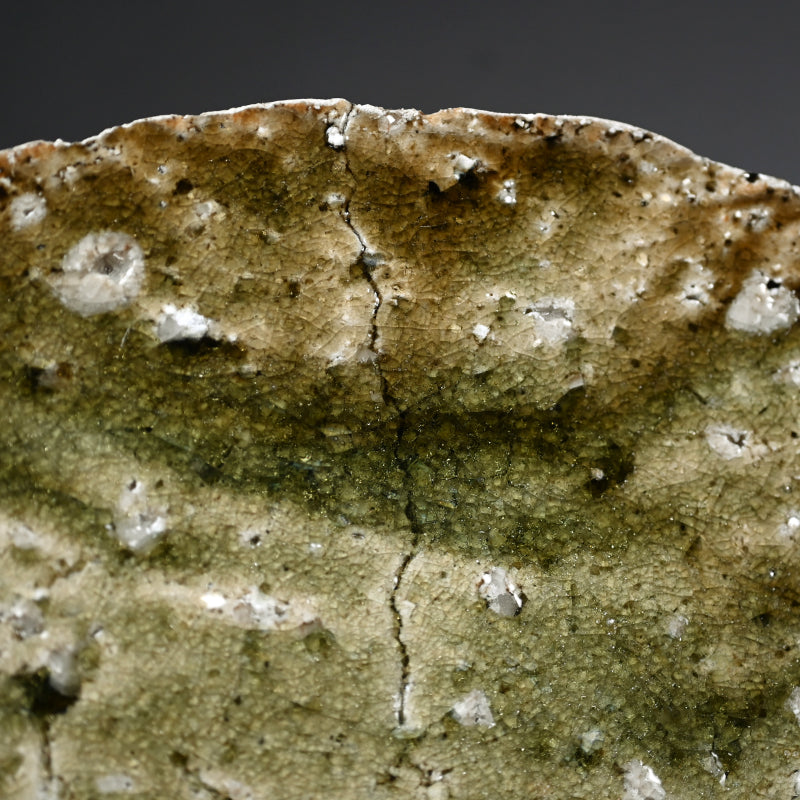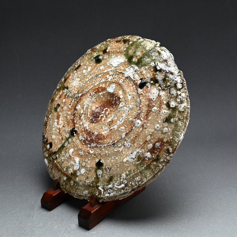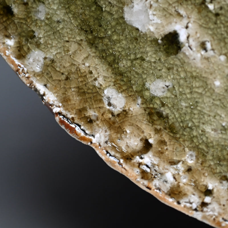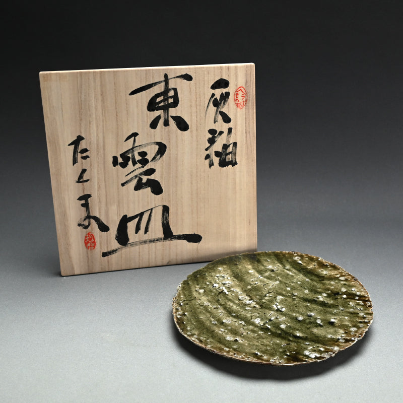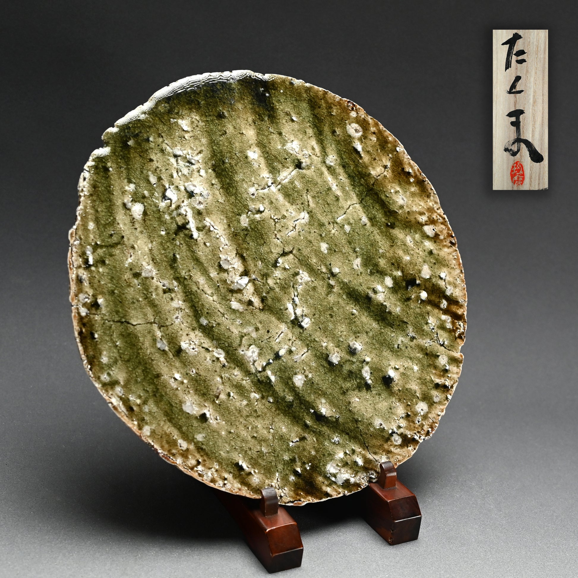 Sweeping arcs filled with liquified green ash cross this large flat platter by Murakoshi Takuma enclosed in the original signed wooden box titled Hai-yu Shinonome Sara. Shinonome is written East Cloud, and is a poetic term for Dawn, or clouds wavering in the early light of Dawn. Here he has brought the rim out to a razors edge, no easy feat for this rough clay. The vessel is 31 cm (over 12 inches) diameter and in perfect condition. We have the only two the artist ever made, and he said they were so difficult he will not make them again.