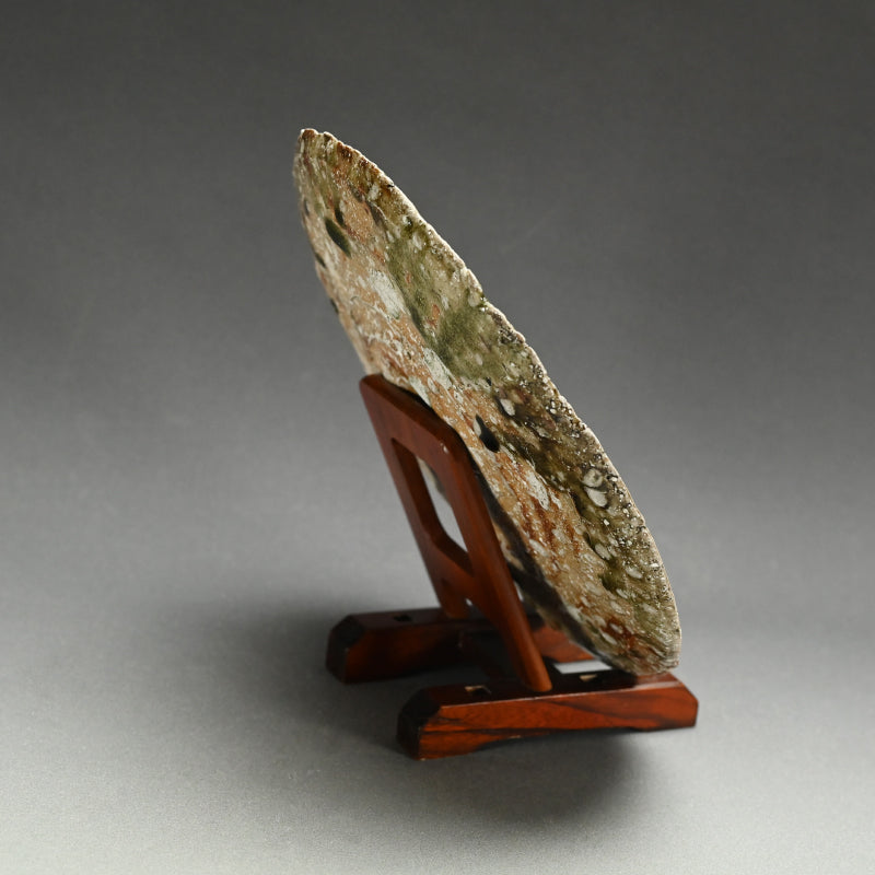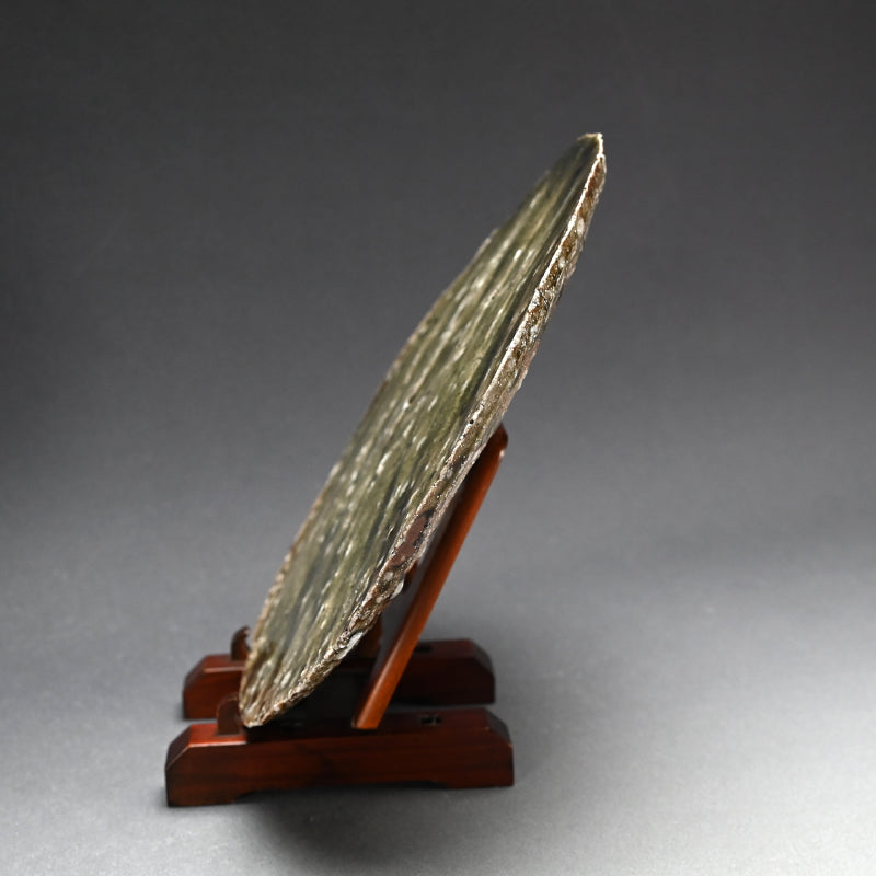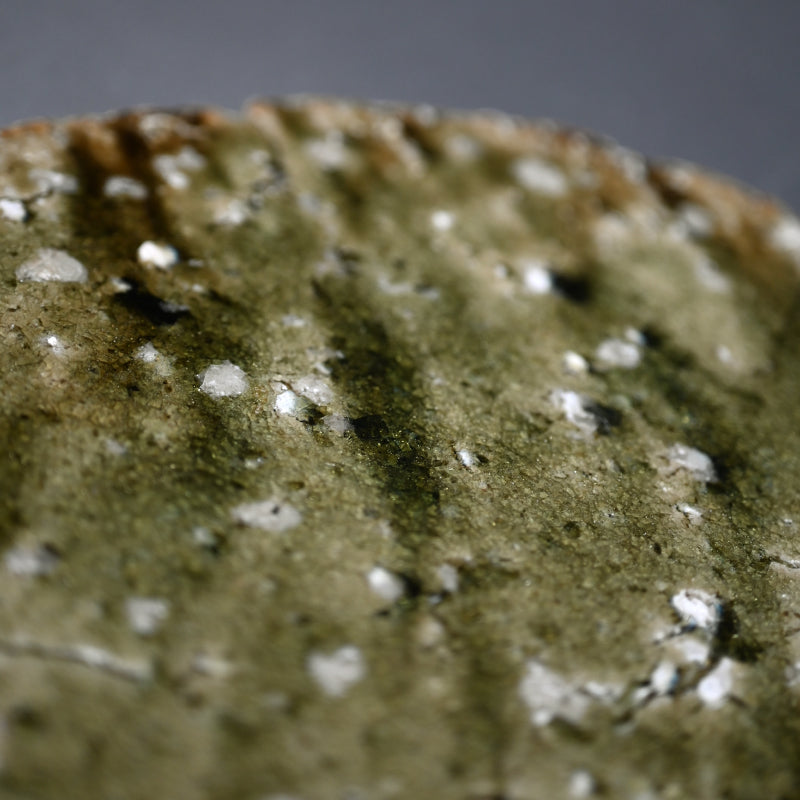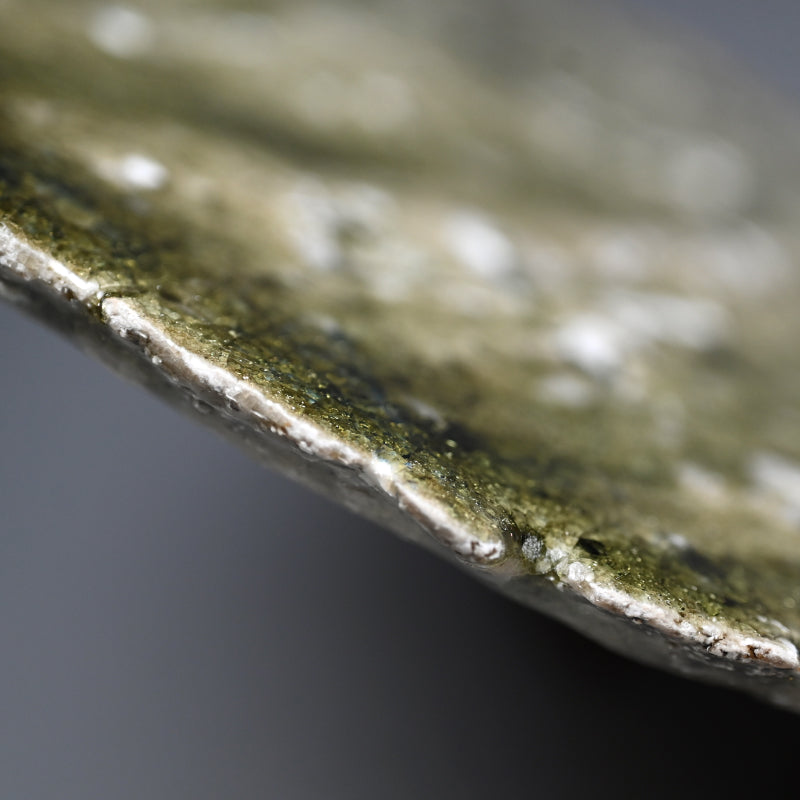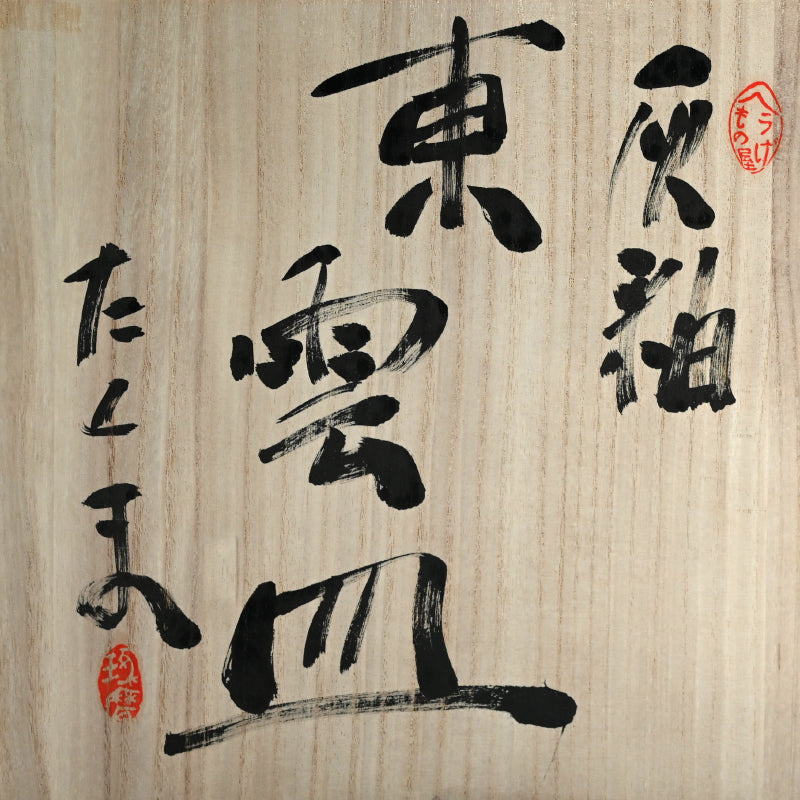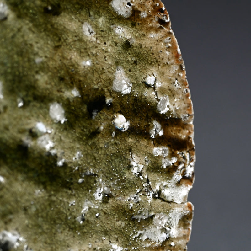 Sweeping arcs filled with liquified green ash cross this large flat platter by Murakoshi Takuma enclosed in the original signed wooden box titled Hai-yu Shinonome Sara. Shinonome is written East Cloud, and is a poetic term for Dawn, or clouds wavering in the early light of Dawn. Here he has brought the rim out to a razors edge, no easy feat for this rough clay. The vessel is 31 cm (over 12 inches) diameter and in perfect condition. We have the only two the artist ever made, and he said they were so difficult he will not make them again.