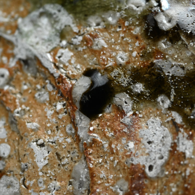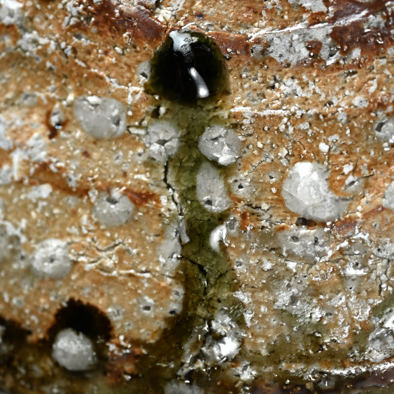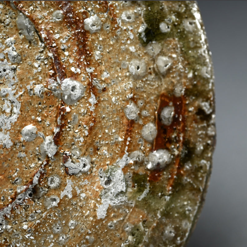 Murakoshi Takuma is one of those enigmas who simply lives to work with clay. He does not seek to make a living through pottery, but through his primal approach has earned a following which keeps his work in high demand. He was born in Aichi prefecture in 1954 and began his stroll down the pottery path in 1980 under the tutelage of Kyoto potter Umehara Takehira. Favoring very rough Shigaraki glaze, he established his own kiln in 1997 in the Kiyomizu pottery district of Kyoto, then moved to Nagaoka in 2002. Although eschewing the world of competitive exhibitions, he has been picked up by many of Japan’s preeminent galleries, including private exhibitions at the prestigious Kuroda Toen of Tokyo’s Ginza District
