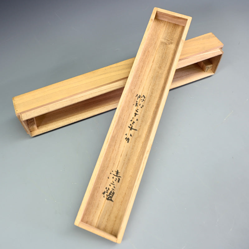 A bucolic scene in warm summer colors by Nomura Seiroku enclosed in the original signed wooden box titled Hirutani Senka (summer in Hirutani). Light color and ink on paper mounted in burnt amber paper with ceramic rollers. It is 43 x 147.5 cm (17 x 58 inches) and is in excellent condition.