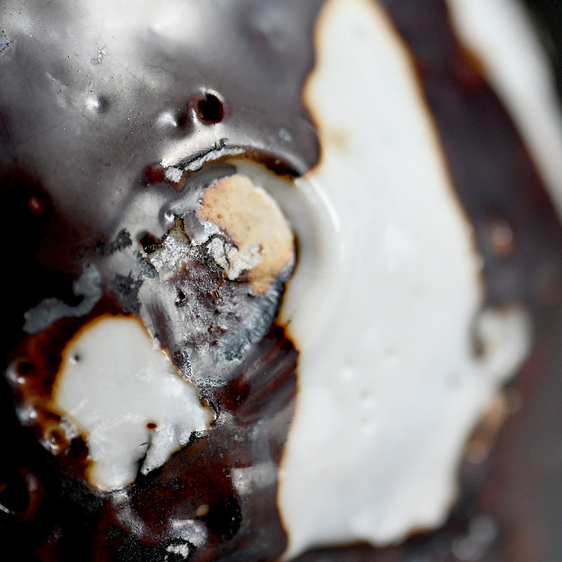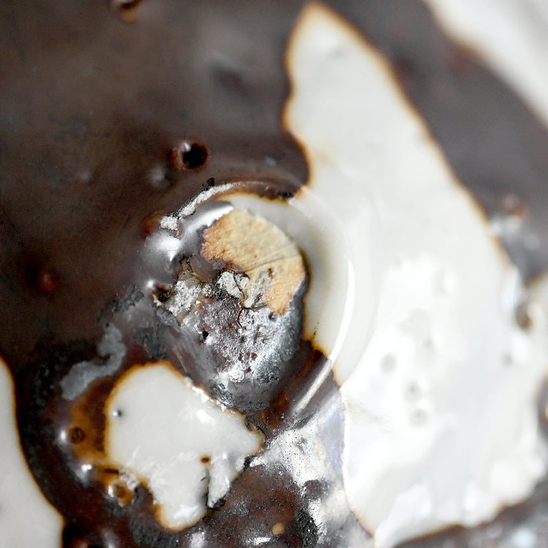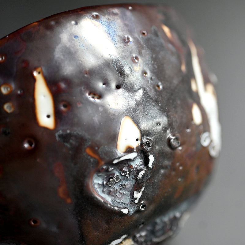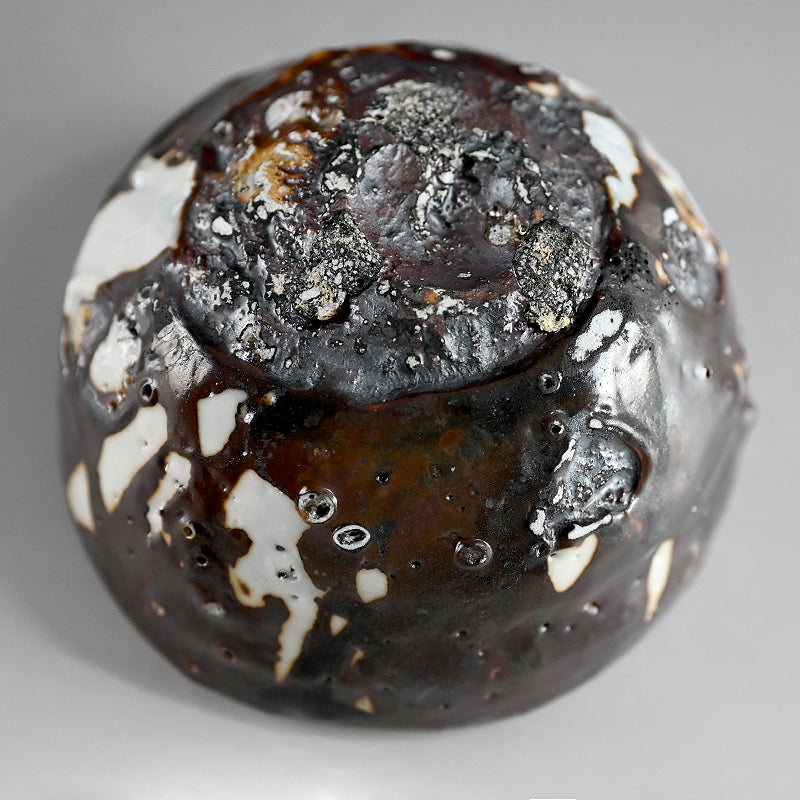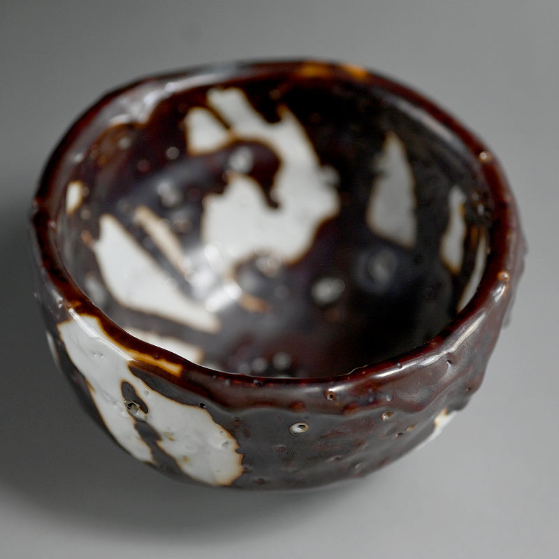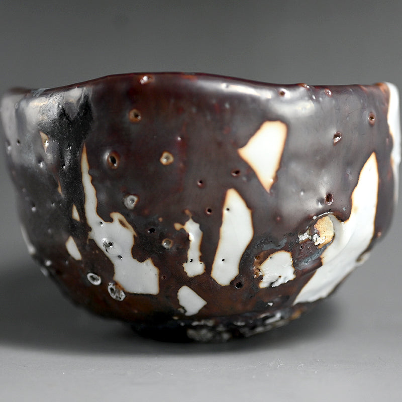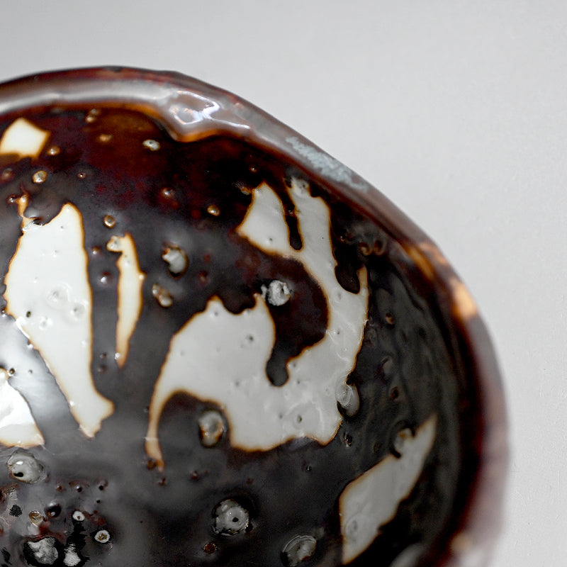 A unique, experimental work covered in thick pin-holed white glaze dripping with dark iron by Murakoshi Takuma enclosed in the original signed wooden box titled Tetsu-yu Chawan. This is the only bowl in this pattern he has ever made, entirely one of a kind. It is 13 cm (5-1/4 inches) diameter, 8 cm (3-1/4 inches) tall and is in perfect condition, directly from the artist.